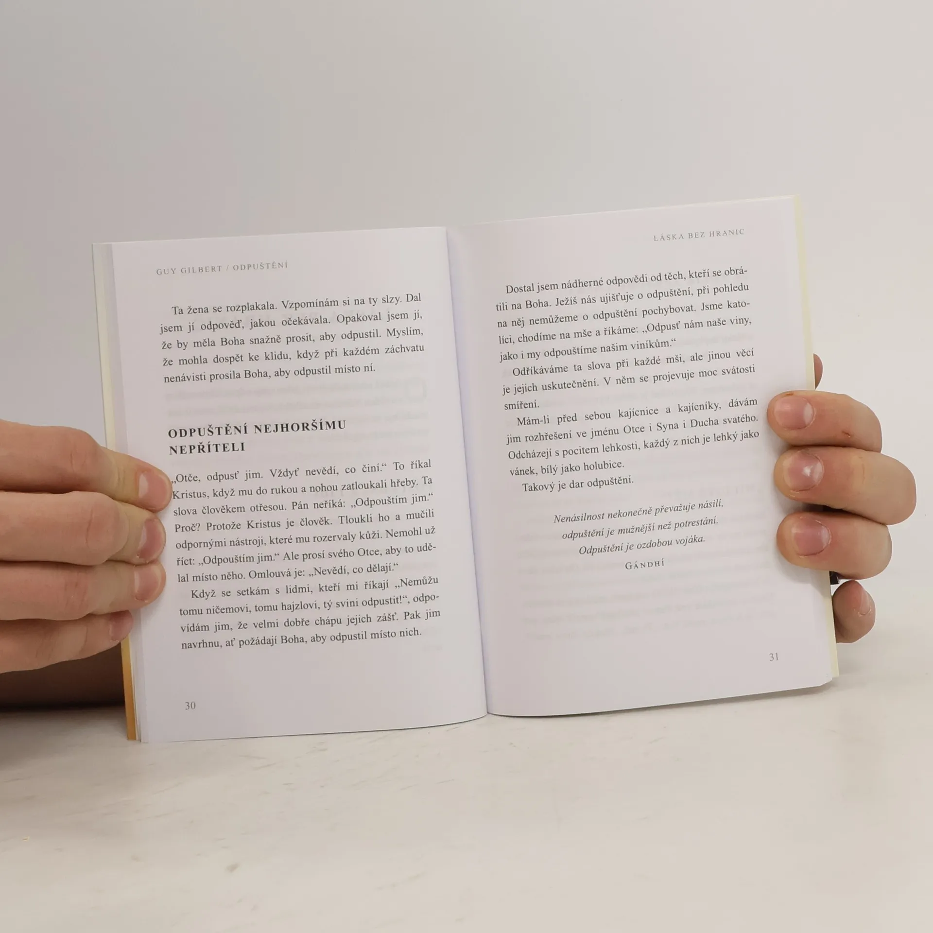 Kniha známého kněze a vychovatele delikventní mládeže přibližuje mimořádné důležité téma odpuštění, které je nejkrásnější cestou ke svobodě. Gilbert skrze svou bohatou zkušenost s lidmi z okraje společnosti, zločinci či vězni nijak nebagatelizuje zlo a příkoří, která se lidem dějí. Přesto potvrzuje, že jen cesta odpuštění vede k vnitřní vyrovnanosti, pokoji a radosti. Právě křesťané jsou pro něj ti, kteří mají ve společnosti neustále realizovat obtížný pokyn odpouštět, a to i tam, kde je to zdánlivě nemožné. Gilbert ukazuje, kde hledat zdroj síly k odpuštění, jak odpouštět v rodině, ve vztazích, jaké nástroje nabízí ve svátostech církev. Jak píše: „Kristus nikdy neřekl svým katům: ‚Odpouštím vám‘, ale: ‚Otče, odpusť jim.‘ Jen tak je totiž možné najít sílu k odpuštění. Nejde totiž o skutek naší vůle, je to akt lásky, který nám může vdechnout jen sám Bůh.“ Guy Gilbert je francouzský kněz, v Portále vyšla celá řada jeho úspěšných knih, naposledy např. Rodina, Čas žít nebo Víra.