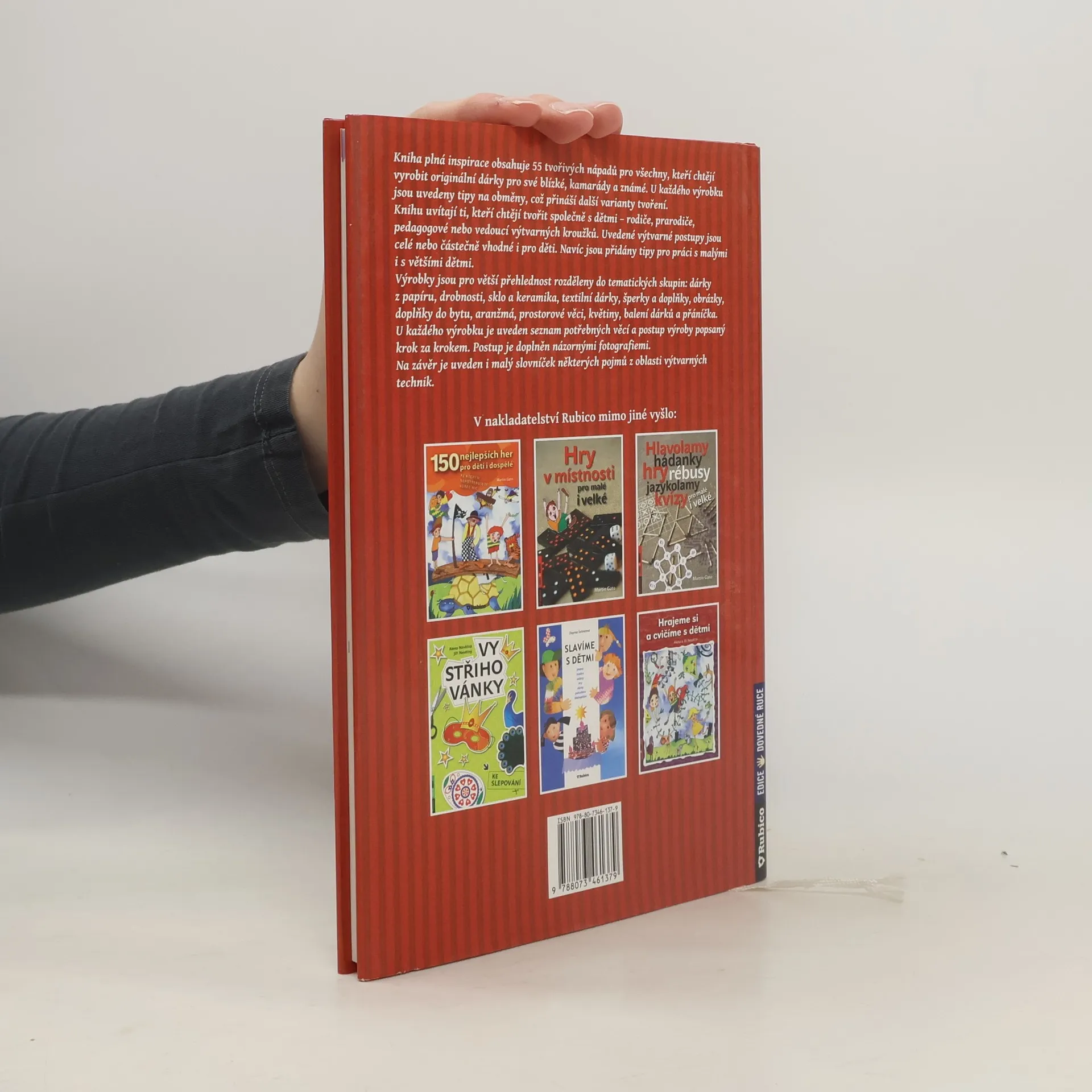 Kniha plná inspirace obsahuje 55 tvořivých nápadů pro všechny, kteří chtějí vyrobit originální dárky pro své blízké, kamarády a známé. U každého výrobku jsou uvedeny tipy na obměny, což přináší další varianty tvoření. Knihu uvítají ti, kteří chtějí tvořit společně s dětmi – rodiče, prarodiče, pedagogové nebo vedoucí výtvarných kroužků. Uvedené výtvarné postupy jsou celé nebo částečně vhodné i pro děti. Navíc jsou přidány tipy pro práci s malými i s většími dětmi. Výrobky jsou pro větší přehlednost rozděleny do tematických skupin: dárky z papíru, drobnosti, sklo a keramika, textilní dárky, šperky a doplňky, obrázky, doplňky do bytu, aranžmá, prostorové věci, květiny, balení dárků a přáníčka. U každého výrobku je uveden seznam potřebných věcí a postup výroby popsaný krok za krokem. Postup je doplněn názornými fotografiemi. Na závěr je uveden i malý slovníček některých pojmů z oblasti výtvarných technik.