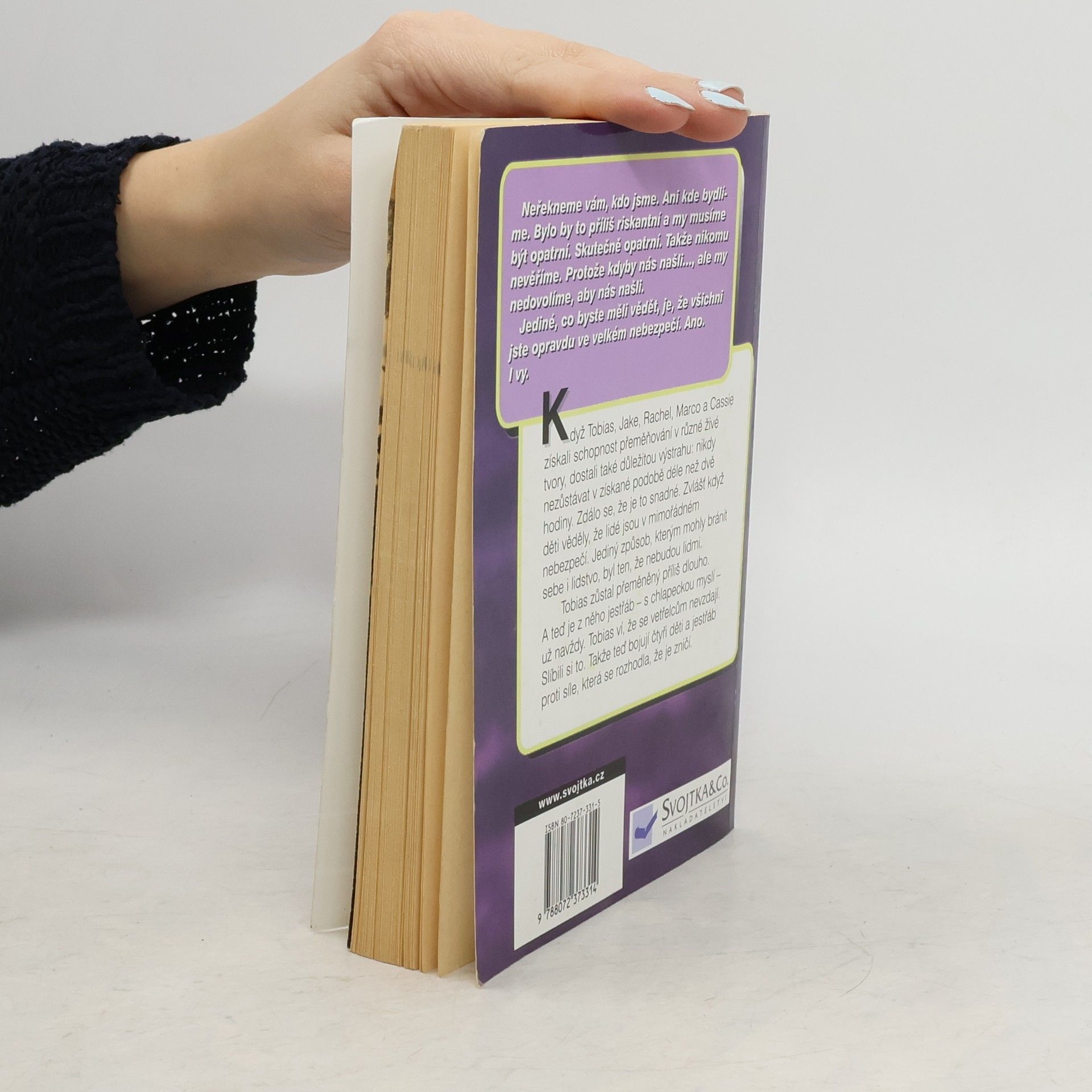 Neřekneme vám, kdo jsme. Ani kde bydlíme. Bylo by to příliš riskantní a my musíme být opatrní. Skutečně opatrní. Takže nikomu nevěříme. Protože kdyby nás našli..., ale my nedovolíme, aby nás našli. Jediné, co byste měli vědět, je, že všichni jste opravdu ve velkém nebezpečí. Ano. I vy. Když Tobias, Jake, Rachel, Marco a Cassie získali schopnost přeměňování v různé živé tory, dostali také důležitou výstrahu: nikdy nezůstávat v získané podobě déle než dvě hodiny. Zdálo se, že je to snadné. Zvlášť když děti věděly, že lidé jsou v mimořádném nebezpečí. Jediný způsob, kterým mohly bránit sebe i lidstvo, byl te, že nebudou lidmi. Tobias zůstal přeměněný příliš dlouho. A teď je z něho jestřáb - s chlapeckou myslí - už navždy. Tobias ví, že se vetřelcům nevzdají. Slíbili si to. Takže teď bojují čtyři děti a jestřáb proti síle, která se rozhodla, že je zničí.