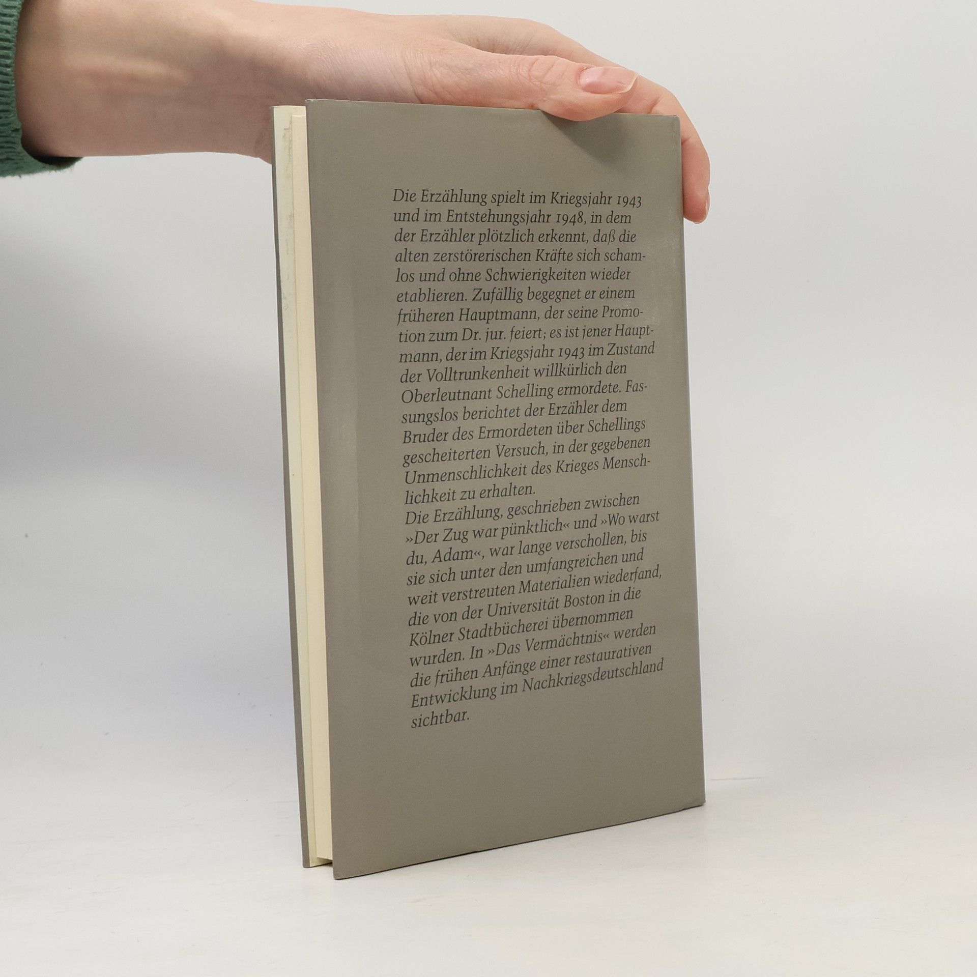 Wenn Menschenwürde Gewalt unterliegt. »Hinreißend kurzweilig, dabei ohne jede Effekthascherei, kann er die lähmende Langeweile des dösenden Soldatenalltags beschreiben.« Joachim Kaiser in der ›Süddeutschen Zeitung‹ Drei Jahre nach Kriegsende gilt Oberleutnant Schelling immer noch als »vermißt«. Doch es gibt Zeugen für seinen Tod: den früheren Hauptmann Schnecker, der soeben seine Promotion zum Dr. jur. feiert, und Wenk, den Chronisten der Ereignisse. Und so kommt endlich zur Sprache, was im Sommer 1943 in der Normandie und später in Rußland tatsächlich geschehen ist …