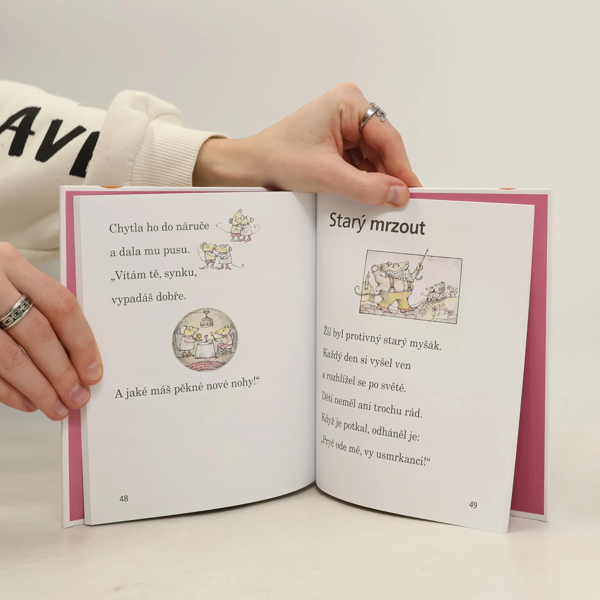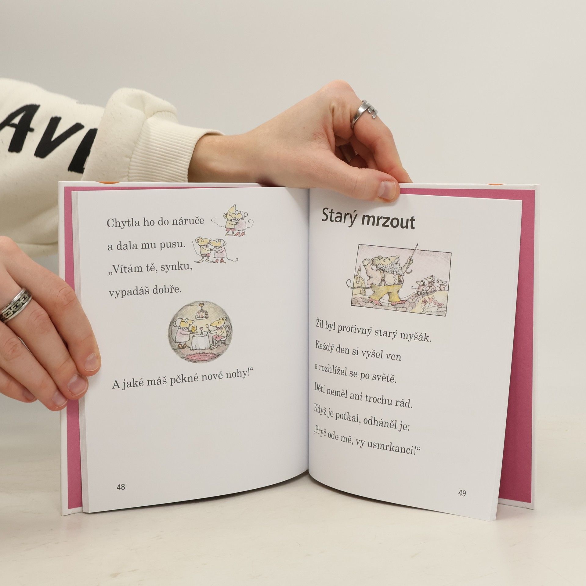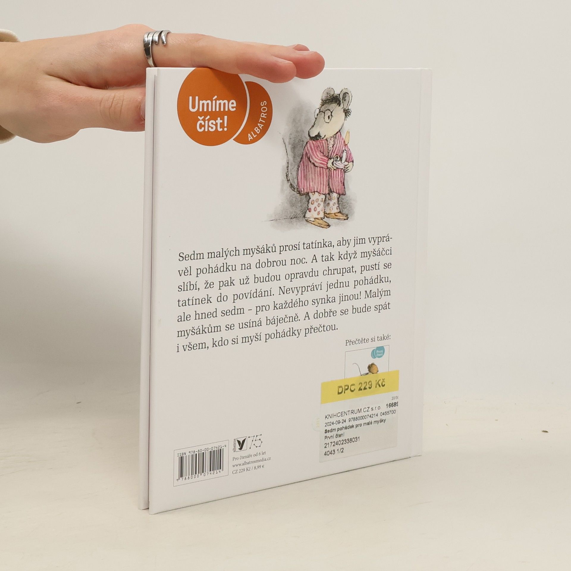 Sedm malých myšáků prosí tatínka, aby jim vyprávěl hezkou pohádku na dobrou noc. A když myšáčci slíbí, že pak už budou opravdu chrupat, pustí se tatínek do povídání. A vypráví ne jednu pohádku, ale hned sedm – každý myšák bude mít svou! Ta první je o studně splněných přání, další o myšce a mracích, následuje příběh o velmi velkém myšákovi a velmi malém myšákovi, o myši a větru, výletě, koupeli, o starém mrzoutovi. Všechny pohádky jsou laskavé i veselé, a tak se myšáčkům báječně usíná...