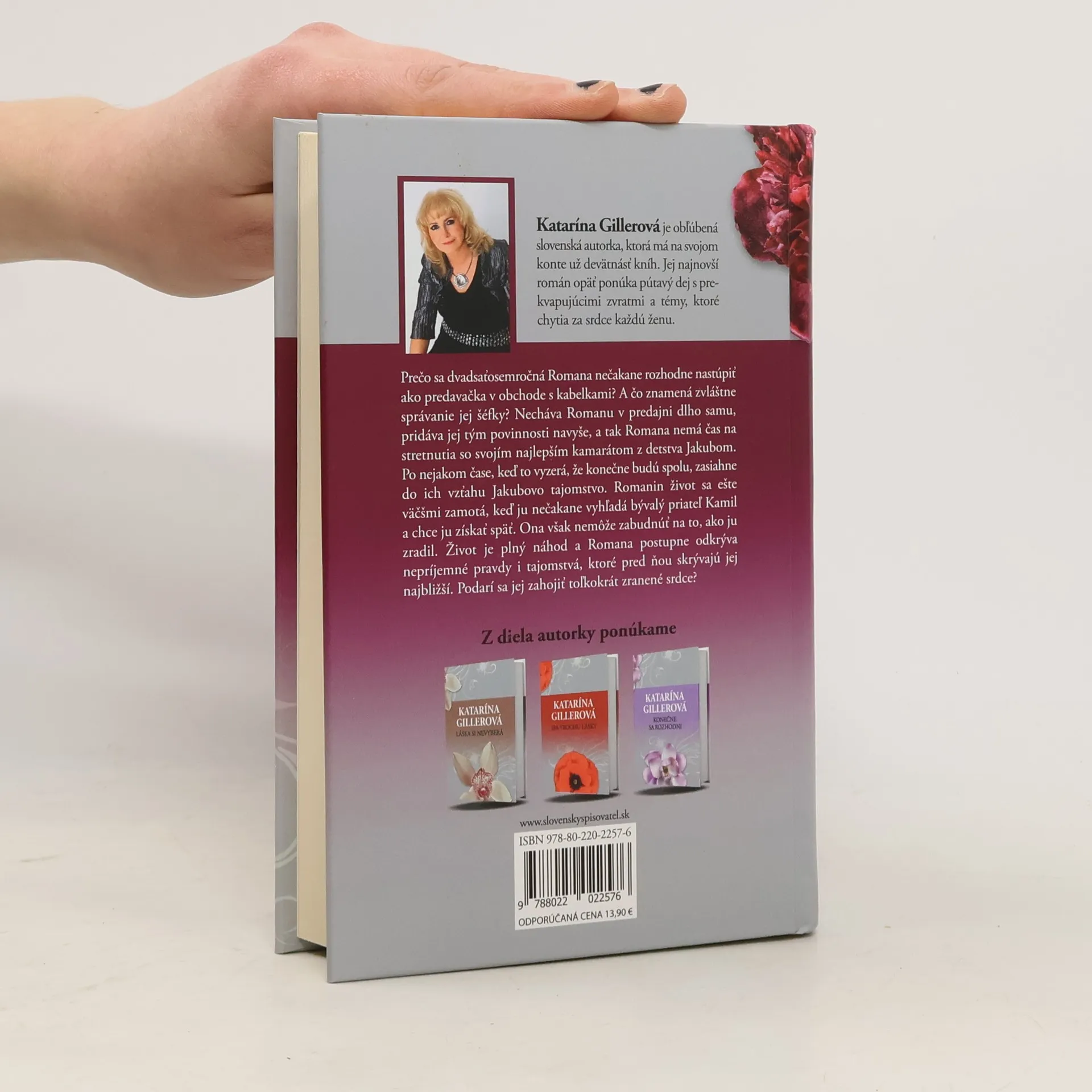 Katarína Gillerová je obľúbená slovenská autorka, ktorá má na svojom konte už devätnásť kníh. Jej najnovší román opäť ponúka pútavý dej s prekvapujúcimi zvratmi a témy, ktoré chytia za srdce každú ženu. Prečo sa Romana, absolventka vysokej školy, nečakane rozhodne nastúpiť ako predavačka v obchode s kabelkami? A čo znamená zvláštne správanie jej šéfky? Necháva Romanu v predajni dlho samu, pridáva jej tým povinnosti navyše, a tak Romana nemá čas na stretnutia so svojím najlepším kamarátom z detstva Jakubom. Po nejakom čase, keď to vyzerá, že konečne budú spolu, zasiahne do ich vzťahu Jakubovo tajomstvo. Romanin život sa ešte väčšmi zamotá, keď ju nečakane vyhľadá bývalý priateľ Kamil a chce ju získať späť. Ona však nemôže zabudnúť na to, ako ju zradil. Život je plný náhod a Romana postupne odkrýva nepríjemné pravdy i tajomstvá, ktoré pred ňou skrývajú jej najbližší. Podarí sa jej zahojiť toľkokrát zranené srdce?