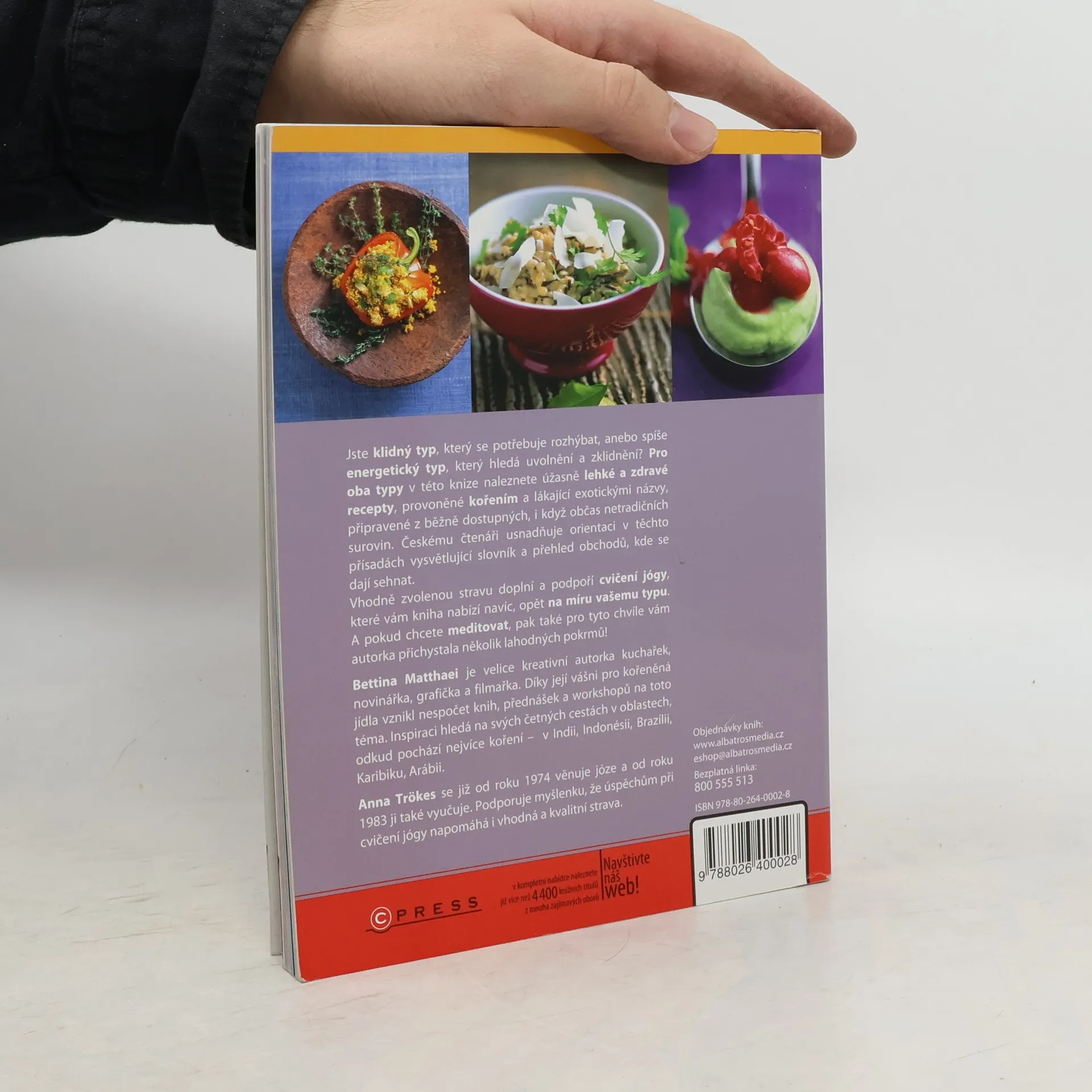Jste klidný typ, který se potřebuje rozhýbat, anebo spíše energetický typ, který hledá uvolnění a zklidnění? Pro oba typy v této knize naleznete úžasně lehké a zdravé recepty, provoněné kořením a lákající exotickými názvy, připravené z běžně dostupných, i když občas netradičních surovin. Českému čtenáři usnadňuje orientaci v těchto přísadách vysvětlující slovník a přehled obchodů, kde se dají sehnat. Vhodně zvolenou stravu doplní a podpoří cvičení jógy, které vám kniha nabízí navíc, opět na míru vašemu typu. A pokud chcete meditovat, pak také pro tyto chvíle vám autorka přichystala několik lahodných pokrmů! Bettina Matthaei je velice kreativní autorka kuchařek, novinářka, grafička a filmařka. Díky její vášni pro kořeněná jídla vznikl nespočet knih, přednášek a workshopů na toto téma. Inspiraci hledá na svých četných cestách v oblastech, odkud pochází nejvíce koření – v Indii, Indonésii, Brazílii, Karibiku, Arábii. Anna Trökes se již od roku 1974 věnuje józe a od roku 1983 ji také vyučuje. Podporuje myšlenku, že úspěchům při cvičení jógy napomáhá i vhodná a kvalitní strava.
