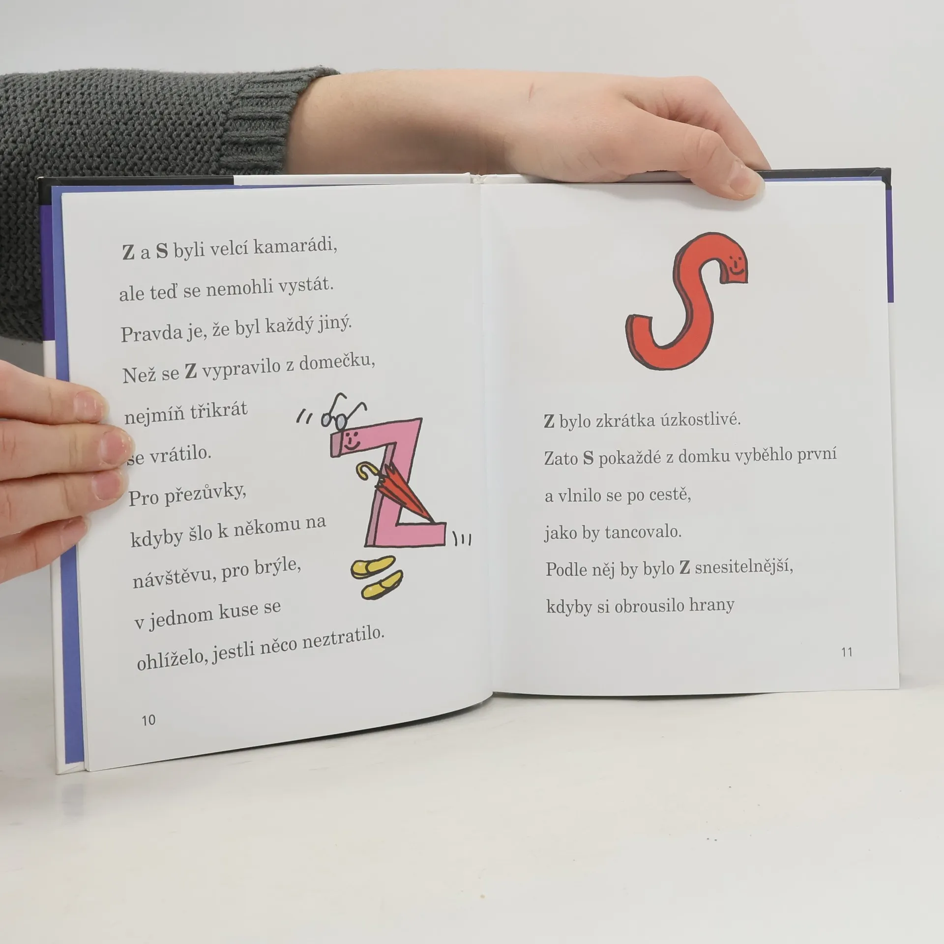 Písmenka S a Z bydlí v jednom domečku, ale někdy to mezi nimi skřípe. S se z každé povinnosti vykroutí a o kamarádovi Z říká, že by udělal lépe, kdyby si obrousil hrany. Přesto se nakonec vždycky usmíří, vždyť spoustu práce musejí dělat společně! Jednou A přivede k rybníku pana Antonína. Budou si s ním ostatní písmenka rozumět? A jak to dopadne, když se objeví strážník? Dál už ani slovo, přečtěte si to sami. Stačí otevřít knížku – je plná písmenek!