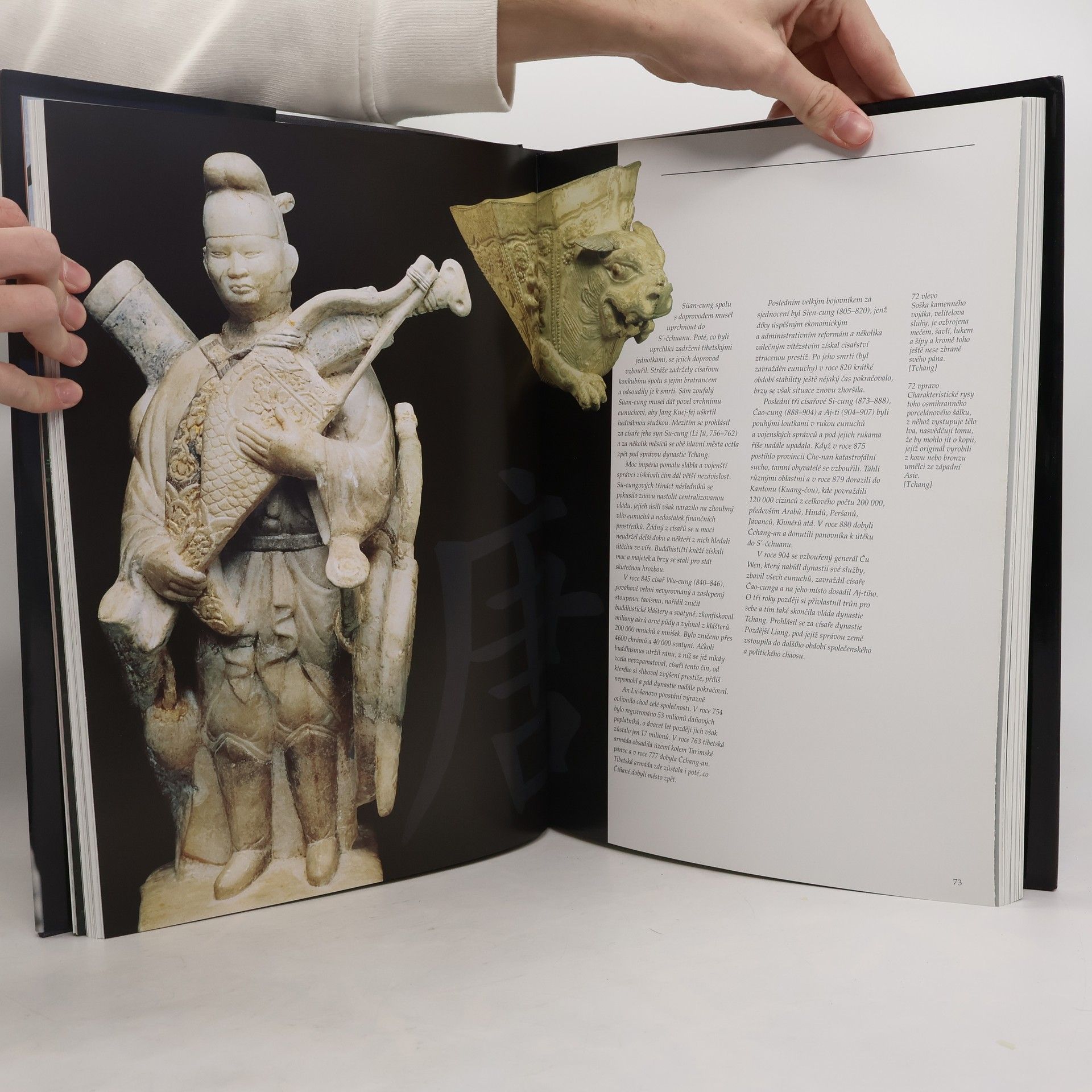 Starověká Čína, kolébka Asie, se pyšní nádherou a dokonalostí, které byly potvrzeny až v minulém století díky překvapivým archeologickým objevům. Kniha Maurizia Scarpariho, doplněná více než 400 ilustracemi, mapuje fascinující historii čínské civilizace od neolitu (8500-1700 př. n. l.) přes bronzovou dobu a tři předcísařské dynastie (Sia, Šang a Čou) až po vznik Císařství s dynastií Čchin a jejím vrcholem během dynastií Chan a Tchang. Kniha se zaměřuje na běžný život čínské společnosti, náboženské a politické otázky, rodinnou etiku, zábavu a vedení válek, přičemž klade důraz na umění. Popisuje výrobu vzácných předmětů z nefritu, kovu, keramiky, lakovaných výrobků, obrazů a dalších materiálů. Čtenář se vydá na prohlídku významných archeologických nalezišť, jako jsou hrobky šlechty s bohatými nálezy, včetně lakovaných výrobků, šperků a obřadních bronzových nádob. Navštíví mauzoleum Prvního císaře Čchin Š´-chuang-tiho s jeho hliněnou armádou a krásné buddhistické skalní chrámy, které uměním vyjadřují víru čínského národa.