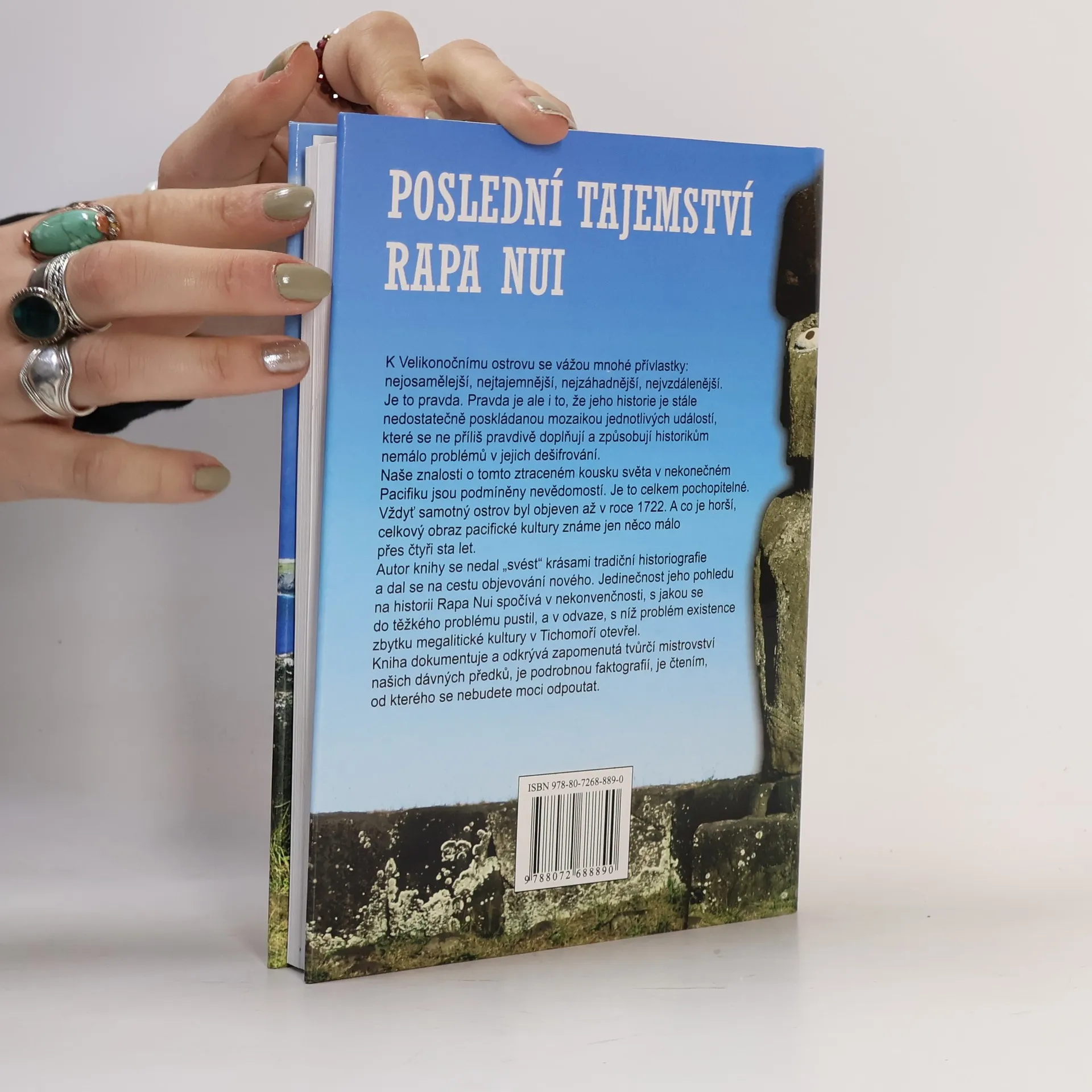 Velikonočnímu ostrovu se vážou mnohé přívlastky: nejosamělejší, nejtajemnější, nejzáhadnější, nejvzdálenější. Je to pravda. Pravda je ale i to, že jeho historie je stále nedostatečně poskládanou mozaikou jednotlivých událostí, které se ne příliš pravdivě doplňují a způsobují historikům nemálo problémů v jejich dešifrování. Naše znalosti o tomto ztraceném kousku světa v nekonečném Pacifiku jsou podmíněny nevědomostí. Je to celkem pochopitelné. Vždyť samotný ostrov byl objeven až v roce 1722. A co je horší, celkový obraz pacifické kultury známe jen něco málo přes čtyři sta let. Autor knihy se nedal „svést“ krásami tradiční historiografie a dal se na cestu objevování nového. Jedinečnost jeho pohledu na historii Rapa Nui spočívá v nekonvenčnosti, s jakou se do těžkého problému pustil, a v odvaze, s níž problém existence zbytku megalitické kultury v Tichomoří otevřel. Kniha dokumentuje a odkrývá zapomenutá tvůrčí mistrovství našich dávných předků, je podrobnou faktografií, je čtením, od kterého se nebudete moci odpoutat.