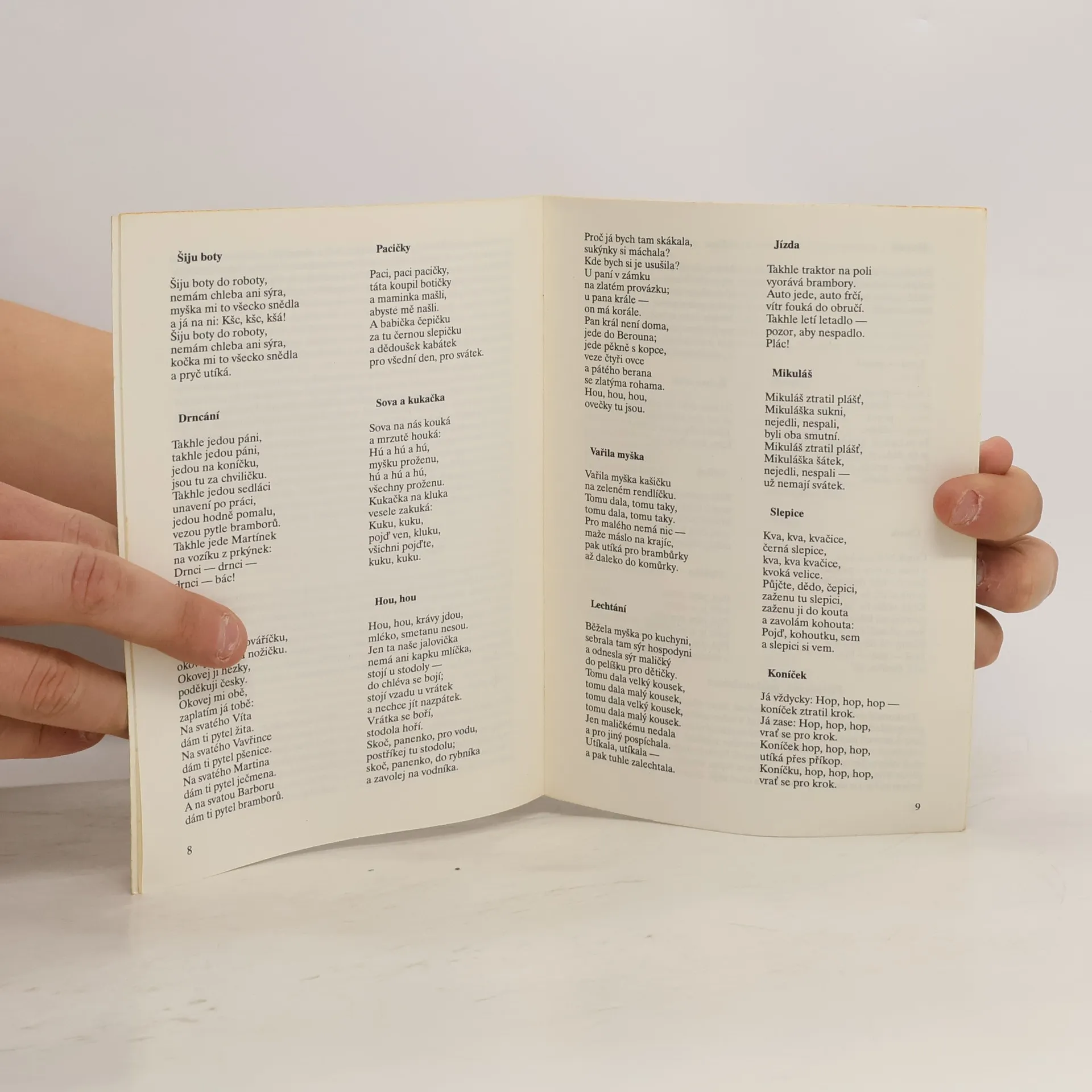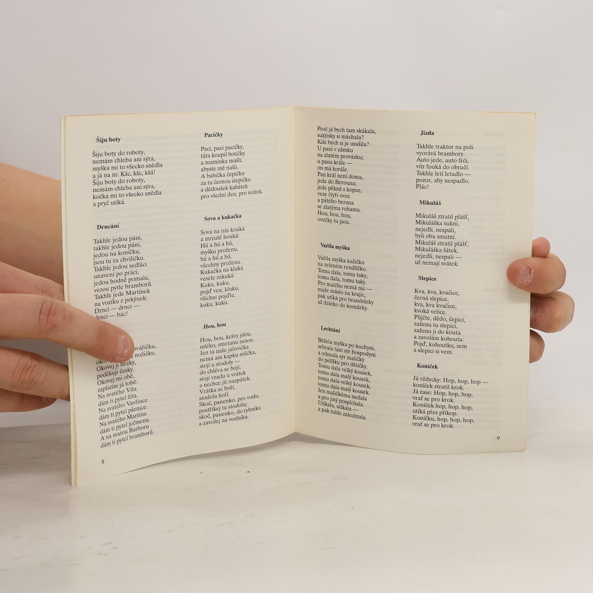Logopedické hříčky. Tato knížka seznamuje rodiče a učitelky předškolních zařízení s praktickými otázkami výchovy jazyka a řeči u malých dětí. Jsou v ní zastoupeny čtyři skupiny říkánek a veršovánek: verše spojované s jednoduchými řízenými pohyby dětských ruček, nohou i celého těla; verše podněcující dobrou výslovnost a sluchovou pozornost (fonematické vnímání); verše rozvíjející obratnost rukou (hry s prsty); verše podněcující grafickou činnost dětí (vytváření jednoduchých kreseb).