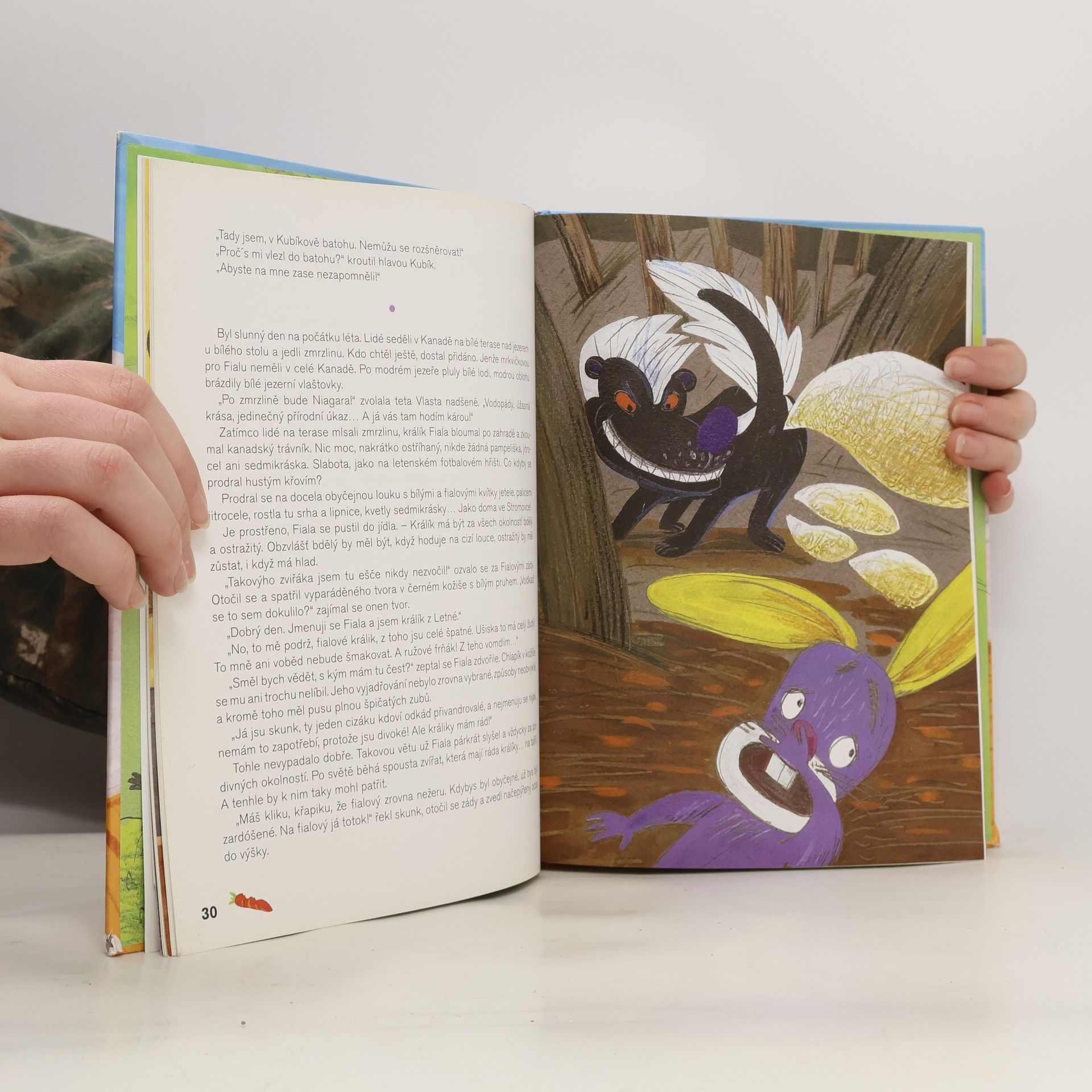Fiala je králík s fialovou barvou, žlutým vnitřkem uší a růžovým nosem! Bydlí se svými lidmi Marií, Maxmiliánem a Kubíkem, kmenem statečných Ma-Ma-Kuů, na pražské Letné. Nejlépe si pochutná na mrkvičkové zmrzlině a je přirozeně zvídavý, nesmírně kamarádský a velmi zcestovalý. Ještě že zná tetu Vlastu z Kanady, která se umí vyskytnout ve správný čas na správném místě a může Fialu vytáhnout z každé šlamastyky. Jinak by ho kozel ve Španělsku mohl věznit tak dlouho, dokud lidi z Letný nezacvakaj za roztomilýho fialovýho králíčka pěknou sumičku výkupnýho. Nebo co kdyby hloupí buvoli Ani-Ň, Ba-Ť a Leo-Š ztratili Fialu v rýžovém poli v Asii? A co teprve kdyby ho k svačině slupli alpská orlata Siegfried s Gunterem? To by se pak ani nemohl radovat z toho, jak rostou Stella s Toníčkem, malí špunti v rodině. A Ma-Ma-Kuům by se hrozně stýskalo...