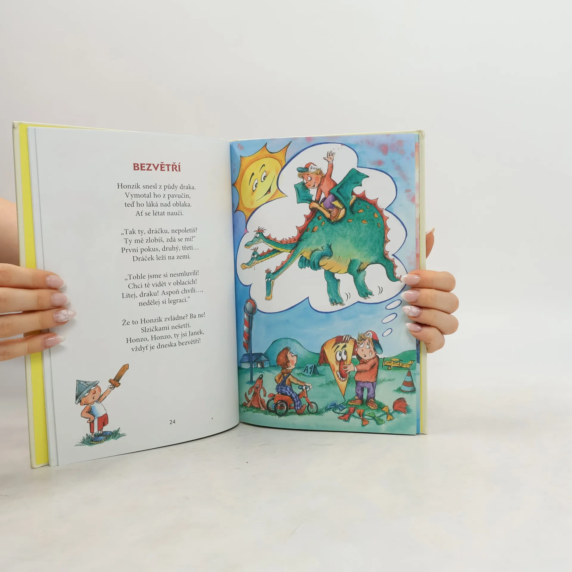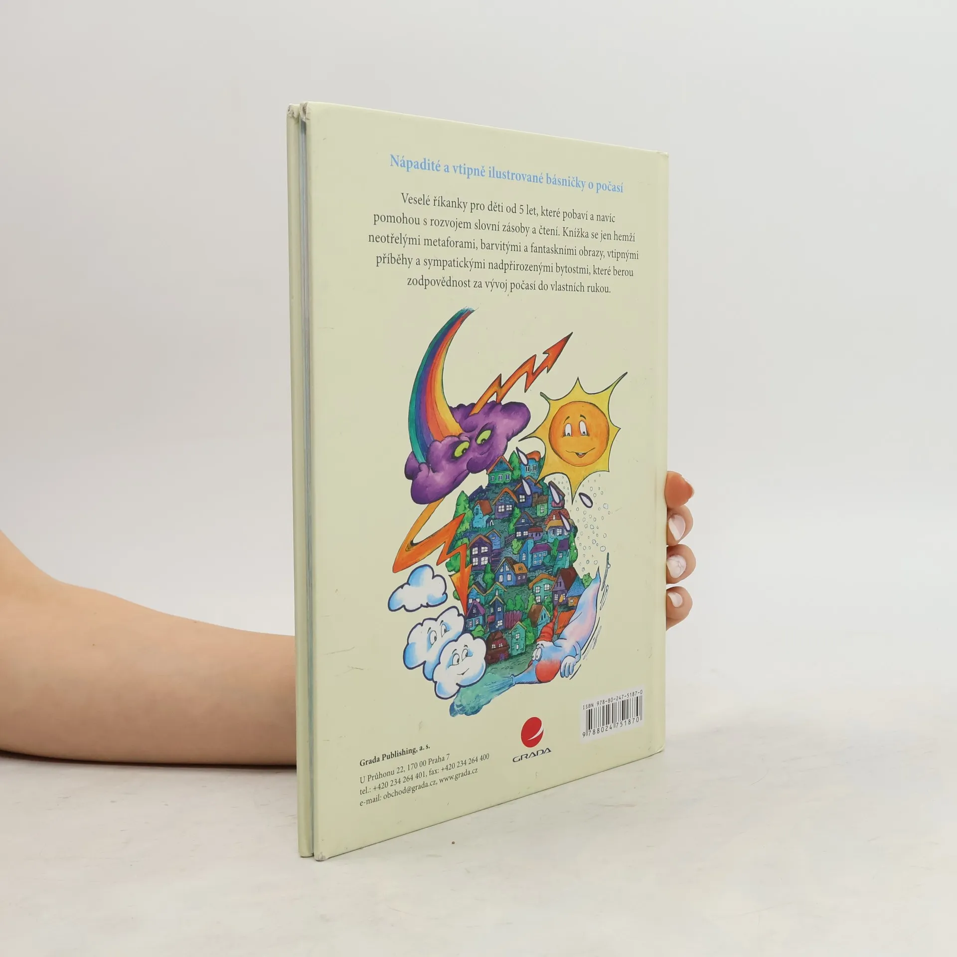 Jak si básní počasí. Básničky pro děti do 5 let nabízejí hravý a malebný pohled na všechny běžné povětrnostní jevy, s nimiž se malý čtenář v našem podnebném pásu může od jara do zimy setkat: JASNO, POLOJASNO, OBLAČNO, ZATAŽENO, DÉŠŤ, MŽENÍ, PŘEHÁŇKY, BOUŘKA, KROUPY, DUHA, BĚZVĚTŘÍ, VÁNEK, VÍTR, VICHR, ROSA, MLHA, JINOVATKA, DÉŠŤ SE SNĚHEM, SNĚHOVÉ KRUPKY, SNÍH, SNĚHOVÁ VÁNICE, MRÁZ, NÁLEDÍ, NÁMRAZA, KOLO U MĚSÍCE. Z každé básně a její ilustrace se dozvíme, jak konkrétní počasí vypadá, jak se projevuje, jak je prožívá příroda a jak se za takové povětrnostní situace většinou chovají lidé. Nejedná se však o vážnou meteorologickou exkurzi, naopak - hravost, poetická nadsázka a veselý nadhled mají vždy přednost před strohým popisným sdělením. Poetickou náladu dotvářejí celostránkové, výrazově bohaté, nápadité a vtipné ilustrace.
