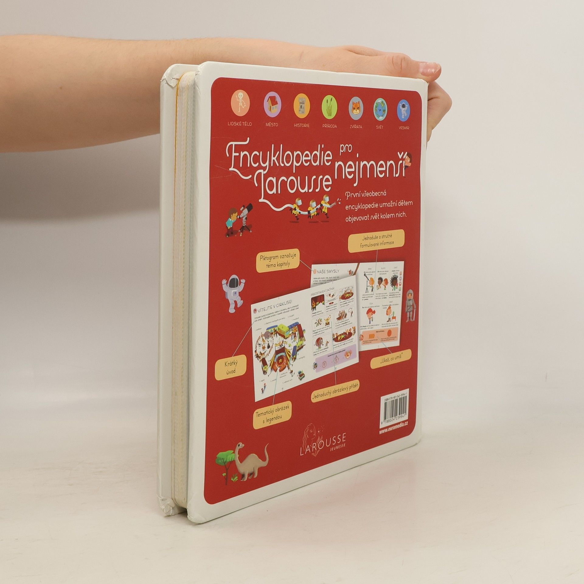Všeobecná encyklopedie, která umožní malým dětem objevovat svět, který je obklopuje. Tematicky je rozdělena do sedmi tematických okruhů: lidské tělo, město, historie, příroda, zvířata, svět a vesmír, a každé z nich představuje srozumitelným a přitažlivým způsobem, pomocí krátkých informativních textů, přehledných piktogramů a četných názorných obrázků. Tuto knihu budete číst s dětmi znovu a znovu.