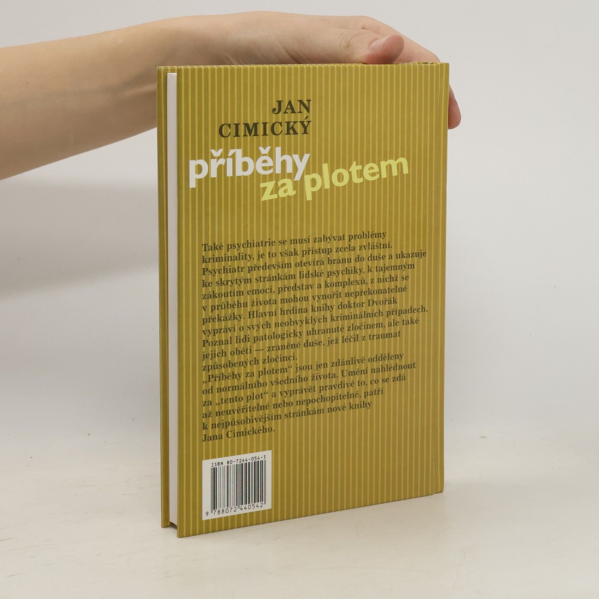 Také psychiatrie se musí zabývat problémy kriminality, je to však přístup zcela zvláštní. Psychiatr především otevírá bránu do duše a ukazuje ke skrytým stránkám lidské psychiky, k tajemným zákoutím emocí, představ a komplexů, z nichž se v průběhu života mohou vynořit nepřekonatelné překážky. Hlavní hrdina knihy doktor Dvořák vypráví o svých neobvyklých kriminálních případech. Poznal lidi patologicky uhranuté zločinem, ale také jejich oběti - zraněné duše, jež léčil z traumat způsobených zločinci. "Příběhy za plotem" jsou jen zdánlivě odděleny od normálního všedního života. Umění nahlédnout za tento plot a vyprávět pravdivě to, co se zdá až neuvěřitelné nebo nepochopitelné, patří k nejpůsobivějším stránkám knihy Jana Cimického.