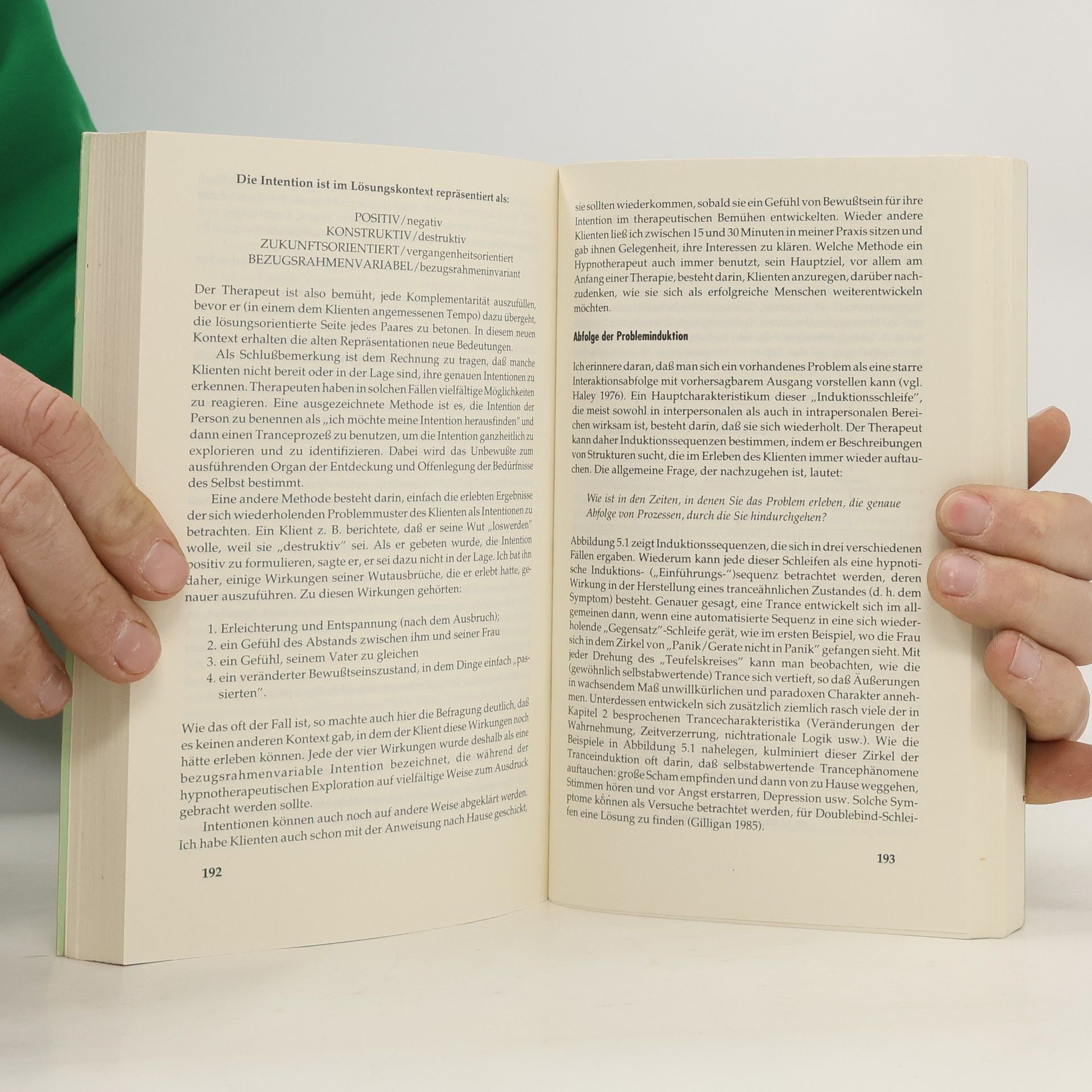 Dieses Buch befaßt sich zum Glück nicht damit, wie Milton Erickson es besser gemacht hätte. Obwohl das zentrale Thema die Ericksonsche Hypnoseinduktion ist, handelt es sich hier eigentlich um ein Handbuch zur psychotherapeutischen Veränderung — ein Buch, das Sie als Therpeut lehrt, Ihre Kommunikationsfähigkeit zu verbessern. Eines der Hauptprobleme jeder Therapie besteht darin, die Bereitschaft des Patienten zur Mitarbeit zu steigern. Häufig kommen Patienten zur Therapie, weil sie die Fähigkeit verloren haben, mit sich selbst und mit anderen für sie wichtigen Personen zu kooperieren. Sie verlieren sich in wiederkehrenden Mustern von eingeschränkter Wahl und finden die Spur zu inneren Fähigkeiten der Veränderung nicht mehr. Gilligan hilft uns zu verstehen, wie wir unkonventionelle therapeutische Kommunikation im allgemeinen und bei der Tranceinduktion im besonderen wirksam maßschneidern können. „Therapeutische Trance“ ist ein Manifest der Grundlagen der Ericksonschen Hypnotherapie, ihrer Prinzipien und Techniken. Es ist eine Frundgrube für praktische Ideen, und es regt Therapeuten an, bestimmte Fragen zu stellen und allgemeine therapeutische Ideen zu verfolgen. „In einer Zeit, in der Ericksonsche Methoden das Interesse an Hypnose neu geweckt haben, wird dieses Buch deren Entwicklung und Wachstum anregen.“ Jeffrey K. Zeig