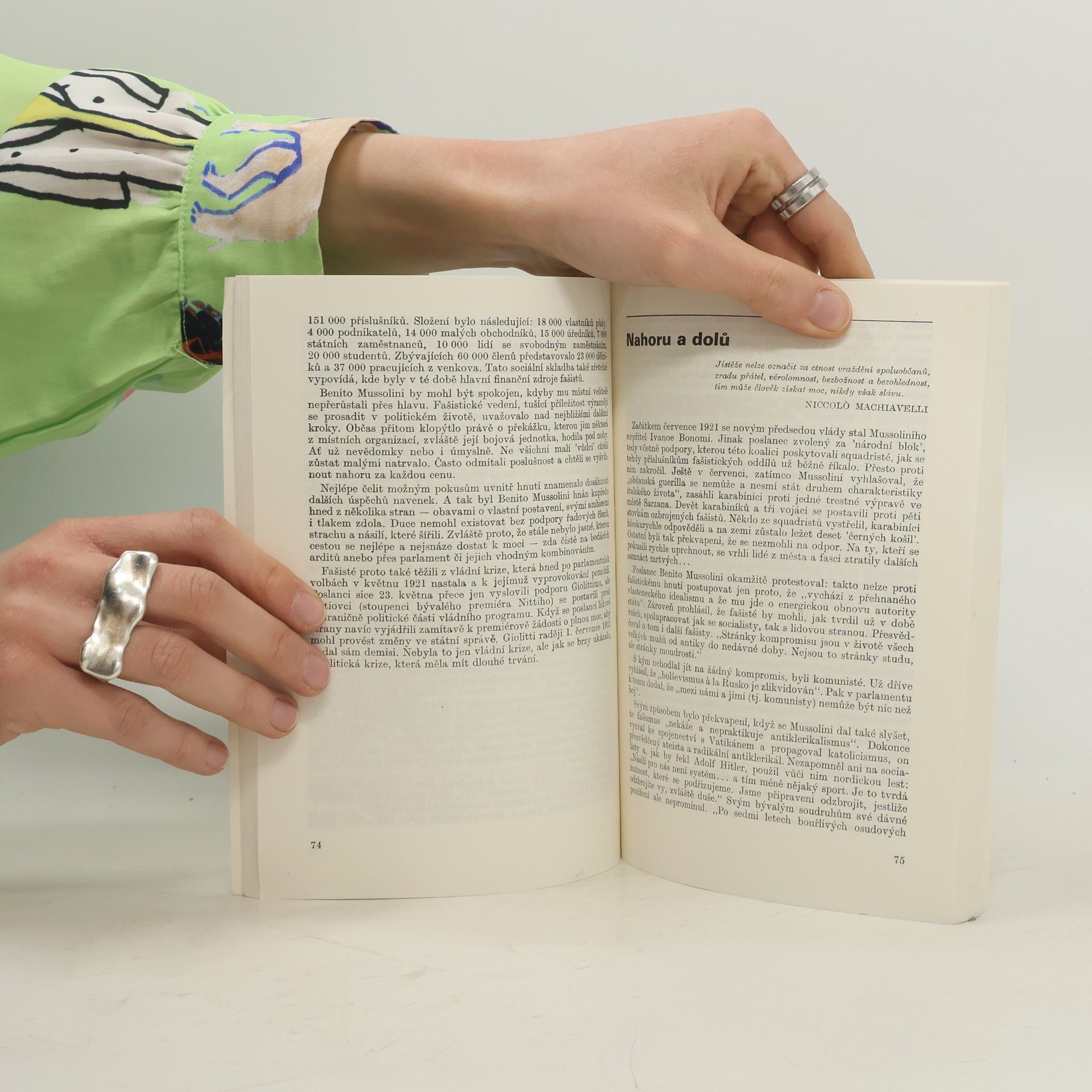 Poměrně útlá knížečka popisuje celý Mussoliniho život, od počátků jeho politické dráhy socialistického revolucionáře až po potupnou smrt v dubnu 1945. Jednotlivé kapitoly jsou proloženy zajímavými citáty z Machiavelliho, kterého Mussolini uznával jako jednoho z největších myslitelů. Mussolini je příkladem toho, jak blízko k sobě má extrémní levice s extrémní pravicí. Mussolini na politické dráze začínal jako radikální sociální revolucionář, který byl příznivcem násilné revoluční změny režimu. Na opačnou stranu politického spektra ho přivedla 1. světová válka, kdy sociální hesla zaměnil za hesla nacionální. Sám Mussolini jednou prohlásil, že uznává pouze dvě politické síly: fašisty, kteří oslovují národ pomocí nacionalismu a komunisty, kteří na to jdou přes sociální otázky. O Stalinovi se údajně vyjádřil, že ho obdivuje, protože se z něj stal tajně fašista.