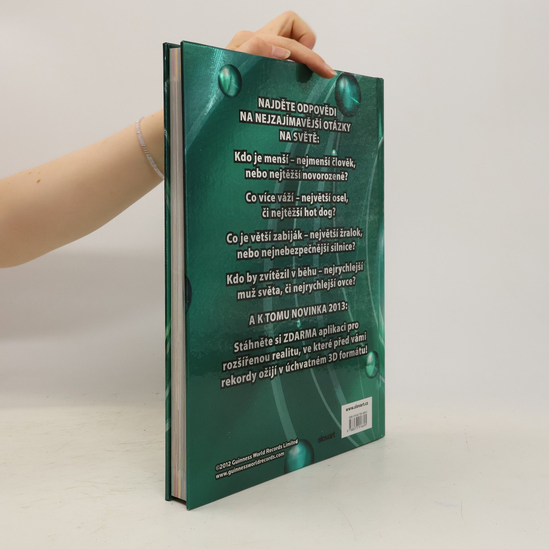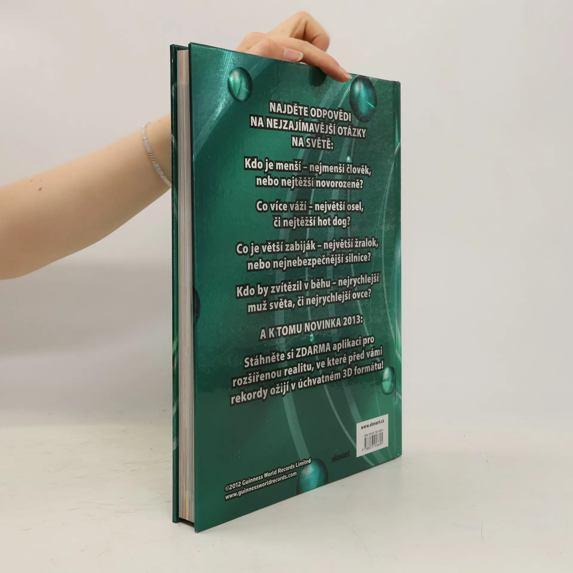 V letošním vydání přináší i odpovědi na otázky: Kdo je menší - nejmenší člověk, nebo nejtěžší novorozeně? Co více váží - největší osel, či nejtěžší hot dog? Co je větší zabiják - největší žralok, nebo nejnebezpečnější silnice? Kdo by zvítězil v běhu - nejrychlejší muž světa, či nejrychlejší ovce? Guinnessova kniha rekordů pro rok 2013 obsahuje zcela nové a nikdy nepublikované rekordy, které tvoří asi 2/3 celého obsahu. Zbývající část se věnuje nepřekonatelným rekordům, tedy rekordům, které vznikly již velmi dávno, ale nikdy nebyly a velmi pravděpodobně ani nebudou překonány. Zdarma si navíc můžete stáhnout aplikaci pro rozšířenou realitu, ve které před vámi rekordy ožijí v úchvatném 3D formátu!