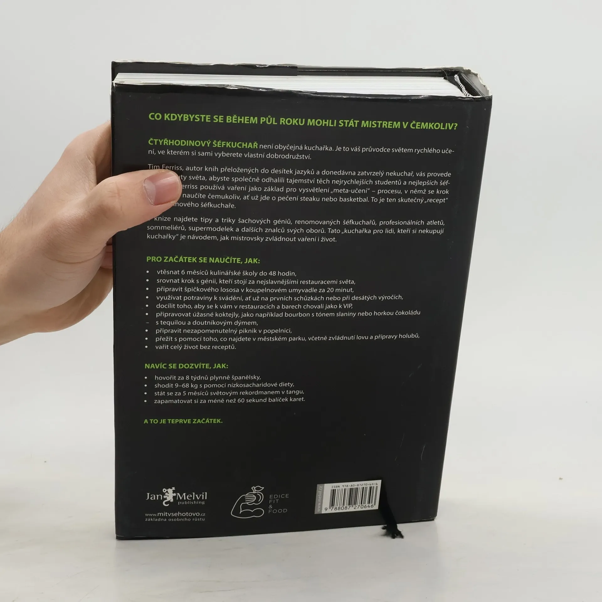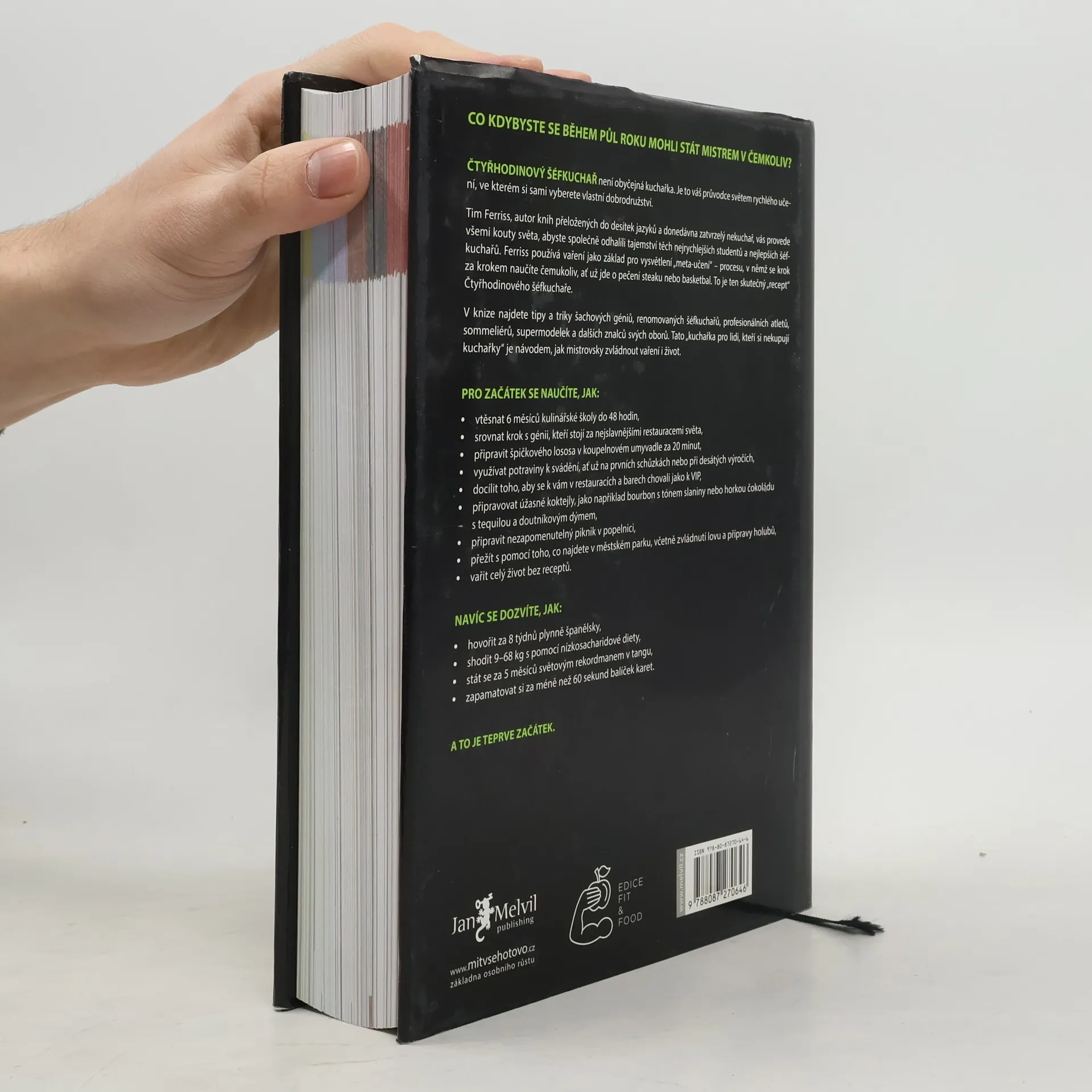 Timothy Ferriss přichází se svou dlouho připravovanou a napjatě očekávanou kuchařkou pro ty, kteří si kuchařky nikdy nekupují. Jeho přímočará cesta k cíli, známá již z předchozích bestsellerů Čtyřhodinový pracovní týden a Čtyřhodinové tělo vede v této vynalézavé knize přes všechny apekty života. Protože jak říká Tim, pokud se chcete naučit vařit, musíte se nejprve naučit učit se. Jakmile umíte tohle, můžete se naučit vařit, mluvit cizí řečí, hrát baketball, přežít v divočině… prostě stát se světovou třídou, v čem budete chtít. S Timem v roli šéfkuchaře projdete školou vaření, v níž se s každým receptem naučíte určitou dovednost, kterou následně využijete v dalším receptu. Množství tipů a triků z vás udělá vládce kuchyně, ale Ferriss, jak už má ve zvyku, se neomezuje jen na vaření doma. V části o divočině si uloví večeři, ve vědecké části pochopí molekulární kuchyni…