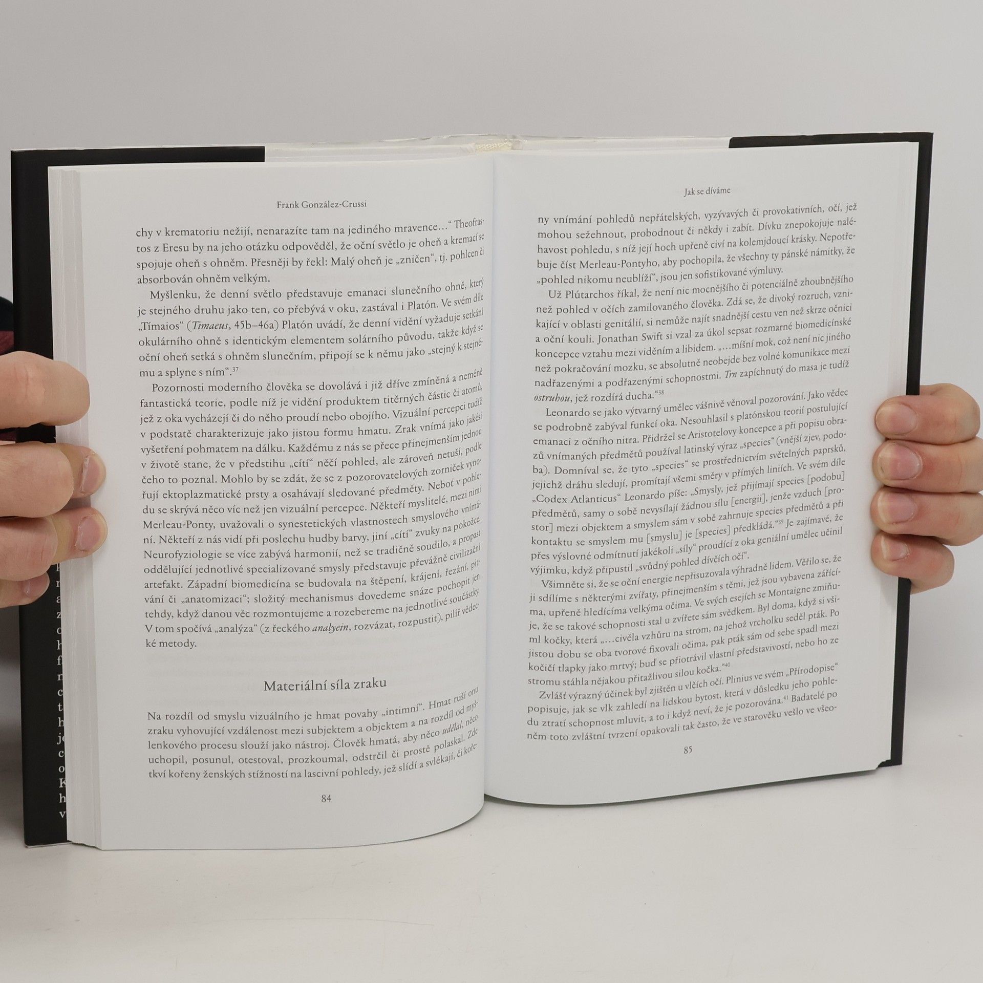 Frank González–Crussi, emeritní profesor patologie na Northwesternské lékařské univerzitě, má za sebou bohatou kariéru v porodnické a patologické medicíně a je autorem několika knih. V této publikaci se zaměřuje na široké spektrum aspektů zraku a vidění, zkoumá různé způsoby dívání a hledá odpovědi na otázky týkající se přitažlivosti výstředních scén, včetně filozofických otázek kolem teorie vidění. Zrak je považován za klíčový smysl pro přežití a vnímání okolního světa, dominující našemu podvědomí a snům. Autor zkoumá fascinující vztah mezi dívajícím se a viděným, vnímajícím a vnímaným. Diskutuje o tabuizaci pohledu na ženské pohlavní orgány a uvádí zajímavé příklady z historie umění, včetně mýtu o Aktaionovi. Dále se zabývá fascinací pohledem na lidské tělo, scénami zrození a smrti a analyzuje funkci zrcadla a moderní vynálezy jako mikroskop a fotografie, které zásadně změnily naše vnímání sebe sama. V knize se objevují i popisy vystavování mrtvol, kde byly zakrývány pouze vnější genitálie, zatímco osobní věci zesnulých visely na stěnách. Tato témata podtrhují autorovu schopnost propojit medicínu s uměním a filozofií.