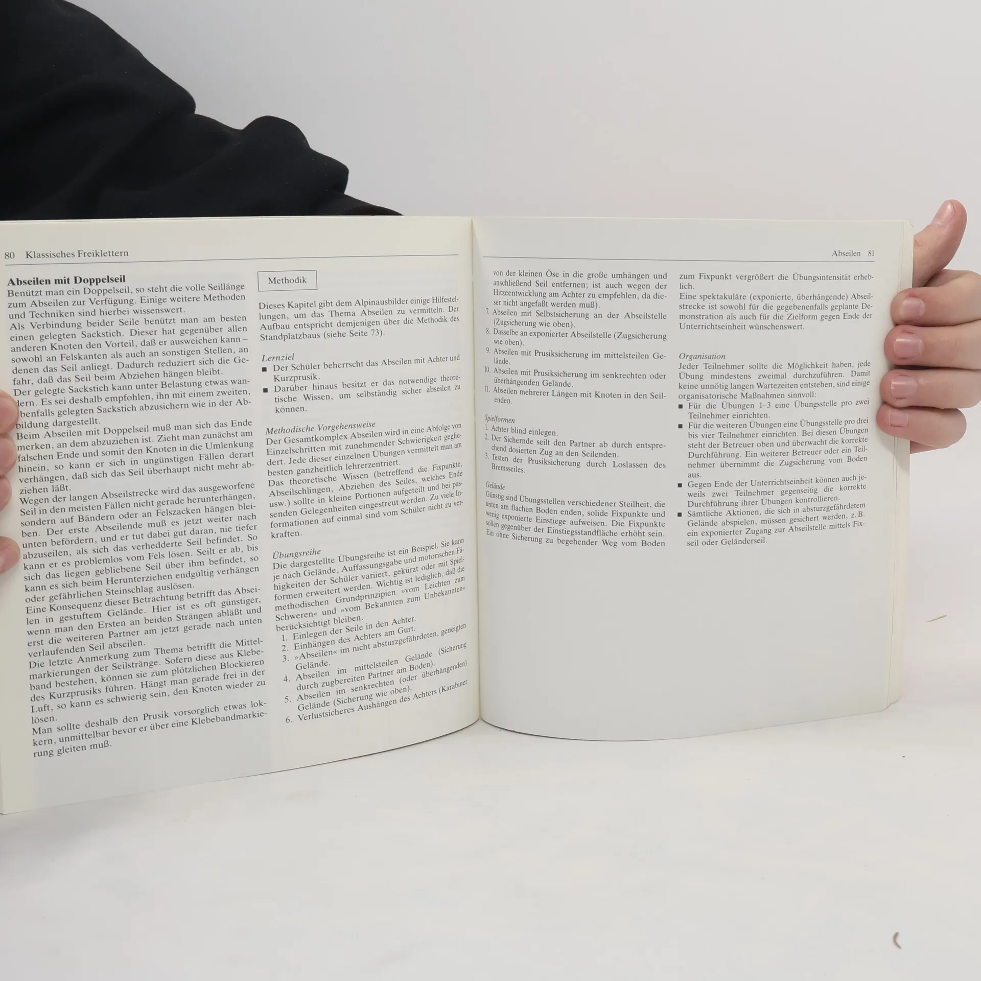 Klettertechniken, Taktik beim klassischen Felsklettern, Stürzen und Taktik beim Sportklettern, Sicherungsmethoden, Ausrüstung, Wetter, alpine Gefahren, Orientierung, Erste Hilfe, Training, Umwelt- und Naturschutz.