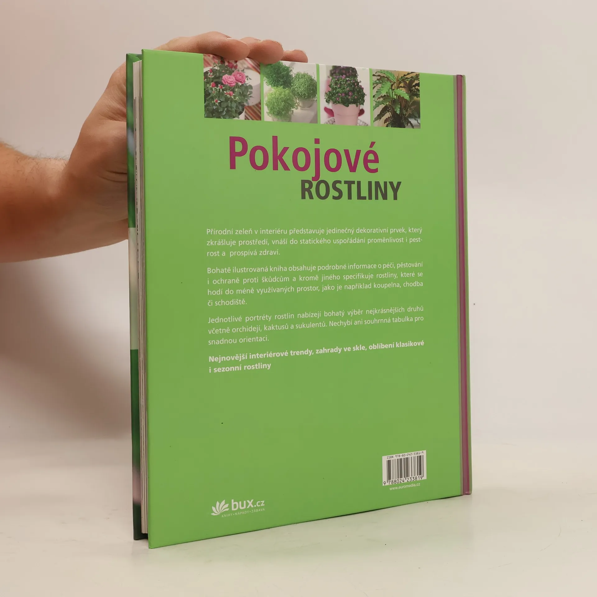 Bohatě ilustrovaná kniha obsahuje podrobné informace o péči, pěstování i ochraně proti škůdcům a kromě jiného specifikuje rostliny, které se hodí do méně využívaných prostor, jako je například koupelna, chodba či schodiště. Jednotlivé portréty rostlin nabízejí bohatý výběr nejkrásnějších druhů včetně bonsají, orchidejí, kaktusů a sukulentů. Nechybí ani souhrnná tabulka pro snadnou orientaci.
