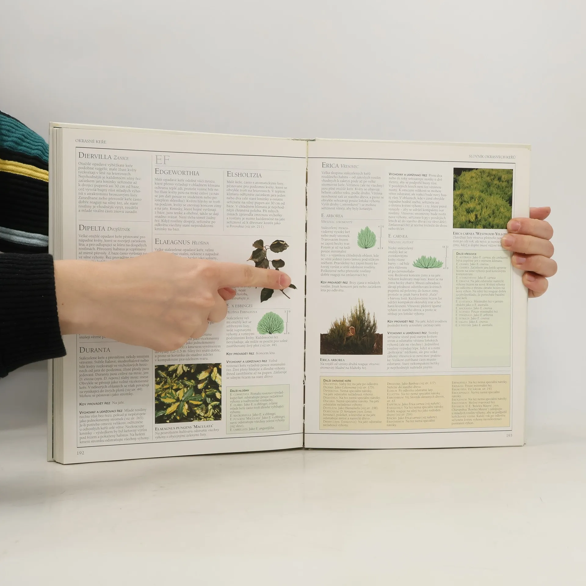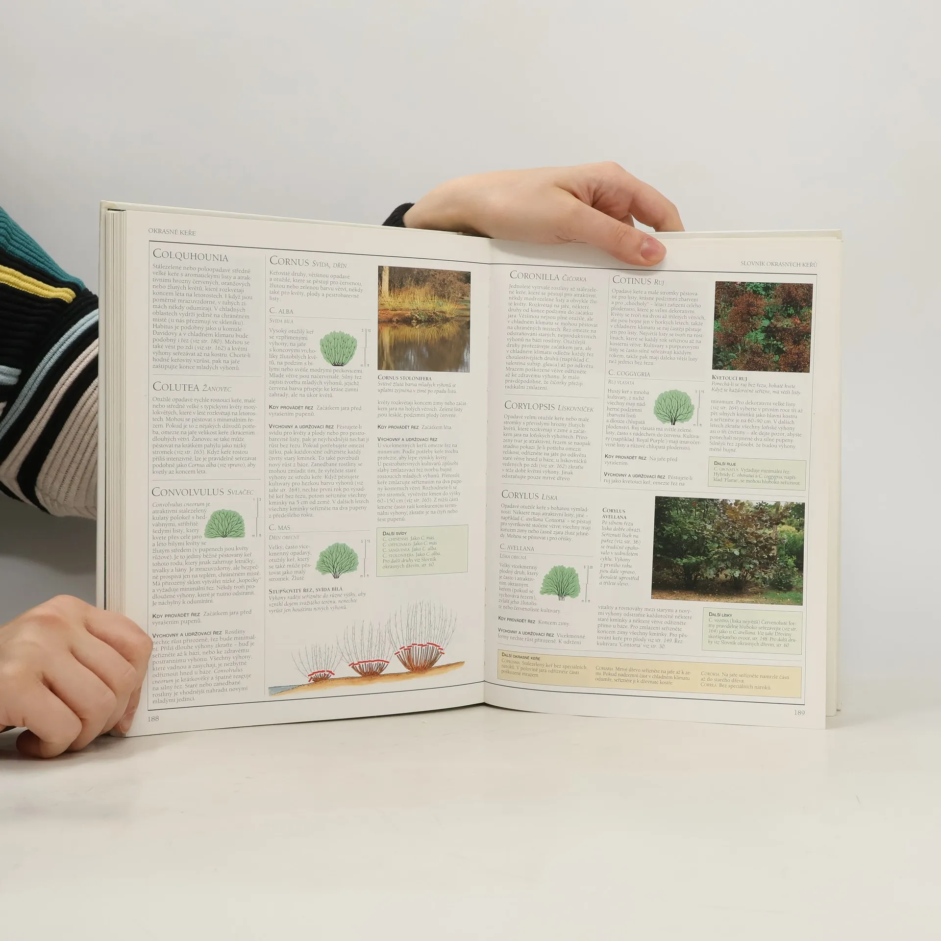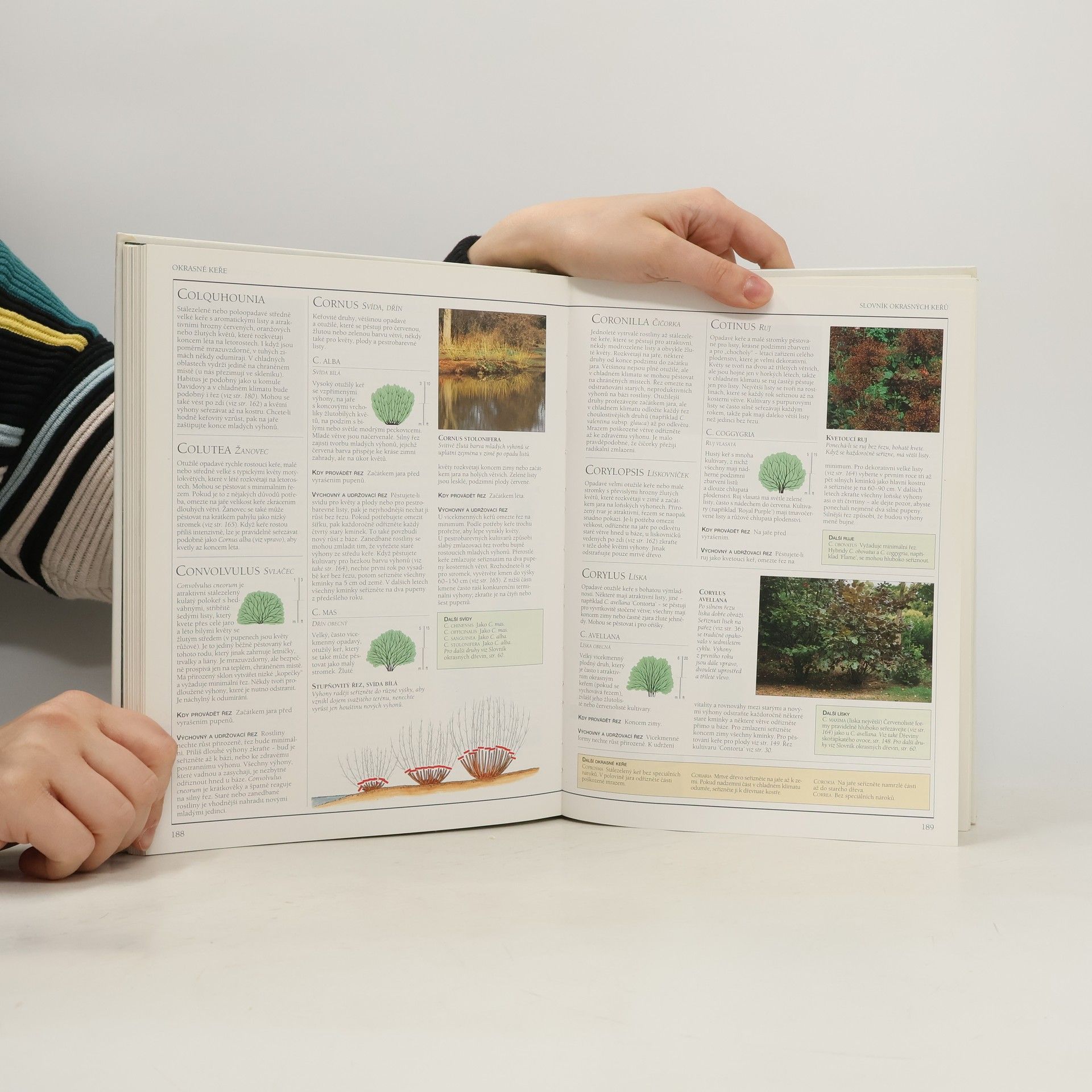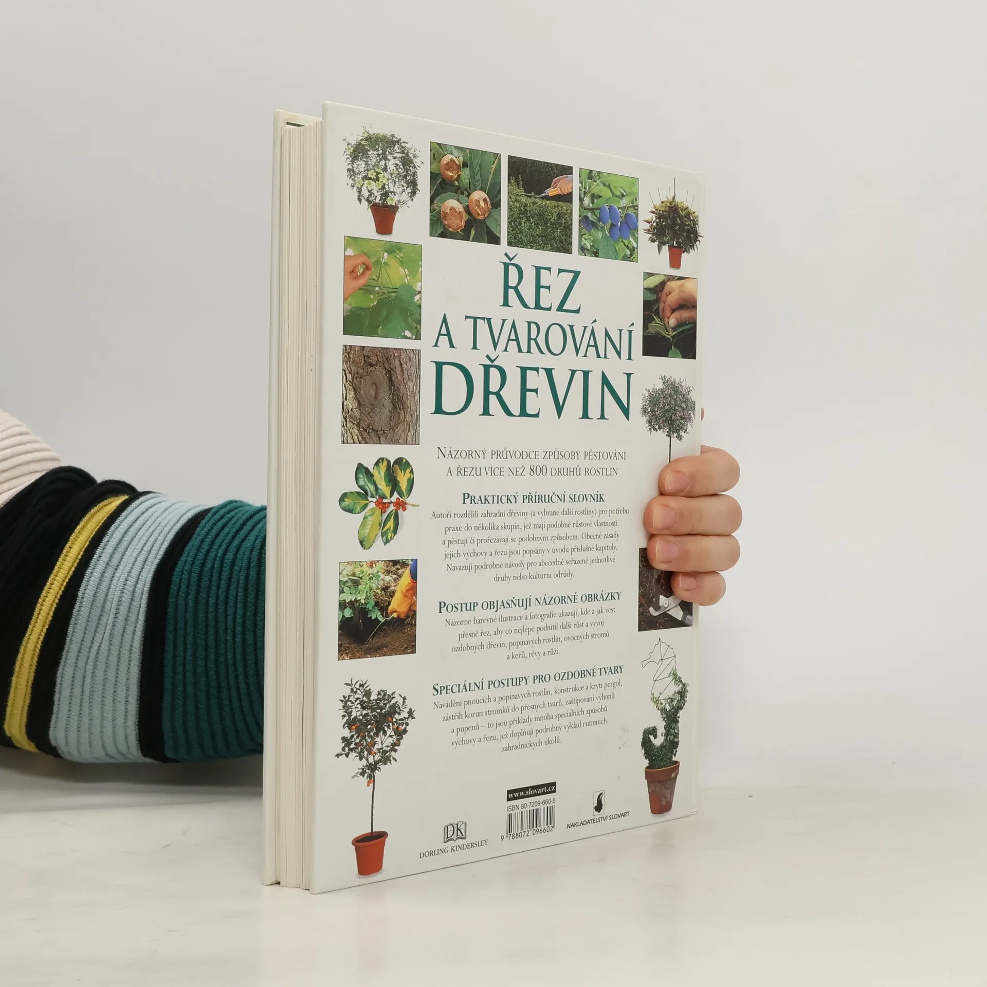 Praktická ilustrovaná příručka. Názorný průvodce způsoby pěstování a řezu více než 800 druhů rostlin. Praktický příruční slovník. Autoři rozdělili zahradní dřeviny (a vybrané další rostliny) pro potřebu praxe do několika skupin, jež mají podobné růstové vlastnosti a pěstují či prořezávají se podobným způsobem. Obecné zásady jejich výchovy a řezu jsou popsány v úvodu příslušné kapitoly. Navazují podrobné návody pro abecedně seřazené jednotlivé druhy nebo kulturní odrůdy. Postup objasňují názorné obrázky. Názorné barevné ilustrace a fotografie ukazují, kde a jak vést přesně řez, aby co nejlépe podnítil další růst a vývoj ozdobných dřevin, popínavých rostlin, ovocných stromů a keřů, révy a růží. Speciální postupy pro ozdobné tvary. Navádění pnoucích a popínavých rostlin, konstrukce a krytí pergol, zástřih korun stromků do přesných tvarů, zaštipování výhonů a pupenů - to jsou příklady mnoha speciálních způsobů výchovy a řezu, jež doplňují podrobný výklad rutinních zahradnických úkolů.