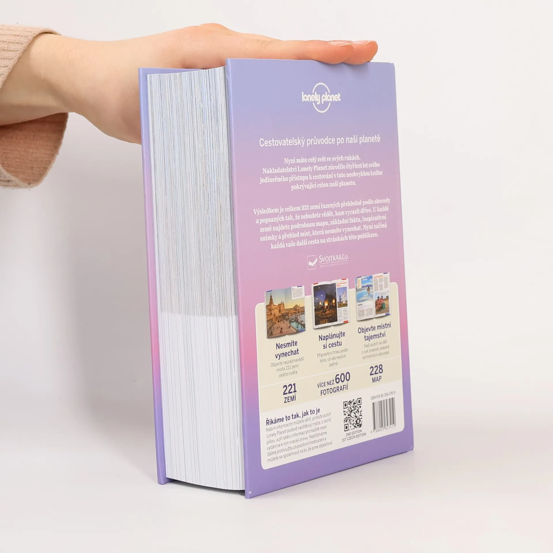 Nakladatelství Lonely Planet zúročilo čtyřicet let svého jedinečného přístupu k cestování v tuto neobvyklou knihu pokrývající celou naši planetu. Výsledkem je celkem 221 zemí řazených přehledně podle abecedy a popsaných tak, že nebude vědět, kam vyrazit dříve. U každé země najdete podrobnou mapu, základní fakta, inspirativní snímky a přehled míst, která nesmíte vynechat. Nyní začíná každá další cesta na stránkách této publikace. Teď máte celý svět ve svých rukách! Nesmíte vynechat Objevte nejzajímavější místa 221 zemí celého světa Naplánujte si cestu Připravte si trasu podle toho, co vás nejvíce zajímá Objevte místní tajemství Naši autoři se dělí o své znalosti získané od místních obyvatel