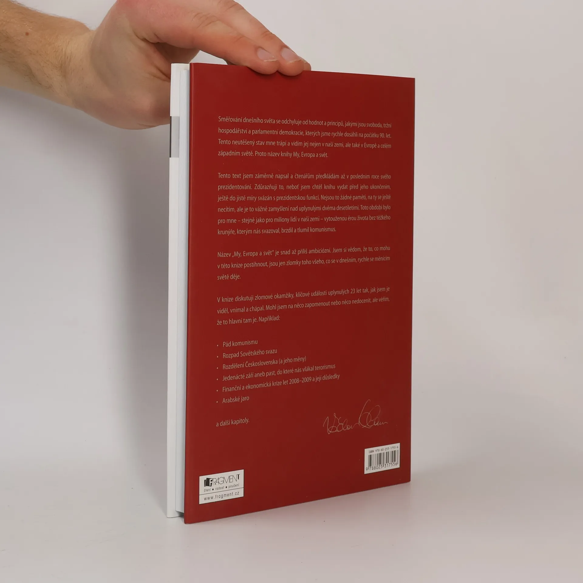 Směřování dnešního světa se odchyluje od hodnot a principů, jakými jsou svoboda, tržní hospodářství a parlamentní demokracie, kterých jsme rychle dosáhli na počátku 90. let. Tento neutěšený stav mne trápí a vidím jej nejen v naší zemi, ale také v Evropě a celém západním světě. Proto název knihy My, Evropa a svět. Tento text jsem záměrně napsal a čtenářům předkládám až v posledním roce svého prezidentování. Zdůrazňuji to, neboť jsem chtěl knihu vydat před jeho ukončením, ještě do jisté míry svázán s prezidentskou funkcí. Nejsou to žádné paměti, na ty se ještě necítím, ale je to vážné zamyšlení nad uplynulými dvěma desetiletími. Toto období bylo pro mne – stejně jako pro miliony lidí v naší zemi – vytouženou érou života bez těžkého krunýře, kterým nás svazoval, brzdil a tlumil komunismus. Název „My, Evropa a svět“ je snad až příliš ambiciózní. Jsem si vědom, že to, co mohu v této knize postihnout, jsou jen zlomky toho všeho, co se v dnešním, rychle měnícím se světě děje. V knize diskutuji zlomové okamžiky, klíčové události uplynulých 23 let tak, jak jsem je viděl, vnímal a chápal. Mohl jsem na něco zapomenout nebo něco nedocenit, ale věřím, že to hlavní tam je. Např.: • Pád komunismu • Rozpad Sovětského svazu • Rozdělení Československa (a jeho měny) • Jedenácté září aneb past, do které nás vlákal terorismus • Finanční a ekonomická krize let 2008 – 2009 a její důsledky • Arabské jaro a další kapitoly.