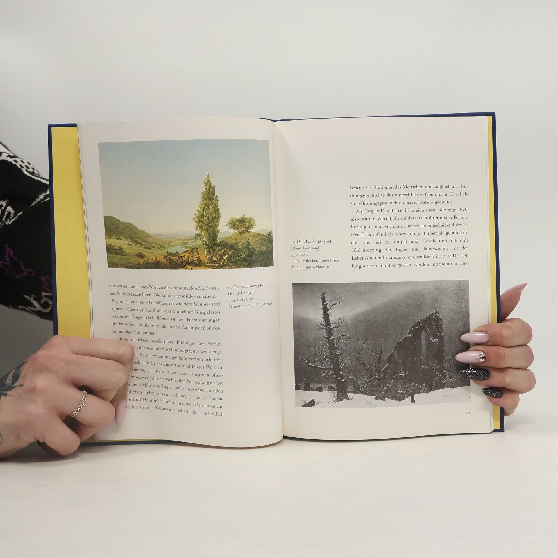 Der wichtigste Maler der deutschen Romantik. Immer wieder hat Caspar David Friedrich diesen Augenblick gemalt: Menschen sind auf dem Weg durch die Natur unvermittelt an eine Grenze geraten und halten inne. Ein gebirgiger Pfad biegt plötzlich ab, neben einem Felsen tut sich ein Abgrund auf. Die romantischen Bilder gehen über die Darstellung der poetischen Landschaft und der Jahreszeiten hinaus. Die Schönheit der Natur trägt bereits das Ende in sich, das Leben erreicht eine Grenze. Die Gebundenheit des Menschen auf dieser Erde und das Hoffen auf die Ewigkeit sind das eigentliche Thema dieses außergewöhnlichen Malers.