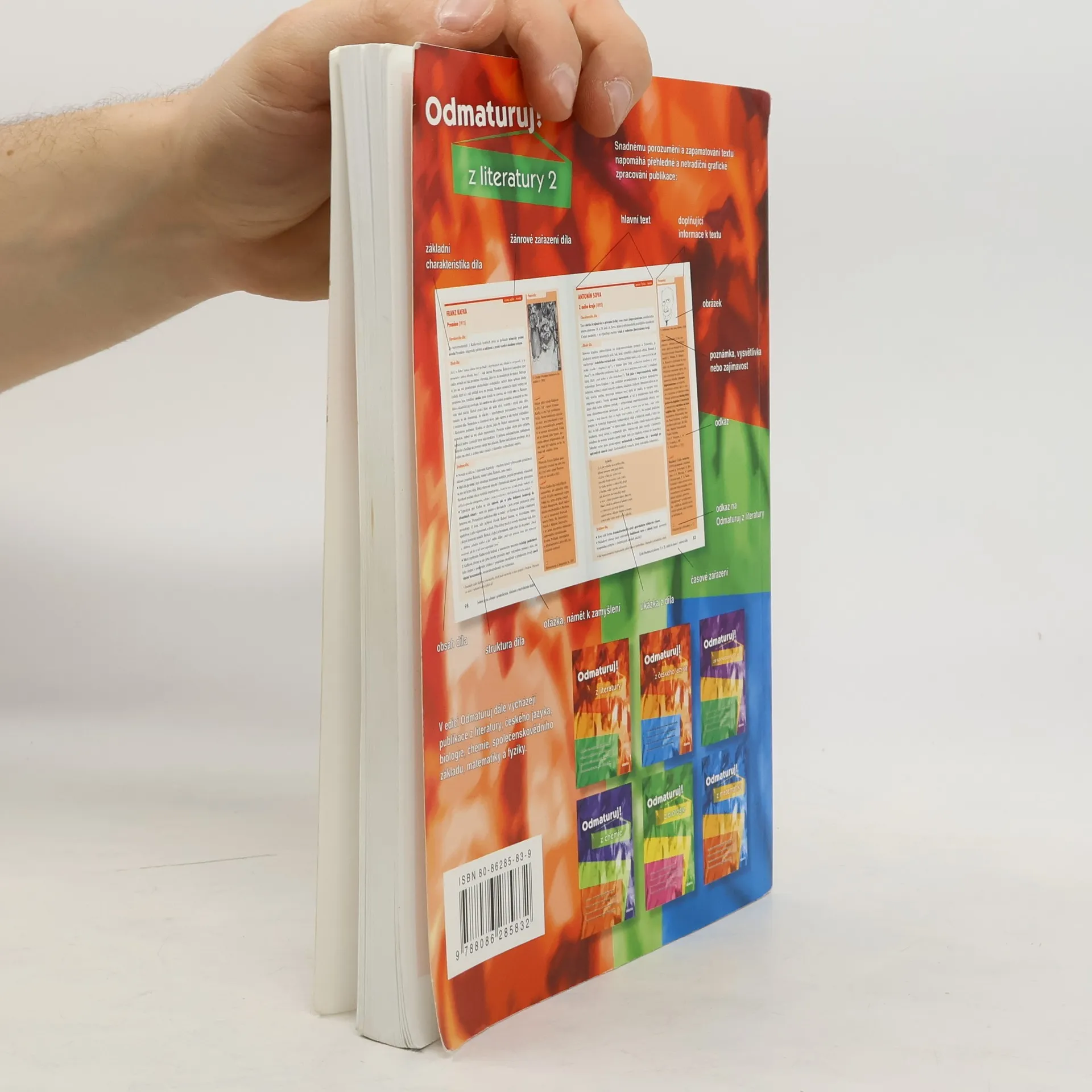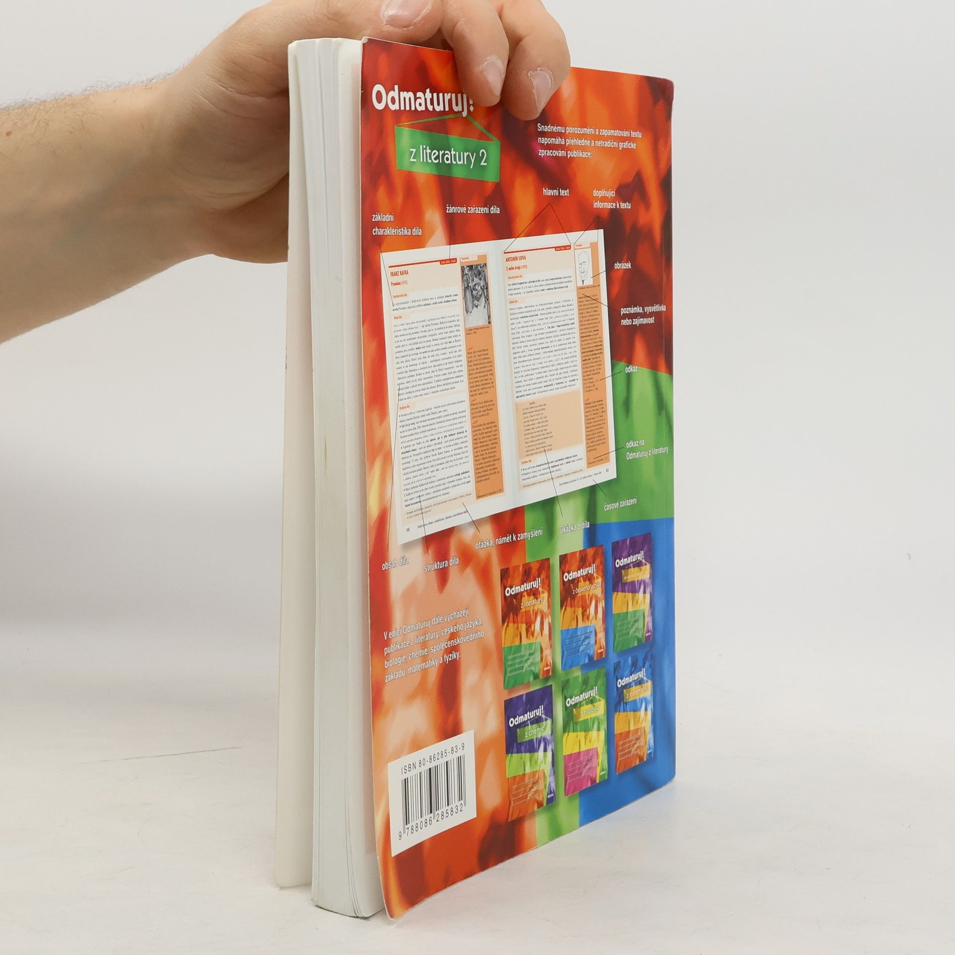 Poutavá učebnice určená k přípravě na maturitu (i k nové podobě maturity) a k přijímacím zkouškám na vysoké školy. Rozšiřuje poznatky z Odmaturuj z literatury 1, obsahuje 167 vybraných děl české a světové literatury od počátků do současnosti, zahrnuje prózu i poezii. Kniha je doplněna ukázkami z děl, podnětnými otázkami, vysvětlením literárněvědných pojmů, obrázky, poznámkami a zajímavostmi. * Každému dílu je věnována jedna strana a text je přehledně členěn na 3 části.
