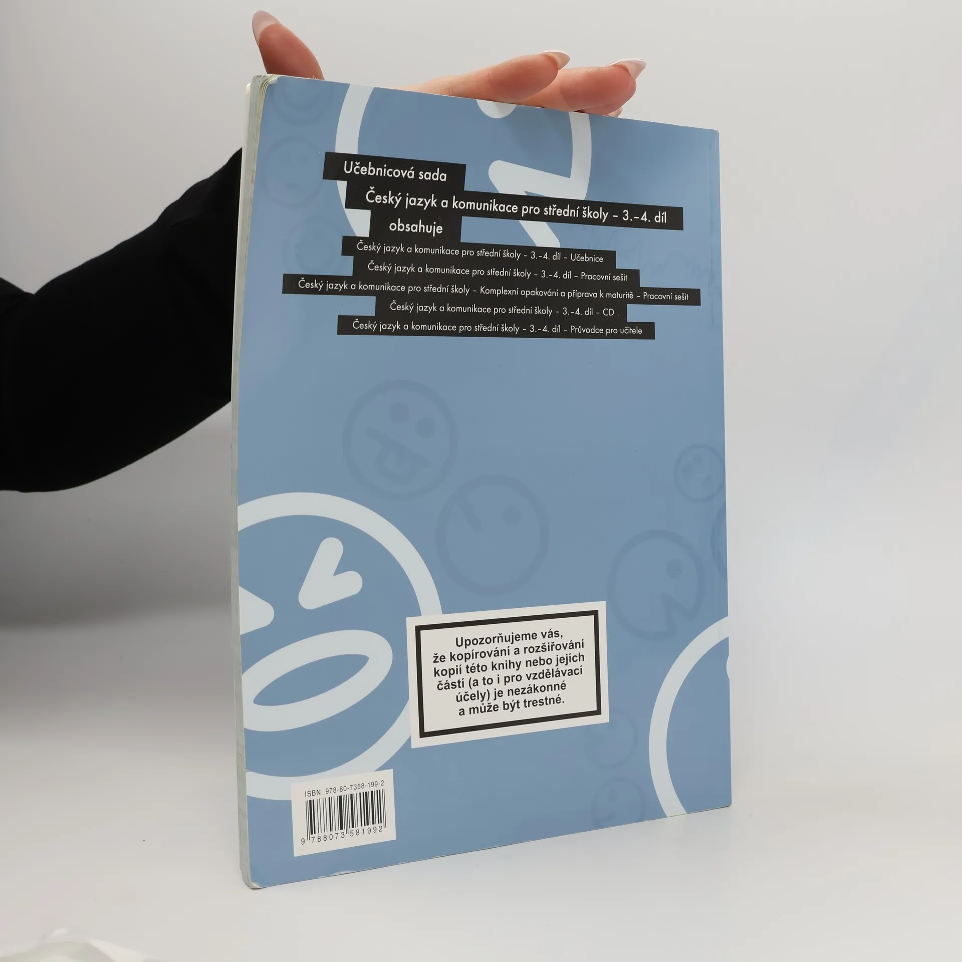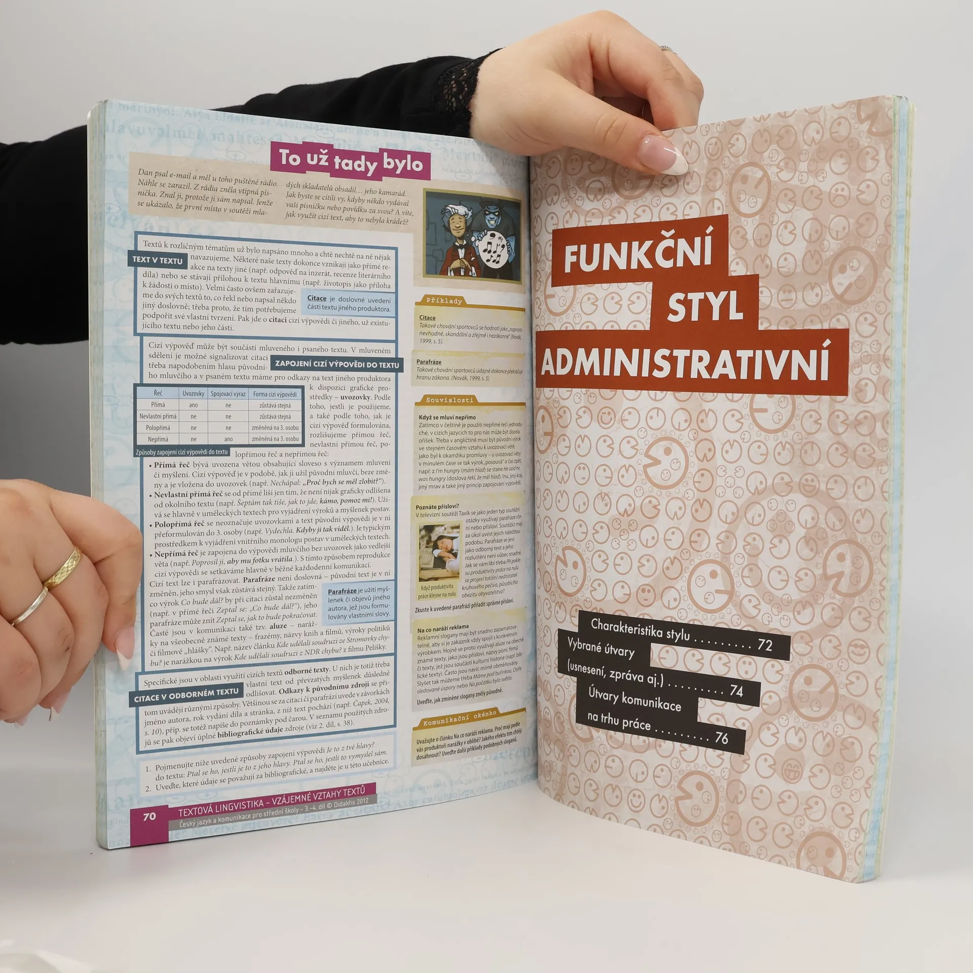 Přehledná a poutavá učebnice určená pro 3. a 4. ročníky středních škol. Přináší základní informace o jazyce (z oblasti tvarosloví, skladby, textové lingvistiky a vývoje jazyka), slohu (z oblasti funkčního stylu uměleckého, publicistického, odborného, administrativního) a komunikaci (z oblasti masové komunikace a komunikace na trhu práce). Řada kapitol je zaměřena velmi prakticky a klade si za cíl připravit studenty na úspěšné zvládnutí výběrového řízení a fungování ve firmě i pracovním týmu. Učebnice obsahuje i řadu doplňujících zajímavostí, které informace z výkladu zasazují do širších souvislostí a každodenního života, a obsáhlou tabulkovou přílohu s přehledem tvarosloví, skladby, funkčních stylů a prostředků uměleckých textů.