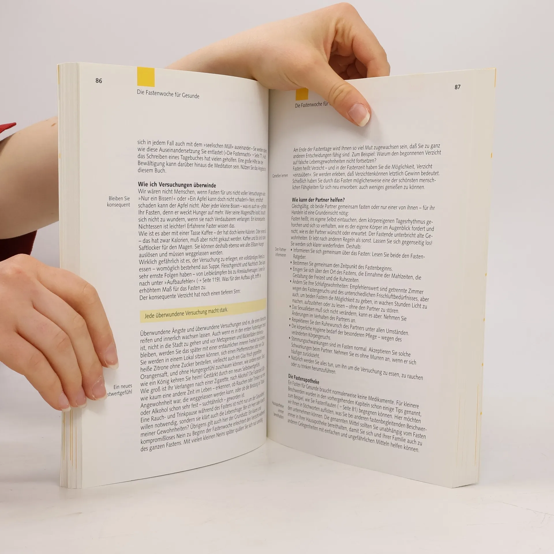 Der Ratgeber beschreibt eine Fastenwoche mit meditativen Elementen sowie die Nachfastenzeit.