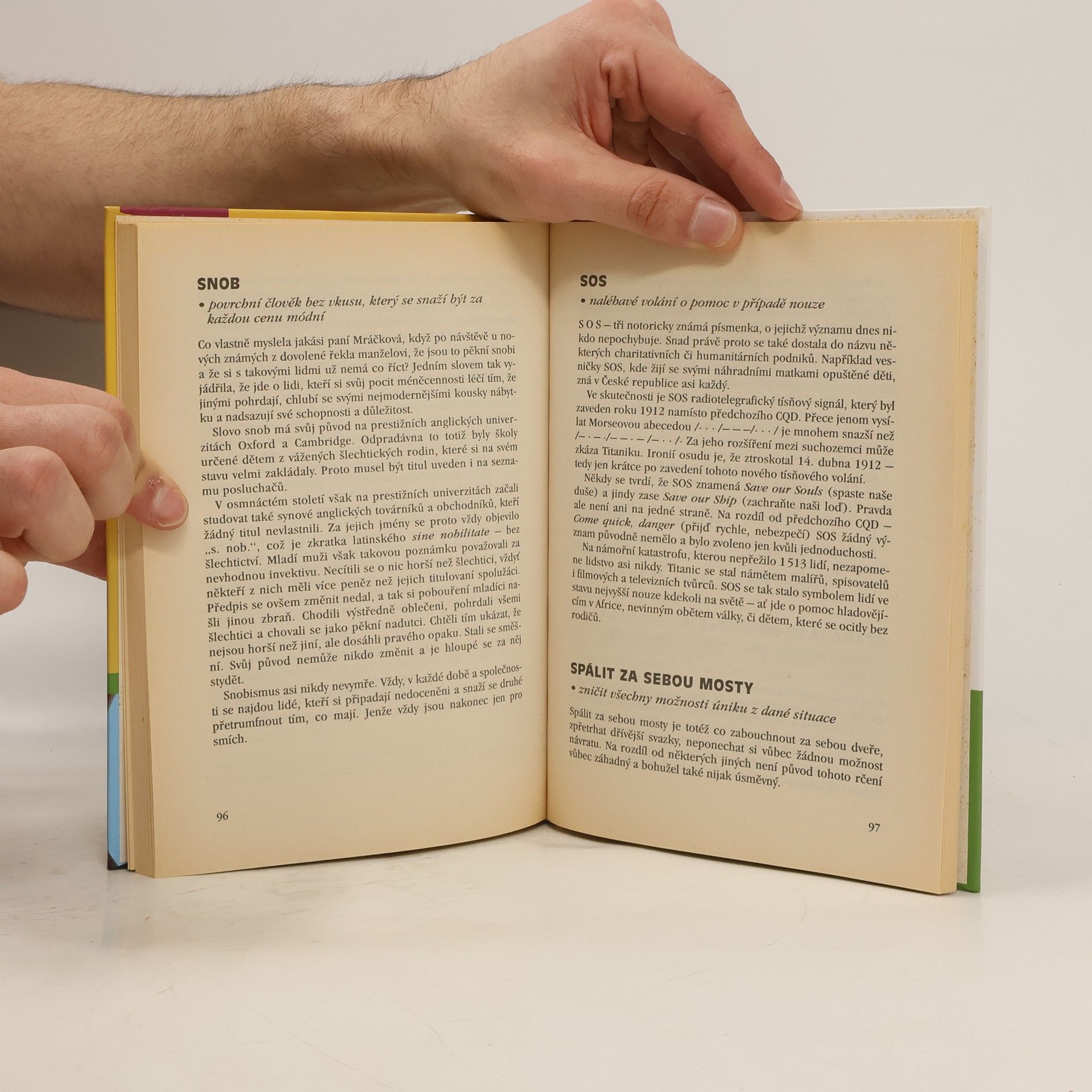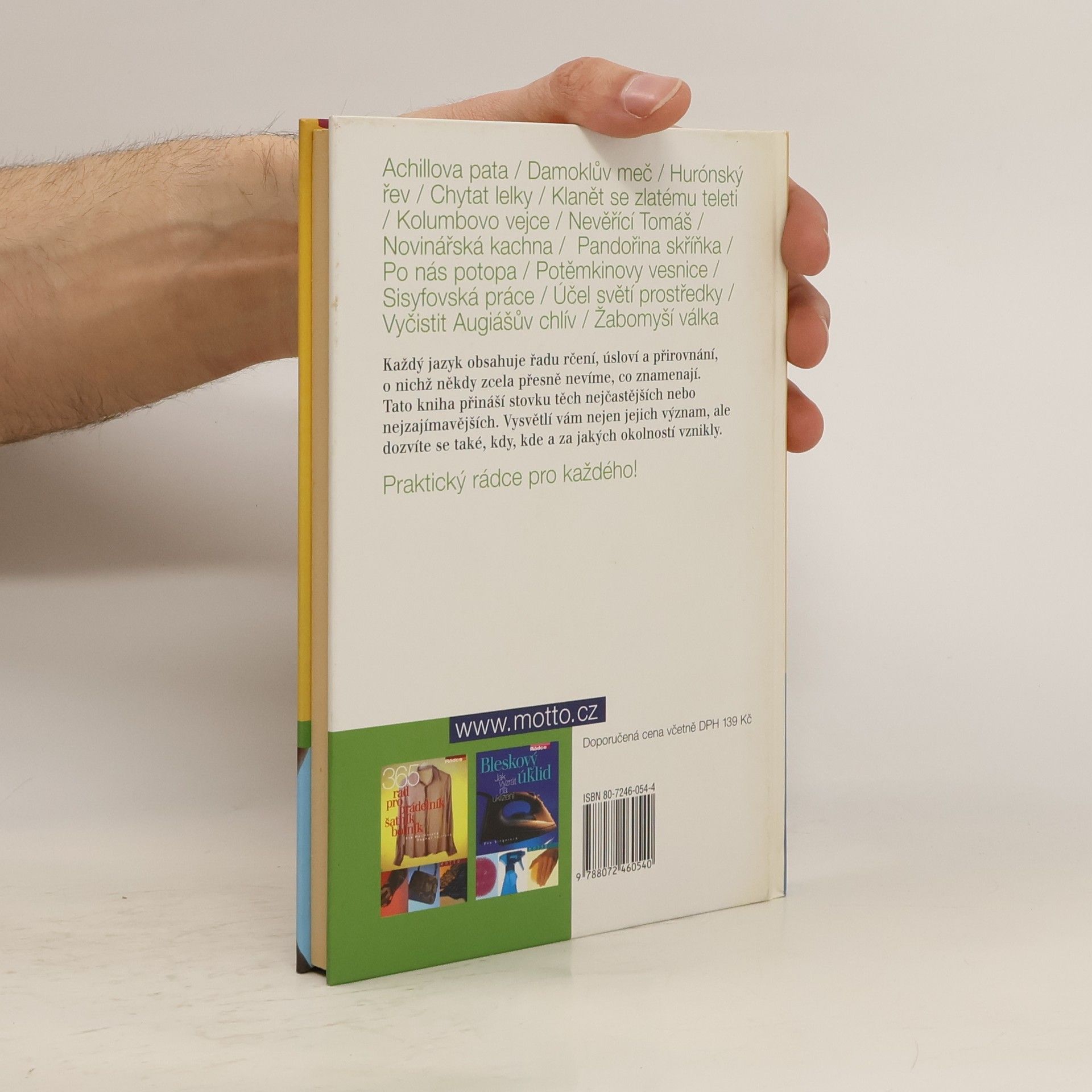 Stovka běžně užívaných úsloví a rčení s populárním výkladem. V abecedním pořádku (počínaje"Achillovou patou" a žitím "na vysoké noze" konče) uvádí rčení a úsloví, jeho stručný význam spolu s doprovodnou beletrizující historkou, nejčastěji antického nebo biblického původu.