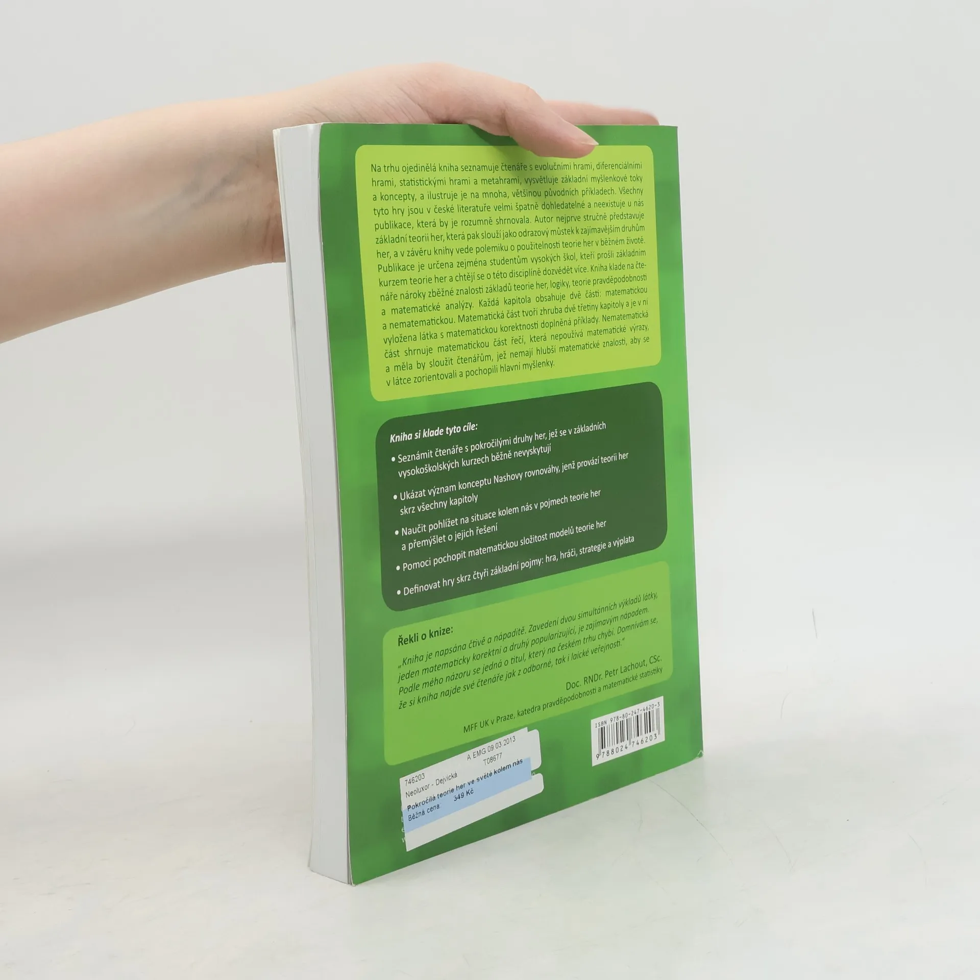 Na trhu ojedinělá kniha seznamuje čtenáře s evolučními hrami, diferenciálními hrami, statistickými hrami a metahrami, vysvětluje základní myšlenkové toky a koncepty, a ilustruje je na mnoha, většinou původních, příkladech. Všechny tyto hry jsou v české literatuře velmi špatně dohledatelné a neexistuje u nás publikace, která by je rozumně shrnovala. Autor nejprve stručně představuje základní teorii her, která pak slouží jako odrazový můstek k zajímavějším druhům her, a v závěru knihy vede polemiku o použitelnosti teorie her v běžném životě. Publikace je určena zejména studentům vysokých škol, kteří prošli základním kurzem teorie her a chtějí se o této disciplíně dozvědět více. Kniha klade na čtenáře nároky zběžné znalosti základů teorie her, logiky, teorie pravděpodobnosti a matematické analýzy. Každá kapitola obsahuje dvě části: matematickou a nematematickou. Matematická část tvoří zhruba dvě třetiny kapitoly a je v ní vyložena látka s matematickou korektností doplněná příklady. Nematematická část shrnuje matematickou část řečí, která nepoužívá matematické výrazy, a měla by sloužit čtenářům, jež nemají hlubší matematické znalosti, aby se v látce zorientovali a pochopili hlavní myšlenky.