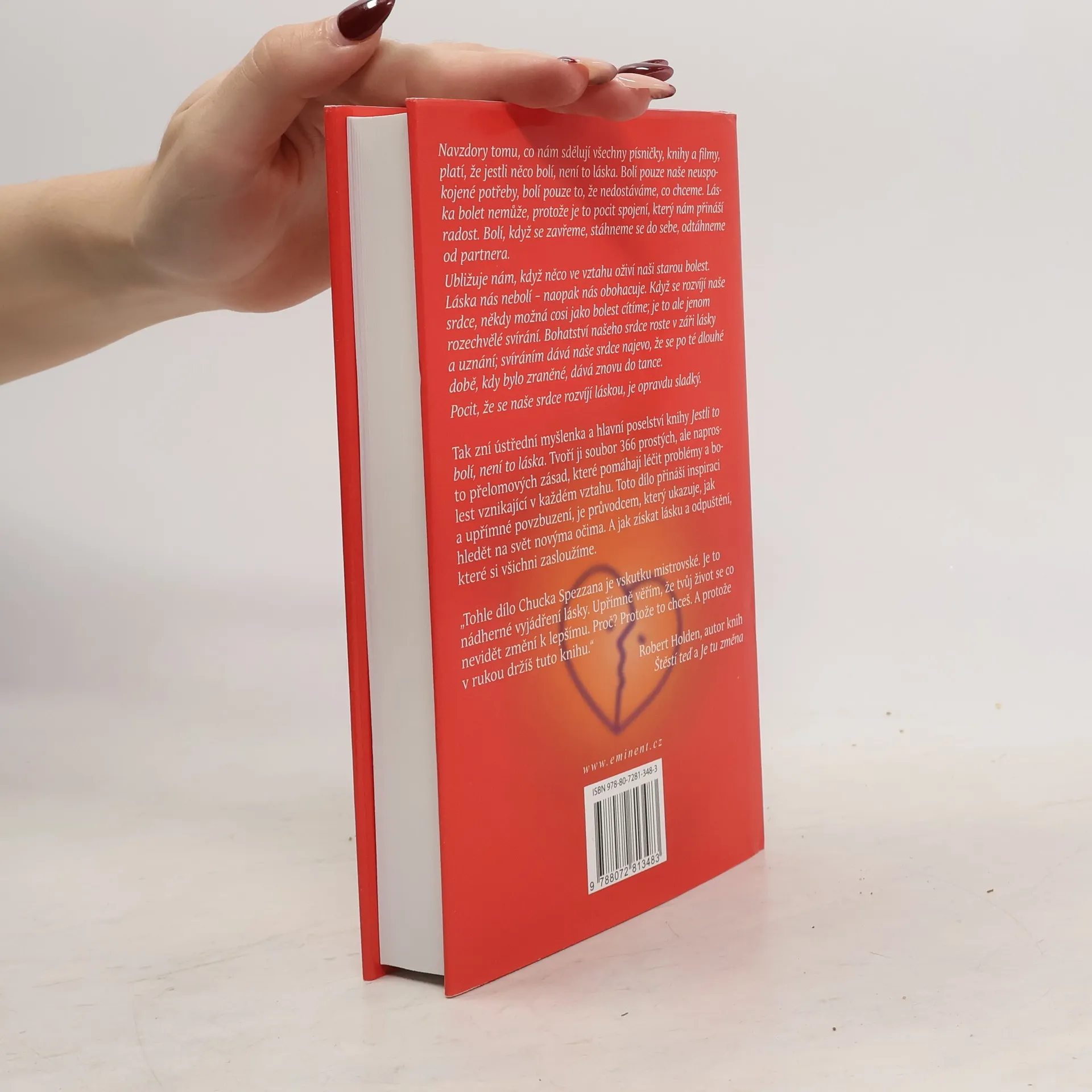 Navzdory tomu, co nám sdělují všechny písničky, knihy a filmy, platí, že jestli něco bolí, není to láska. Bolí pouze naše neuspokojené potřeby, bolí pouze to, že nedostáváme, co chceme. Láska bolet nemůže, protože je to pocit spojení, který nám přináší radost. Bolí, když se zavřeme, stáhneme se do sebe, odtáhneme od partnera. Ubližuje nám, když něco ve vztahu oživí naši starou bolest. Láska nás nebolí – naopak nás obohacuje. Když se rozvíjí naše srdce, někdy možná cosi jako bolest cítíme; je ale jenom svírání. Bohatství našeho srdce roste v záři lásky a uznání; svíráním dává naše srdce najevo, že se po té dlouhé době, kdy bylo zraněné, dává znovu do tance. Pocit, že se naše srdce rozvíjí láskou, je opravdu sladký. Tak zní ústřední myšlenka a hlavní poselství knihy Jestli to bolí, není to láska. Tvoří ji soubor 366 prostých, ale naprosto přelomových zásad, které pomáhají léčit problémy a bolest vznikající v každém vztahu. Toto dílo přináší inspiraci a upřímné povzbuzení, je průvodcem, který ukazuje, jak hledět na svět novýma očima. A jak získat lásku a odpuštění, které si všichni zasloužíme.
