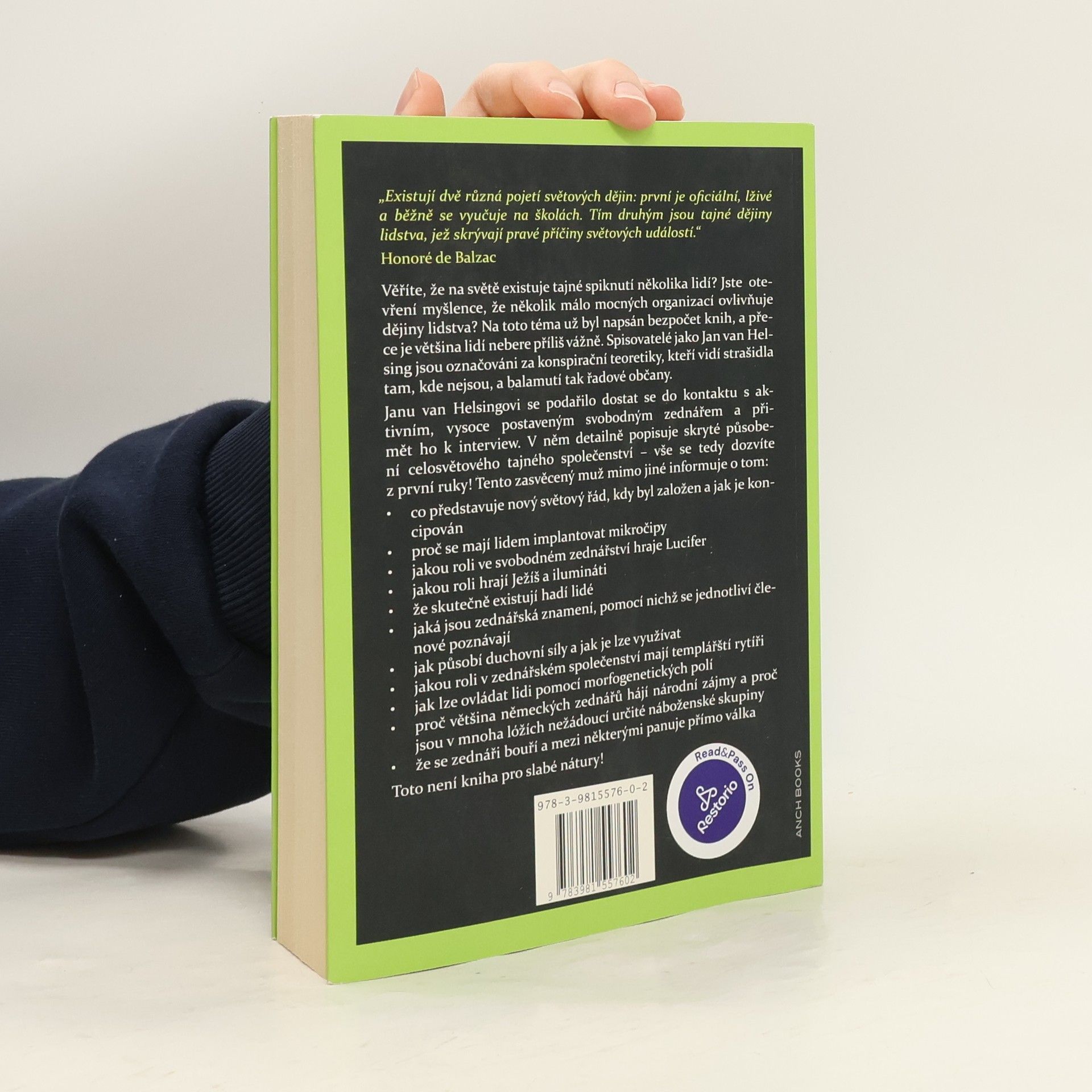 Věříte, že na světě existuje tajné spiknutí několika lidí? Jste otevření myšlence, že několik málo mocných organizací ovlivňuje dějiny lidstva? Na toto téma už byl napsán bezpočet knih, a přece je většina lidí nebere příliš vážně. Spisovatelé jako Jan van Helsing jsou označováni za konspirační teoretiky, kteří vidí strašidla tam, kde nejsou, a balamutí tak řadové občany. Janu van Helsingovi se podařilo dostat do kontaktu s aktivním, vysoce postaveným svobodným zednářem a přimět ho k interview. V něm detailně popisuje skryté působení celosvětového tajného společenství – vše se tedy dozvíte z první ruky! Tento zasvěcený muž mimo jiné informuje o tom: – co představuje nový světový řád, kdy byl založen a jak je koncipován – proč se mají lidem implantovat mikročipy – proč se má v budoucnu masivně snížit počet lidí – že člověk nepochází z opice – jakou roli hrají Ježíš a ilumináti – že skutečně existují hadí lidé – jaká jsou zednářská znamení, pomocí nichž se jednotliví členové poznávají – jak působí duchovní síly a jak je lze využívat – jakou roli v rámci zednářského společenství zastávají templářští rytíři – jak lze ovládat lidi pomocí morfogenetických polí – proč většina německých zednářů hájí národní zájmy a proč jsou v mnoha lóžích nežádoucí určité náboženské skupiny – že se zednáři bouří a mezi některými panuje přímo válka Toto není kniha pro slabé nátury!