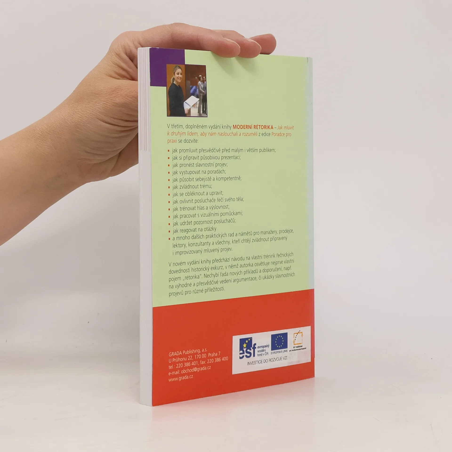 Jak si připravit svůj projev a prezentaci? Jak promluvit přesvědčivě před posluchači a udržet jejich pozornost? Jak zvládnout trému a působit sebejistě a kompetentně? Jak se obléknout a upravit? Jak ovlivnit posluchače řečí těla? Jak trénovat hlas a výslovnost? Jak reagovat na otázky a vystupovat na poradách? Jak pracovat s pomůckami? Jak pronést slavnostní projev? V novém, aktualizovaném vydání úspěšné příručky vám autorka sympaticky, fundovaně a spolehlivě tyto dotazy na mnoha příkladech a tipech zodpoví, jako by předávala své zkušenosti reálnému klientovi. Knížka je určena všem, kteří chtějí zvládnout připravený i improvizovaný mluvený projev.
