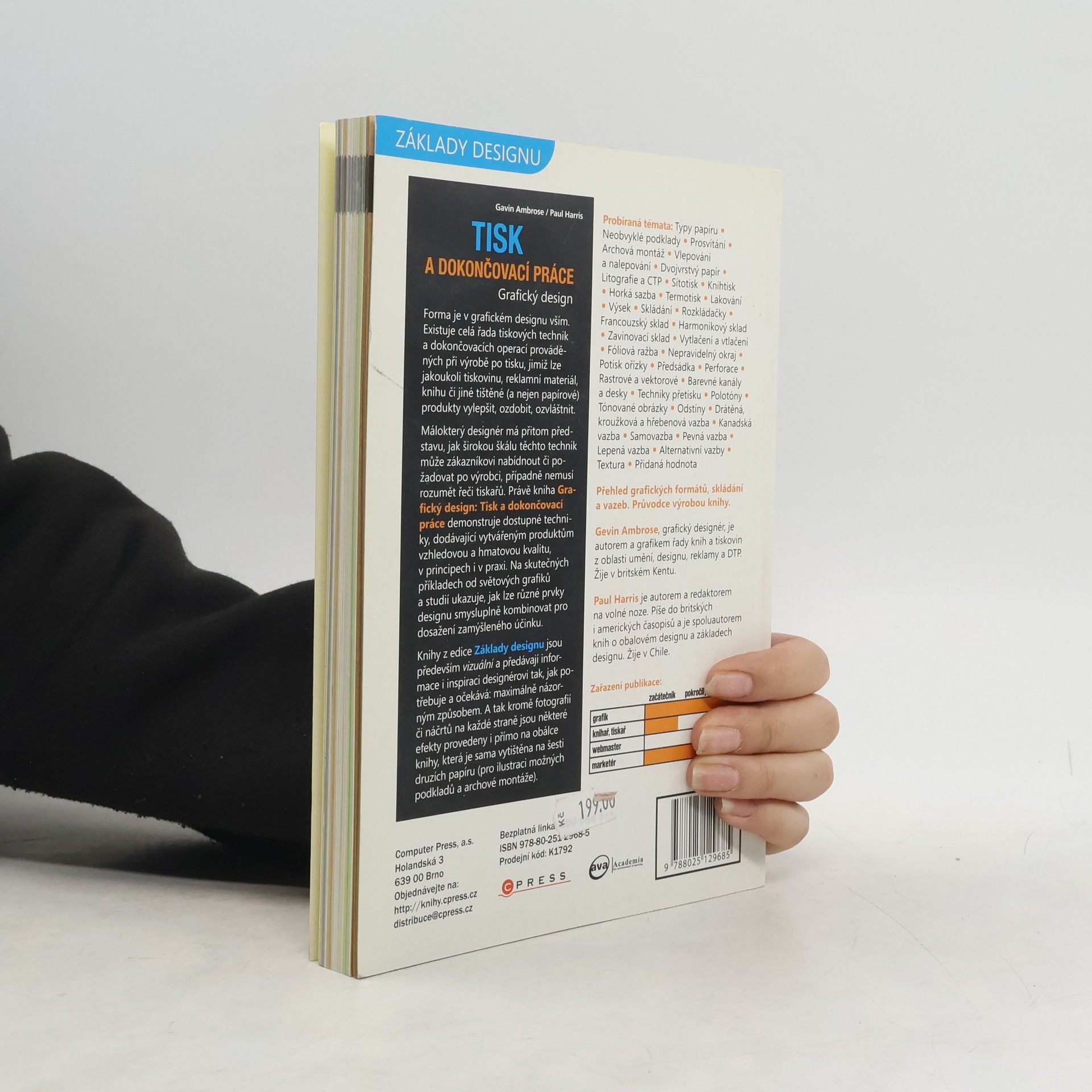 Kniha vysvětluje základní designové principy a postupy používané při tisku a dokončovacích prací.