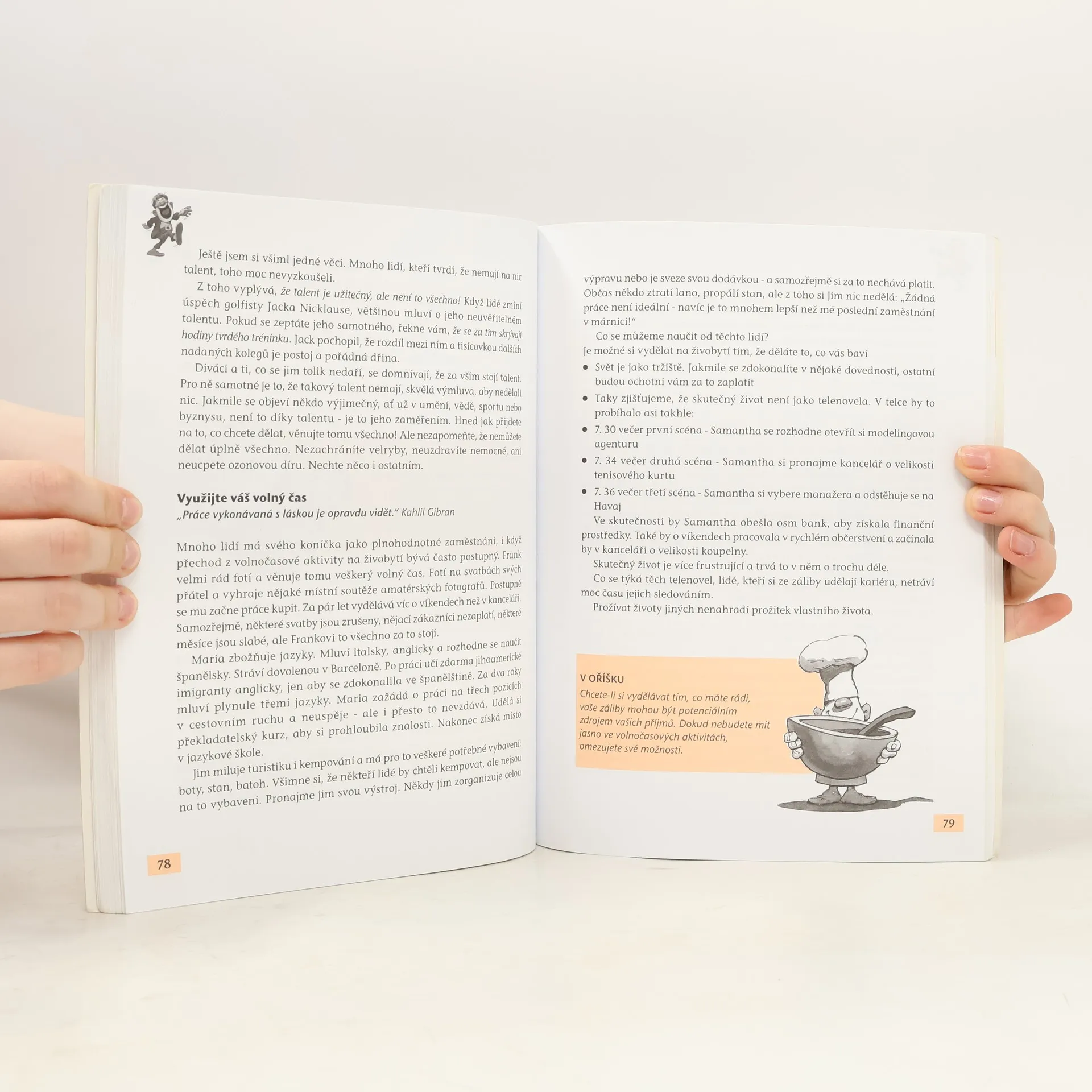 Kniha Vám pomůže najít smysl v životě a práci, zaměřuje se na to, jak dělat to, co máte rádi, a jak dosáhnout vnitřního klidu. Učí, jak se vyrovnat s katastrofami a přestat obviňovat ostatní, včetně matky. Zkoumá myšlení šťastných a bohatých lidí a ukazuje, co dělají ti, kteří stále prohrávají, aby se jim vyhnuli. Napsaná srozumitelnou a čtivou formou, doplněná ilustracemi od autora, je plná příkladů, které umožňují okamžité použití rad a doporučení. Kniha byla přeložena do více než 38 jazyků a prodalo se jí přes 2 miliony výtisků. DOZVÍTE SE: - Jak dělat to, co máte rádi - Jak se vypořádat se složenkami a zlomenými nohami - Jak objevit vaši vlastní sílu - Jak najít vnitřní klid - Jak se vypořádat s katastrofami - Jak neobviňovat matku Kniha obsahuje 10 kapitol rozdělených do několika částí, celkem 144 stran. Každá kapitola se věnuje různým aspektům osobního rozvoje, od učení se z katastrof, přes pozitivní myšlení, až po důležitost přijetí sebe a druhých. Závěrem se zaměřuje na to, že naším posláním není měnit svět, ale měnit sami sebe.