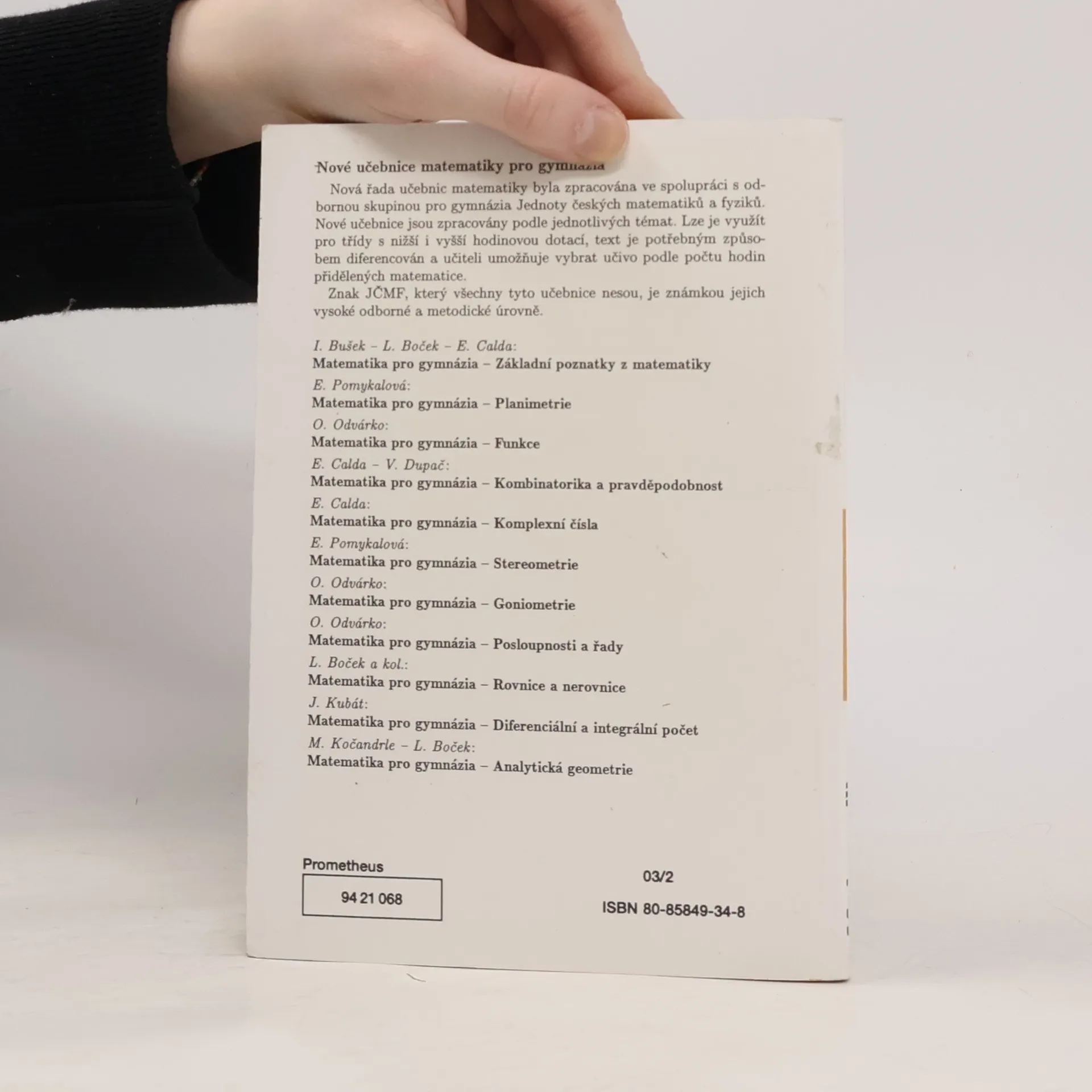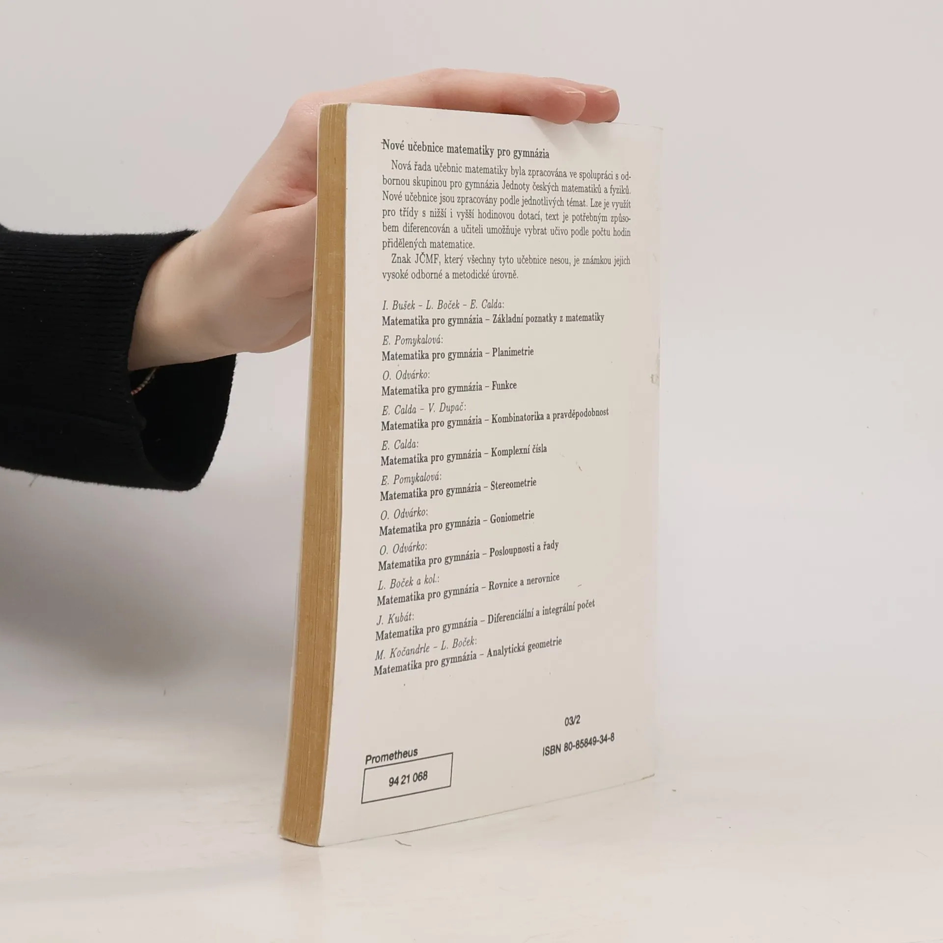 První z řady monotematických učebnic matematiky pro gymnázia. Učebnice lze využít pro třídy s vyšší i nižší hodinovou dotací, text je potřebným způsobem diferencován a učiteli umožňuje vybrat učivo podle počtu hodin přidělených matematice. Učebnice lze použít nejen na gymnáziích, ale také na středních odborných školách. Monotematická řada učebnic matematiky byla připravena ve spolupráci s odbornou skupinou pro gymnázia Jednoty českých matematiků a fyziků. Znak JČMF, který všechny tyto učebnice nesou, je známkou jejich vysoké odborné a metodické úrovně. 2. vydání, 1. vydání v nakladatelství Prometheus. Dotisk v r. 1995
