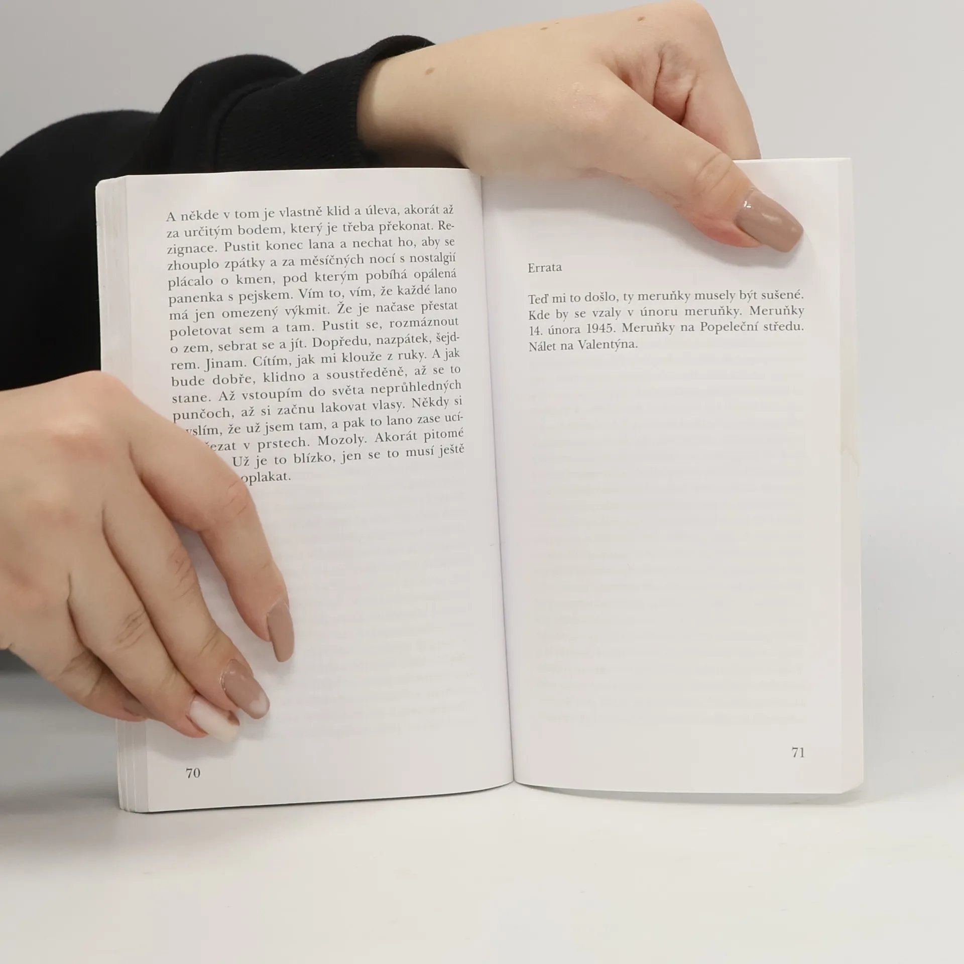 Druhá kniha autorky románu Hruškadóttir (2008), jednoho z nejúspěšnějších prozaických debutů posledních let, oceněného Cenou Jiřího Ortena. Ani deník, ani vzpomínky, ani obrázky ze života. Drásavá elegie o ztrátě města, domu, pokoje; babičky, s níž člověk sdílí tvář. Román dosud nenarozených dětí a už narozených dětí a první zpovědi a tetování na ruce. Příběh malé holčičky, která se bojí, i když už to je dávno žena.