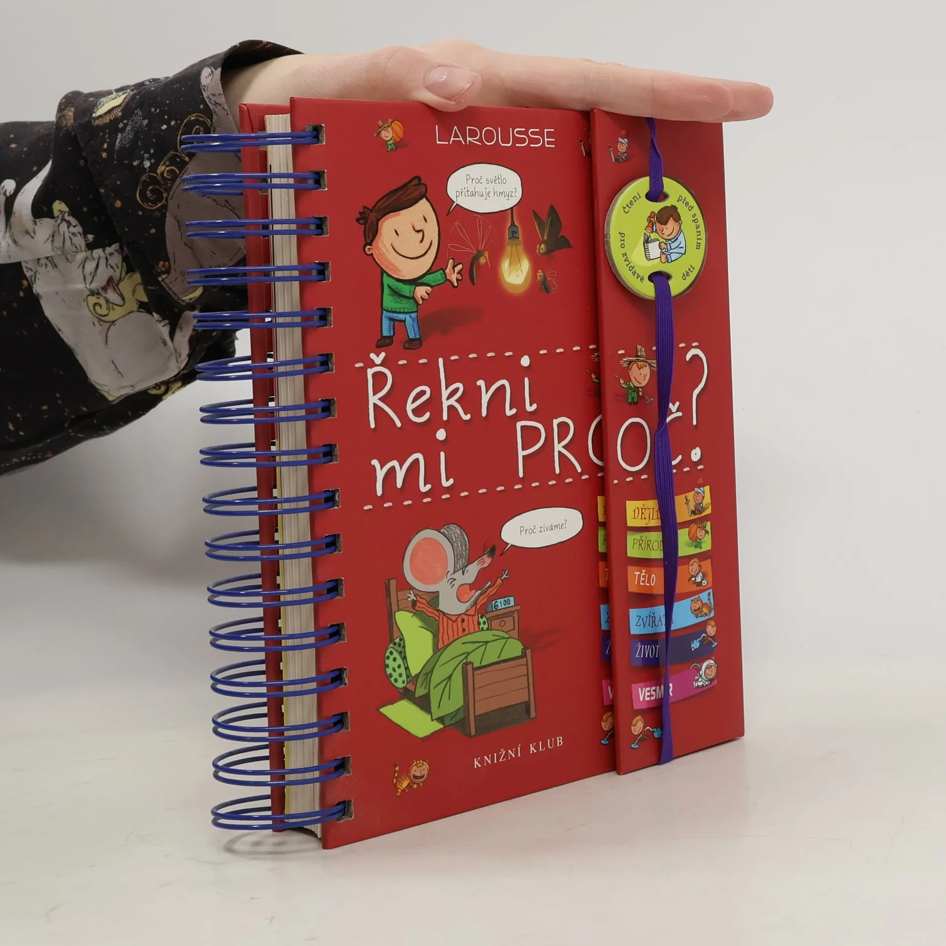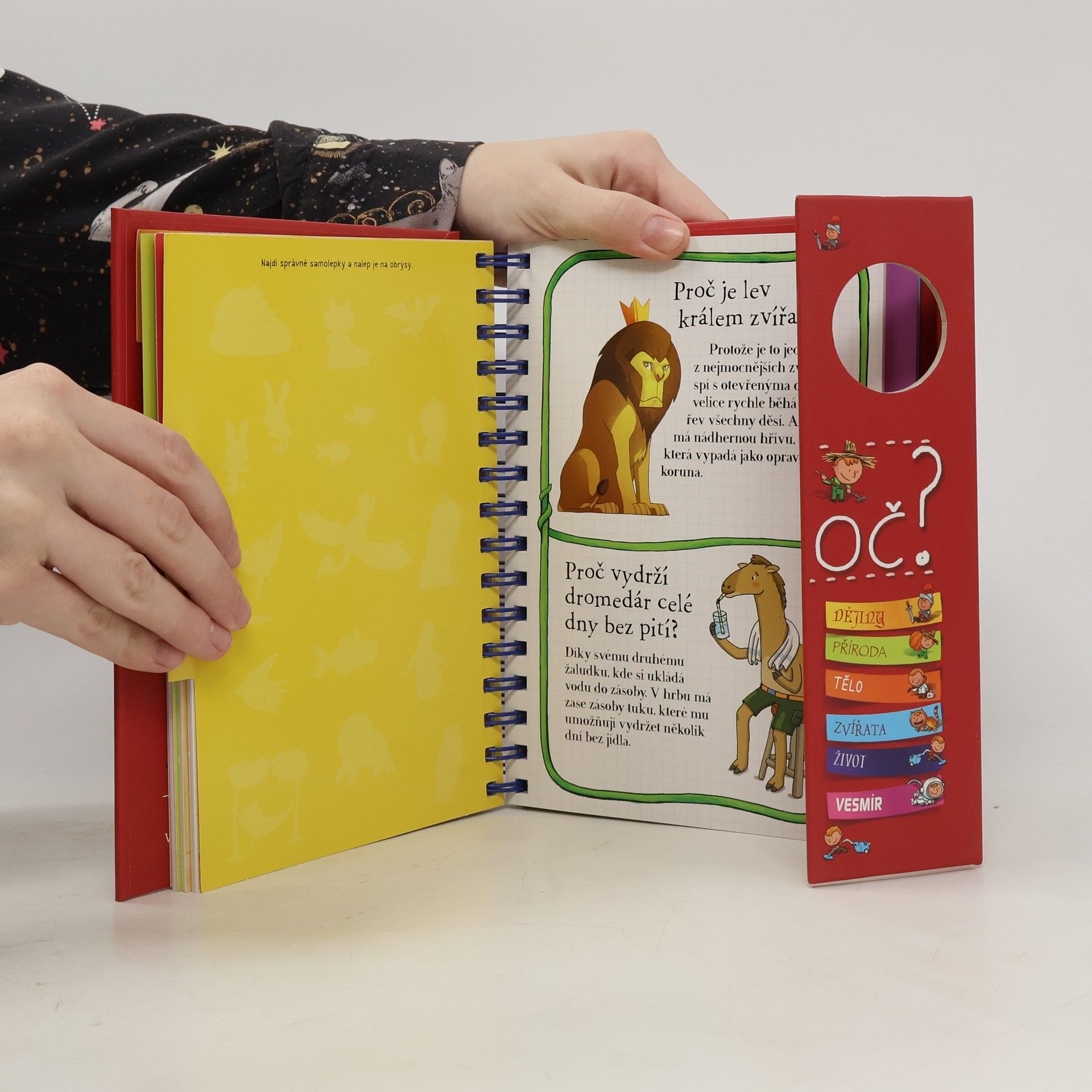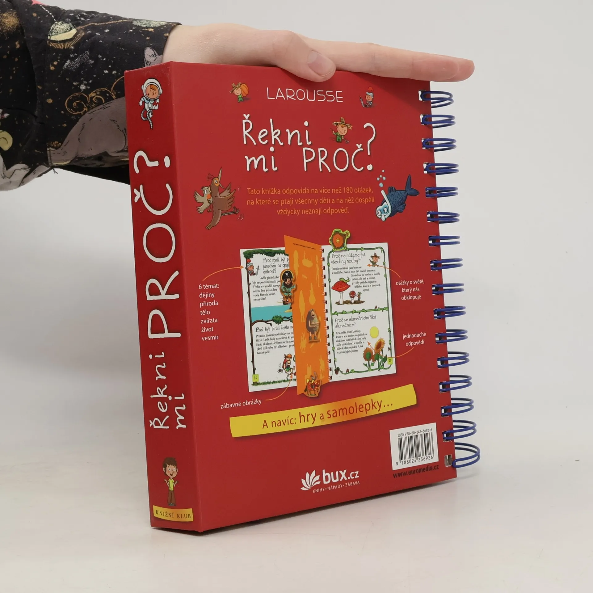 Knížka v kroužkové vazbě má 118 stránek a nacházejí se v ní odpovědi na 180 běžných dětských otázek. Jsou seřazené podle témat do šesti oblastí: dějiny, příroda, lidské tělo, zvířata, život a vesmír. Dozvíte se například, proč je nebe modré, proč Egypťané stavěli pyramidy, proč chodíme do školy, proč se potíme, proč kočky předou a spoustu, spoustu dalšího. Každou tematickou kapitolu navíc doplňují kvízy a samolepky.