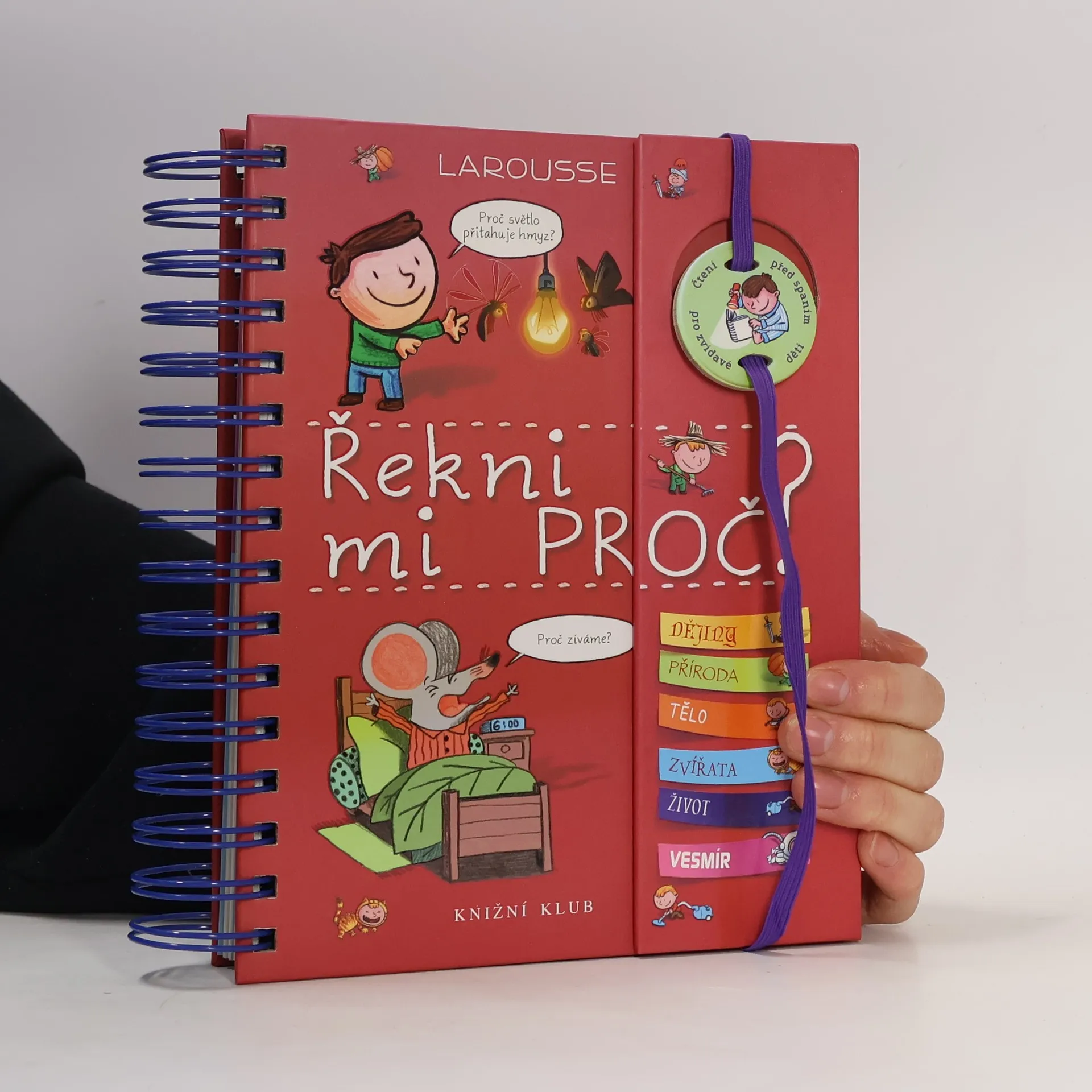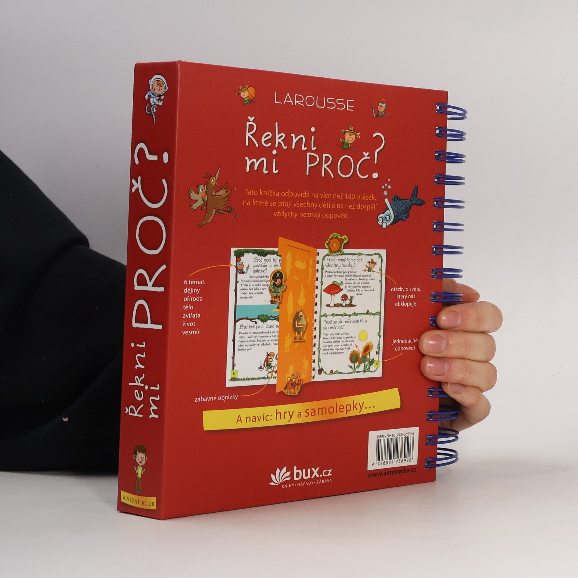 Knížka v kroužkové vazbě má 118 stránek a nacházejí se v ní odpovědi na 180 běžných dětských otázek. Jsou seřazené podle témat do šesti oblastí: dějiny, příroda, lidské tělo, zvířata, život a vesmír. Dozvíte se například, proč je nebe modré, proč Egypťané stavěli pyramidy, proč chodíme do školy, proč se potíme, proč kočky předou a spoustu, spoustu dalšího. Každou tematickou kapitolu navíc doplňují kvízy a samolepky.