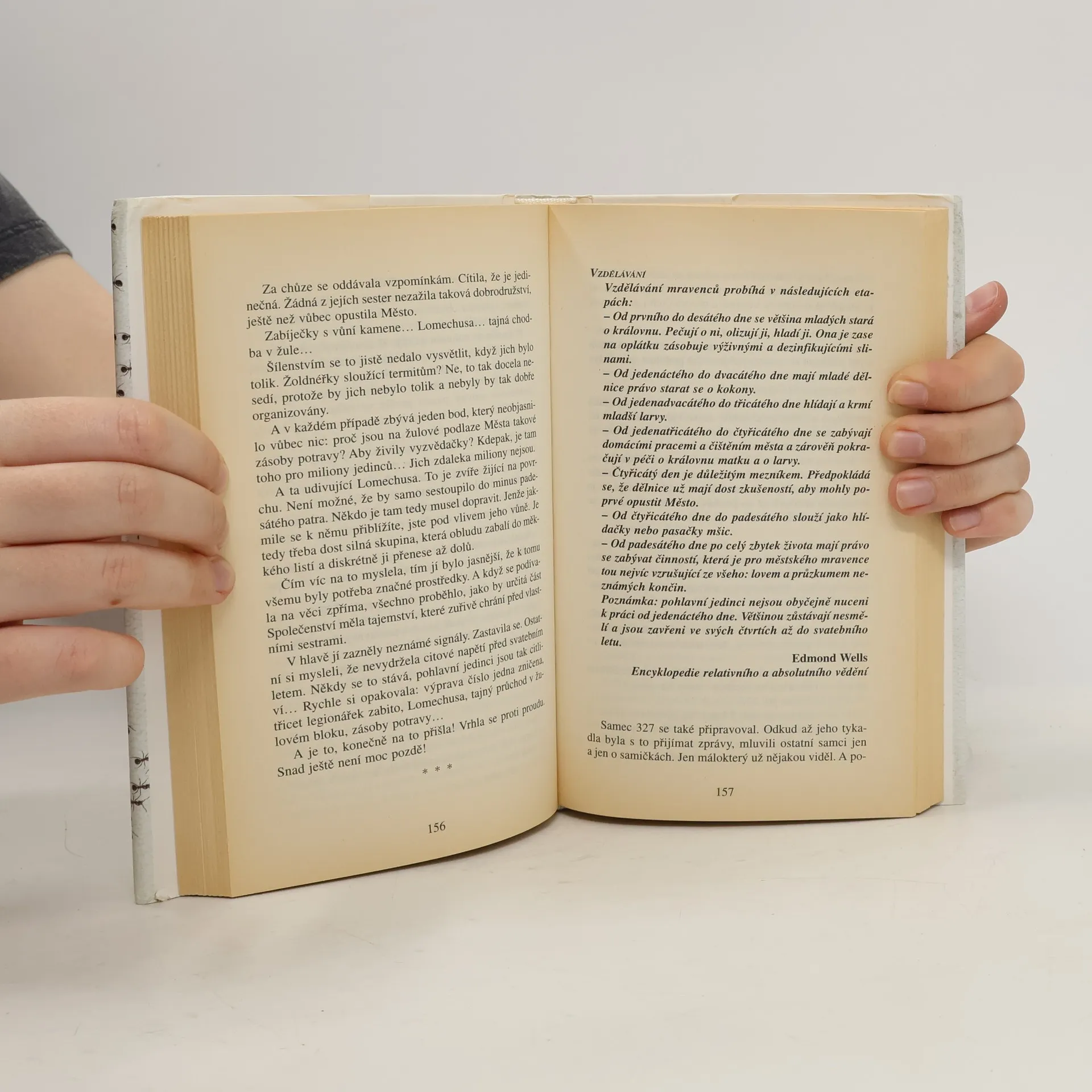 Dávejte pozor, kam šlapete! Během několika vteřin, které potřebujete k přečtení tohoto odstavce, se narodí 40 lidí… a 700 milionů mravenců. Malí, pro nás takřka neviditelní, a přesto úchvatní tvoři vytvořili od doby, kdy se před stovkou milionů let na Zemi objevili, zcela dokonalou a všestranně fungující civilizaci. Budují města a federace, bojují o území, společnými silami odrážejí útoky vetřelců a predátorů. Zakládají houbová políčka nebo mšičí farmy a svá hnízda dokážou utkat z listí. Vyznávají kastovní systém a některé druhy si otrokářským způsobem podrobují jiné. Přestože představivost lidí vždy s oblibou hledala paralelní světy po nejrůznějších koutech vesmíru, na fantastickou existenci těch, kteří žijí v poloskrytu pod našima nohama, se zapomínalo. Jsou mravenci anarchisté, roajalisté anebo se jejich organizace blíží totalitnímu zřízení? Jak chápou čas? Co o nich vlastně víme? A vědí oni o nás? Werberův román Mravenci bývá právem označován jako realistická sci-fi: to nejúžasnější je na něm právě to, co je skutečné. Po jeho přečtení už nikdy nebudete vnímat svět tak jako dosud - stejně jako hrdina knihy, nezaměstnaný pařížský zámečník Jonathan Wells, který po svém excentrickém strýci zdědil suterénní byt a tajemné varování: Hlavně nikdy nechoď do sklepa!