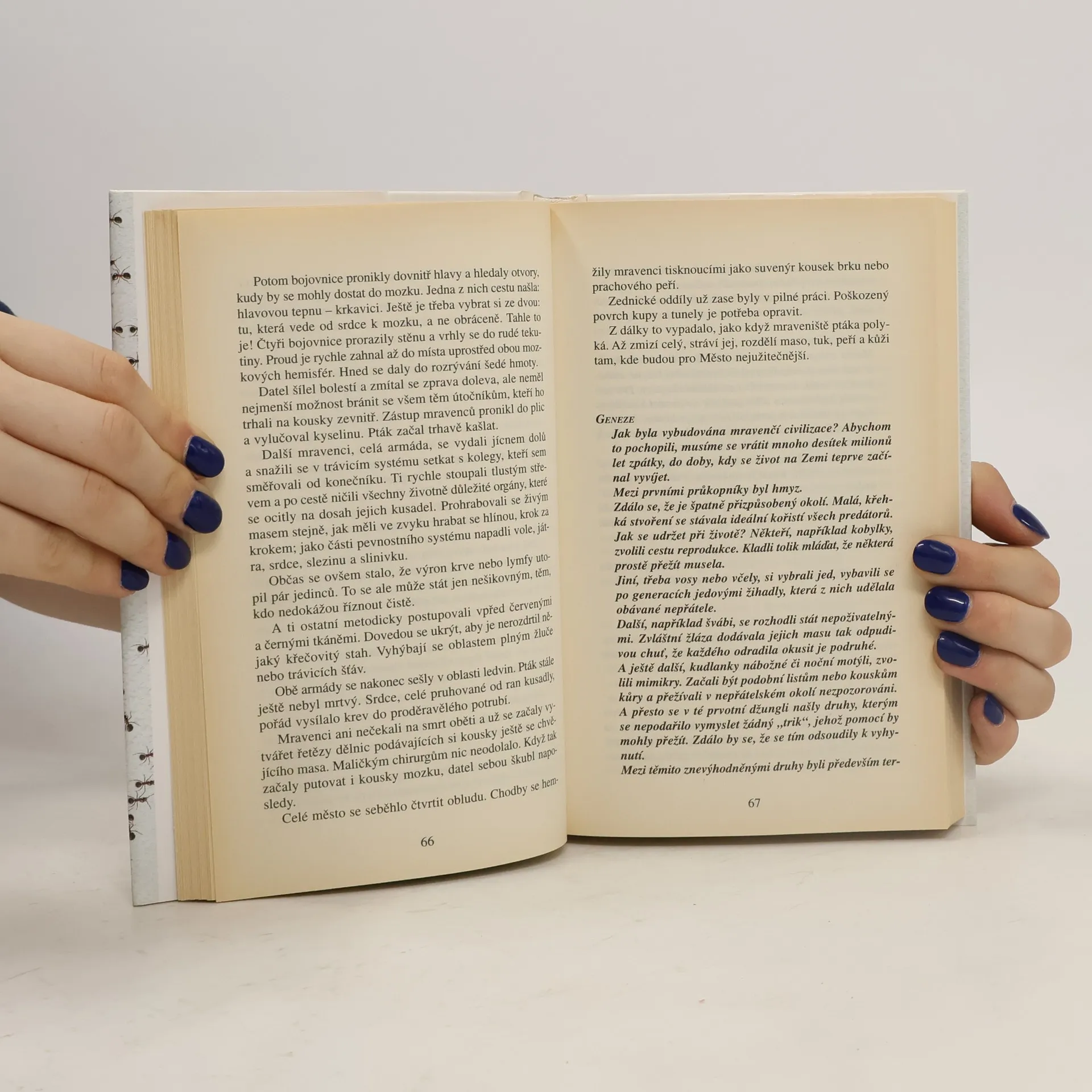 Dávejte pozor, kam šlapete! Během několika vteřin, které potřebujete k přečtení tohoto odstavce, se narodí 40 lidí… a 700 milionů mravenců. Malí, pro nás takřka neviditelní, a přesto úchvatní tvoři vytvořili od doby, kdy se před stovkou milionů let na Zemi objevili, zcela dokonalou a všestranně fungující civilizaci. Budují města a federace, bojují o území, společnými silami odrážejí útoky vetřelců a predátorů. Zakládají houbová políčka nebo mšičí farmy a svá hnízda dokážou utkat z listí. Vyznávají kastovní systém a některé druhy si otrokářským způsobem podrobují jiné. Přestože představivost lidí vždy s oblibou hledala paralelní světy po nejrůznějších koutech vesmíru, na fantastickou existenci těch, kteří žijí v poloskrytu pod našima nohama, se zapomínalo. Jsou mravenci anarchisté, roajalisté anebo se jejich organizace blíží totalitnímu zřízení? Jak chápou čas? Co o nich vlastně víme? A vědí oni o nás? Werberův román Mravenci bývá právem označován jako realistická sci-fi: to nejúžasnější je na něm právě to, co je skutečné. Po jeho přečtení už nikdy nebudete vnímat svět tak jako dosud - stejně jako hrdina knihy, nezaměstnaný pařížský zámečník Jonathan Wells, který po svém excentrickém strýci zdědil suterénní byt a tajemné varování: Hlavně nikdy nechoď do sklepa!