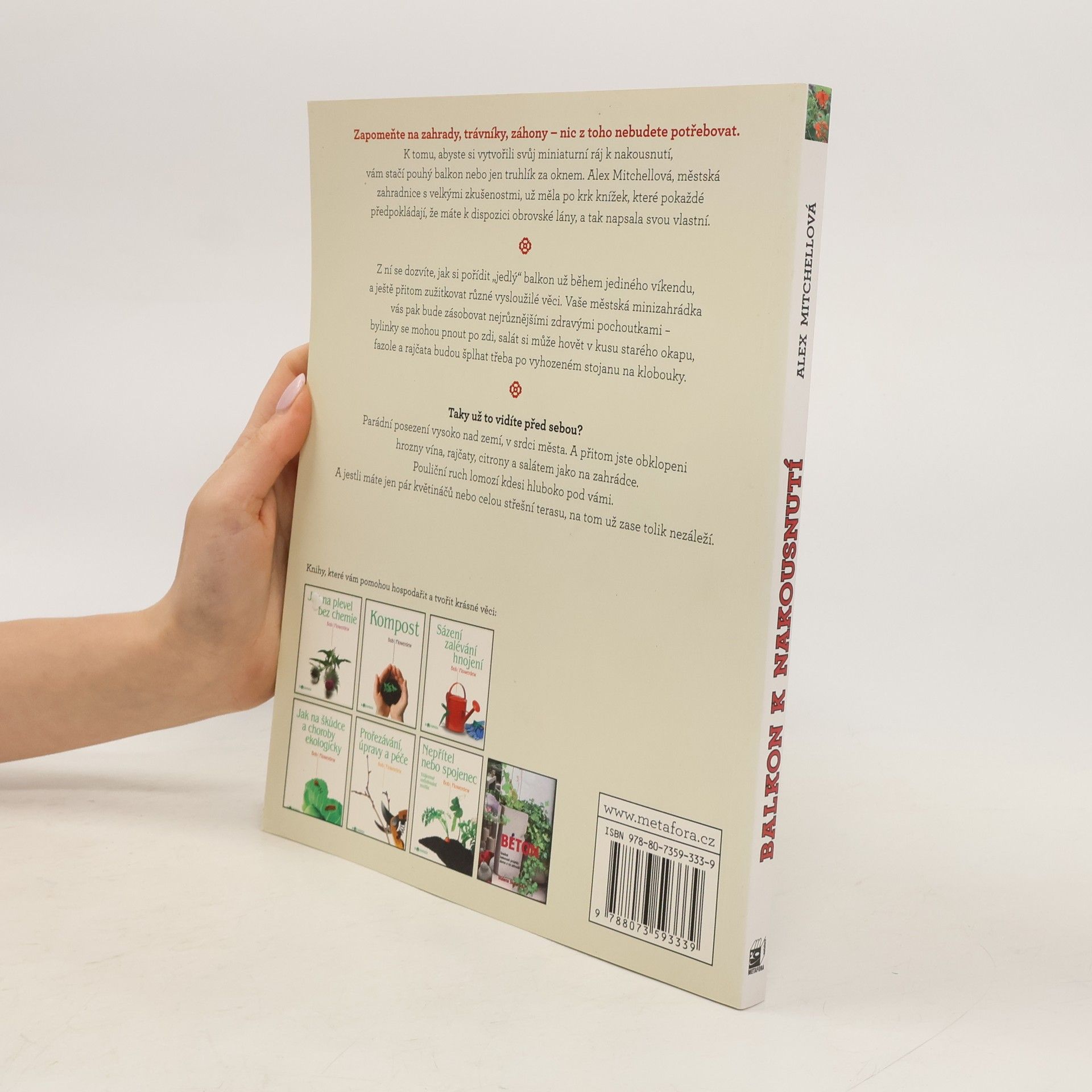 Jak vypěstovat čerstvé ovoce a zeleninu v srdci města… Zapomeňte na zahrady, trávníky, záhony – nic z toho nebudete potřebovat. K tomu, abyste si vytvořili svůj miniaturní ráj k nakousnutí, vám stačí pouhý balkon nebo jen truhlík za oknem. Alex Mitchellová, městská zahradnice s velkými zkušenostmi, už měla po krk knížek, které pokaždé předpokládají, že máte k dispozici obrovské lány, a tak napsala svou vlastní. Z ní se dozvíte, jak si pořídit „jedlý“ balkon už během jediného víkendu, a ještě přitom zužitkovat různé vysloužilé věci. Vaše městská minizahrádka vás pak bude zásobovat nejrůznějšími zdravými pochoutkami – bylinky se mohou pnout po zdi, salát si může hovět v kusu starého okapu, fazole a rajčata budou šplhat třeba po vyhozeném stojanu na klobouky. Taky už to vidíte před sebou? Parádní posezení vysoko nad zemí, v srdci města, a přitom jste obklopeni hrozny vína, rajčaty, citrony a salátem jako na zahrádce. Pouliční ruch lomozí kdesi hluboko pod vámi. A jestli máte jen pár květináčů nebo celou střešní terasu, na tom už zase tolik nezáleží.