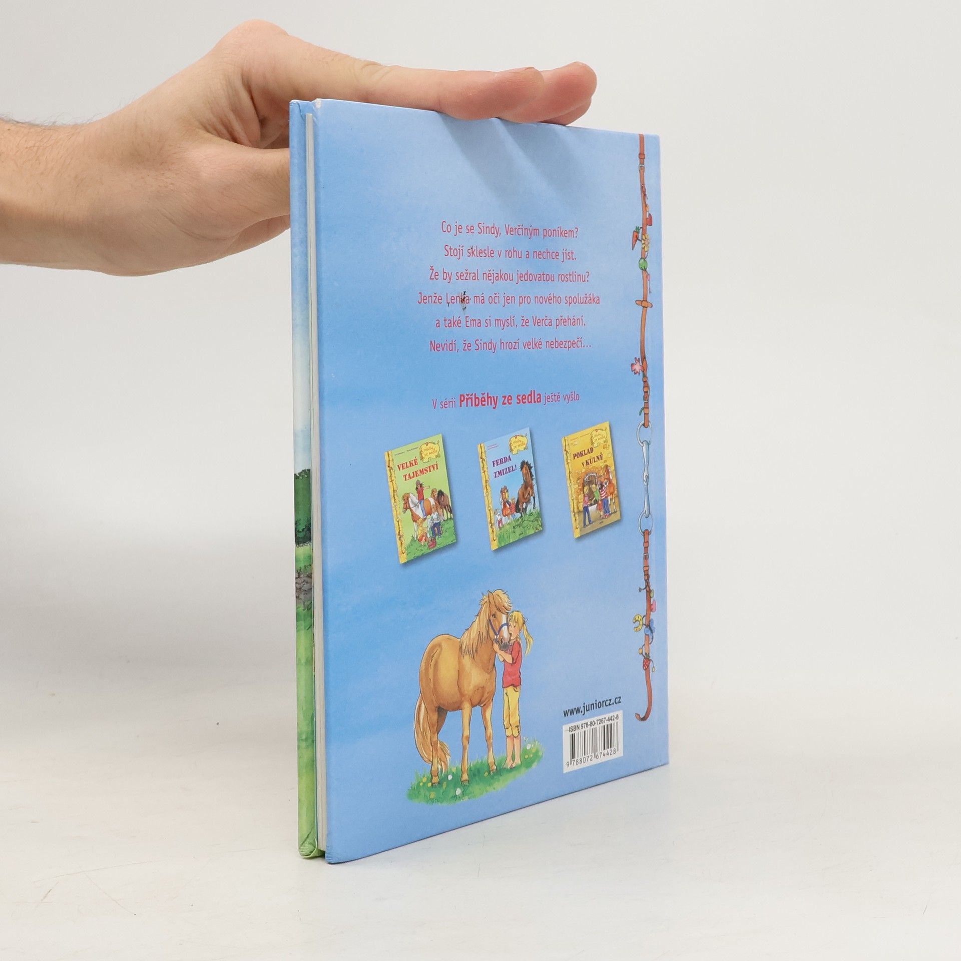 V sérii Příběhy ze sedla vychází povídání o třech holkách a jejich zvířecích kamarádech. Co je se Sindy, Verčiným poníkem? Stojí sklesle v rohu a nechce jíst. Že by sežral nějakou jedovatou rostlinu? Jenže Lenka má oči jen pro nového spolužáka a také Ema si myslí, že Verča přehání. Nevidí, že Sindy hrozí velké nebezpečí…
