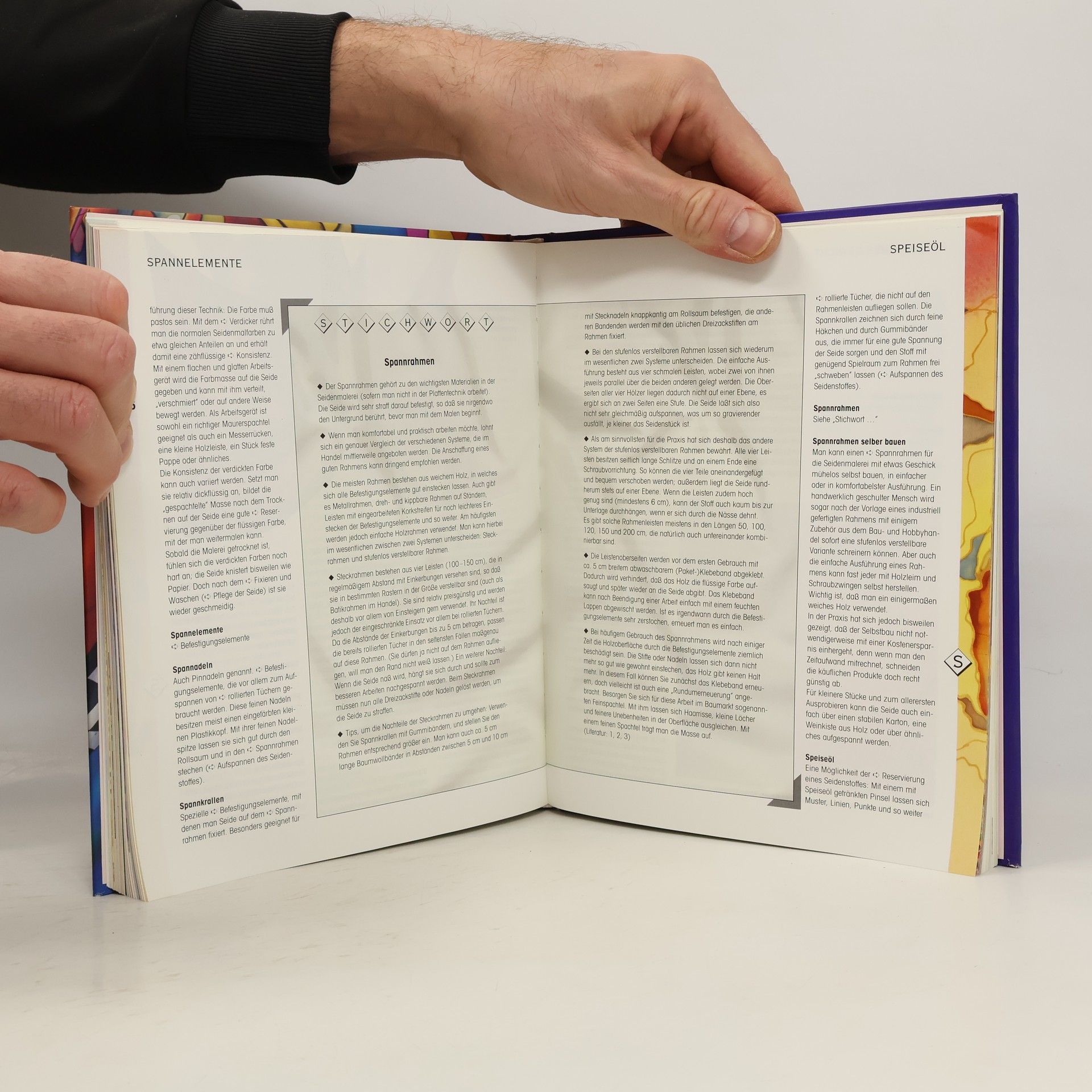 Ecken und Kanten leicht berieben, Buch befindet sich in einem sehr gutem Zustand, sauber und ordentlich Das erste Lexikon der Seidenmalerei informiert Hobbykünstler und Profis umfassend über alle Techniken und Themen. - rund 600 Stichwörter mit viele Querverweise : Kompaktwissen von A bis Z - über 190 Farbfotos auf 208 Seiten - zusätzlicher Praxisteil mit Planungshilfen - Sonderkapitel zu Planung und Durchführung von Seidenmalkursen - Mit großer herausnehmbarer aus wenigen Grundfarben entstehen so über 400 Farbtöne - Anregender Galerieteil – 14 Künstlerinnen präsentieren ihre Werke