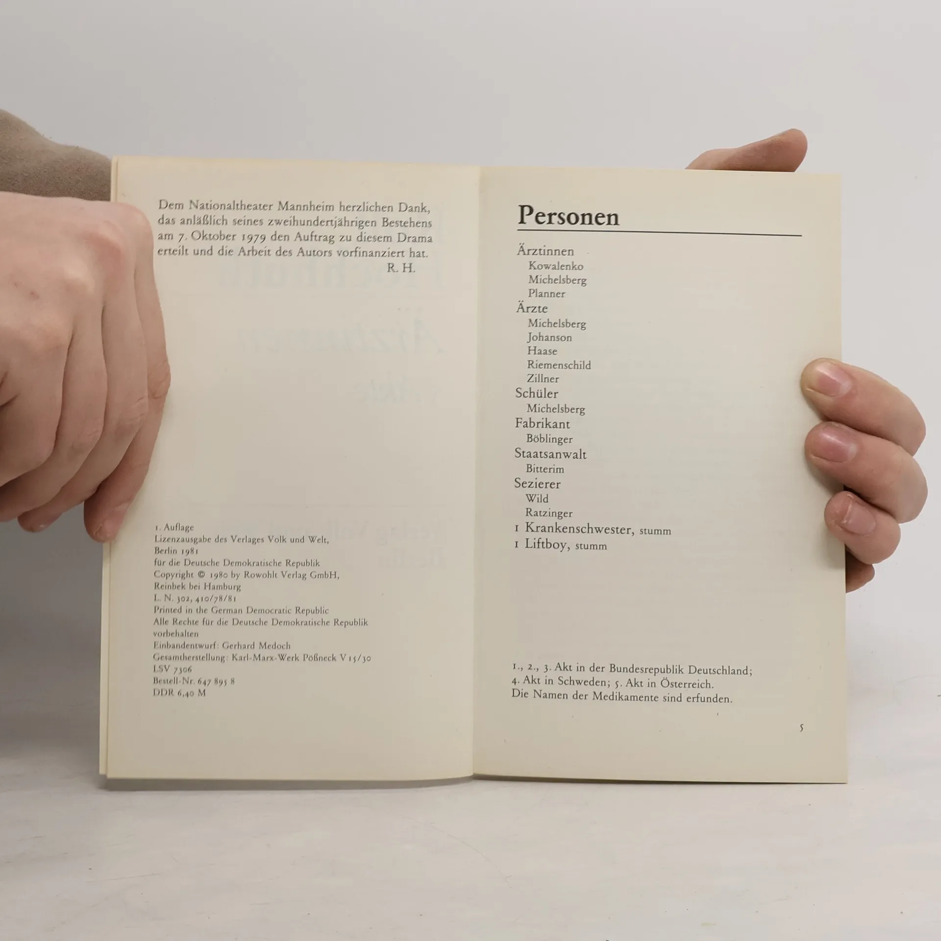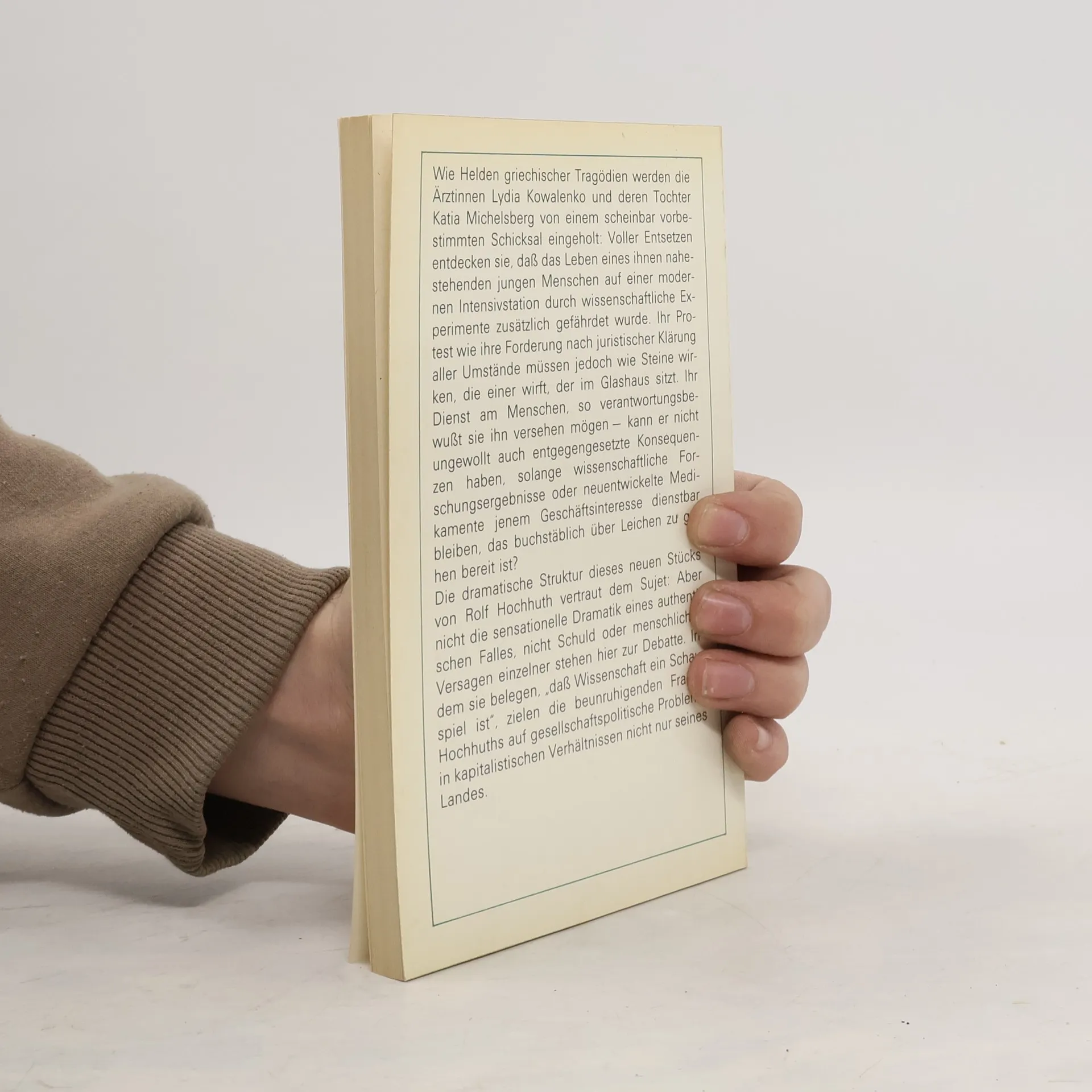 Systembedingte Übelstände in der pharmazeutischen Forschung werden in der Öffentlichkeit besorgt diskutiert. Sie sind auch das Thema von Rolf Hochhuths brisantem Theaterstück. Wie kommen die klinischen Erprobungen neuer Medikamente und ihre oft voreiligen Resultate zustande, und hat dabei die Genesung der Patienten den Vorrang vor der Verteidigung von Marktpositionen ? Zwei Ärztinnen, Mutter und Tochter, stehen im Mittelpunkt des Stücks. Ihre Schuld stürzt die beiden Frauen am Ende in einen unlösbaren Konflikt, dessen Opfer der siebzehnjährige Sohn und Enkel wird.