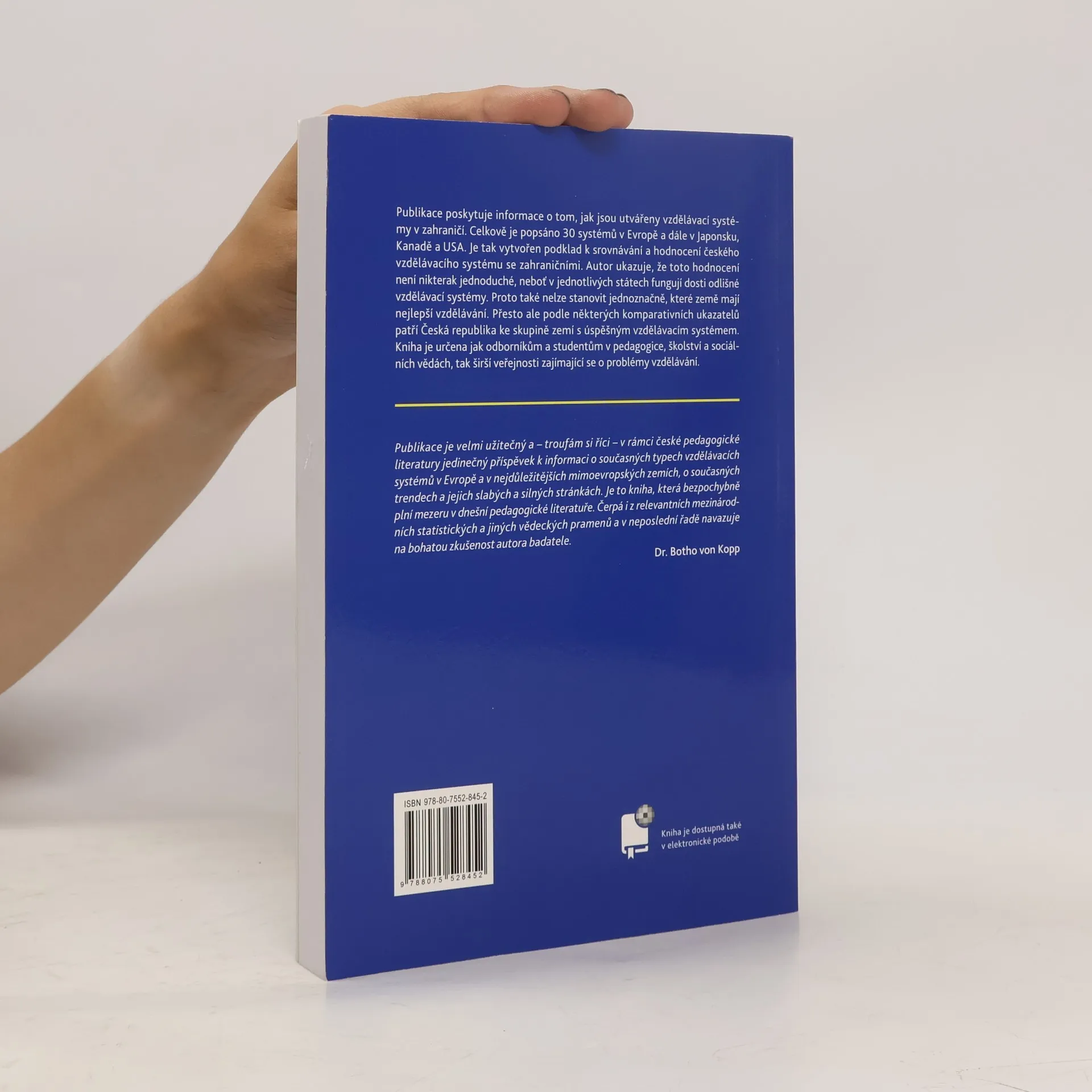 Ojedinělá publikace prof. Jana Průchy, významné postavy české pedagogiky, přináší encyklopedický přehled vzdělávacích systémů v 30 evropských zemích, Japonsku, Kanadě a USA. Text je přehledný, systematický a srozumitelný, což umožňuje čtenářům lépe porozumět různorodosti vzdělávacích přístupů v zahraničí. Autor vytvořil unikátní základ pro srovnání českého vzdělávacího systému s těmi zahraničními, přičemž zdůrazňuje, že hodnocení není jednoduché kvůli odlišnostem jednotlivých systémů. I když nelze jednoznačně určit, které země mají nejlepší vzdělávání, Česká republika se podle některých komparativních ukazatelů řadí mezi úspěšné systémy. Publikace je určena odborníkům, studentům pedagogiky, školství a sociálních věd, ale také širší veřejnosti se zájmem o vzdělávání. Je považována za jedinečný příspěvek k informacím o současných typech vzdělávacích systémů a trendech v Evropě a mimoevropských zemích. Čerpá z mezinárodních statistických a vědeckých zdrojů a navazuje na bohatou zkušenost autora.