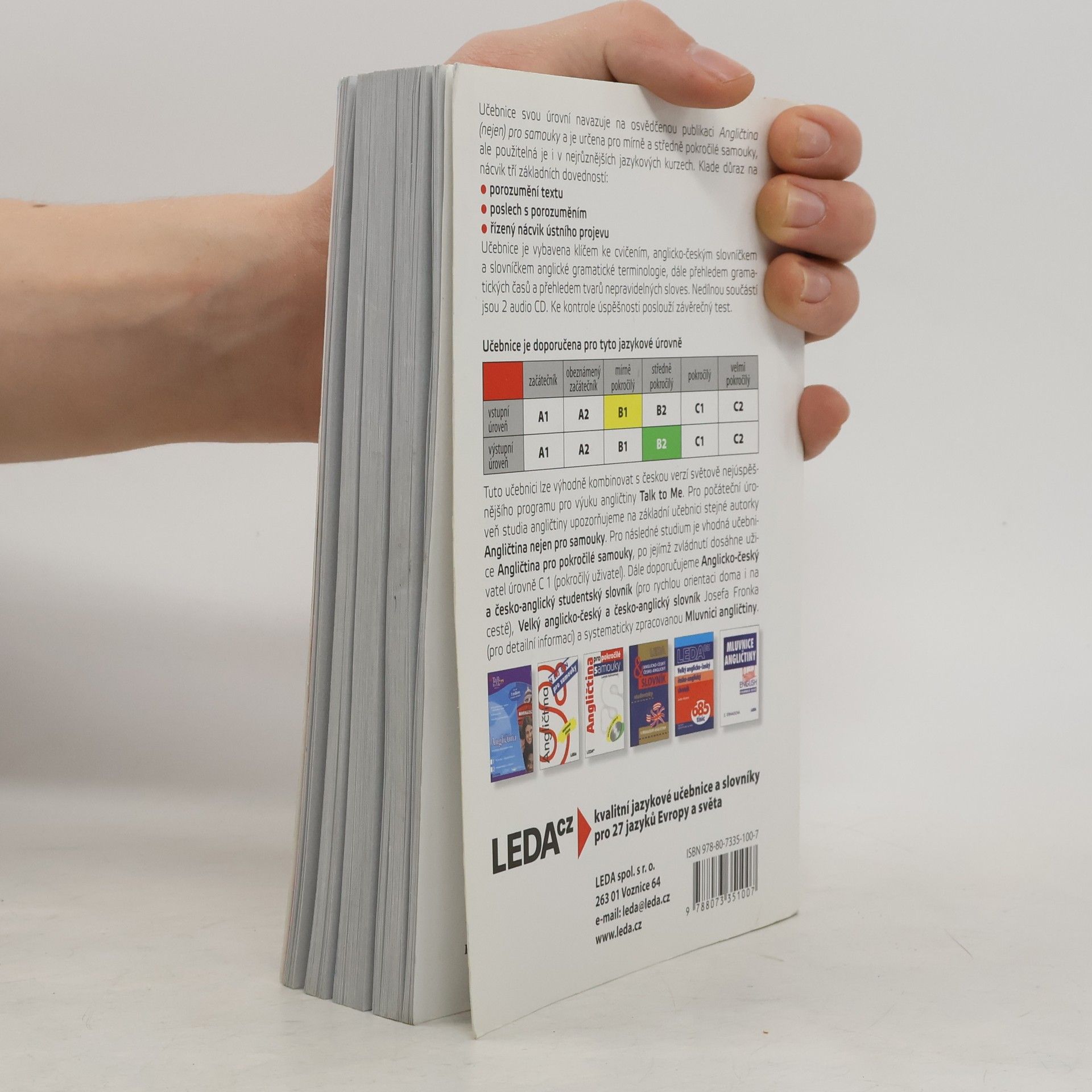 Učebnice, která svou úrovní navazuje na osvědčenou publikaci Angličtina (nejen) pro samouky, je určena nejen samoukům, ale je použitelná i v nejrůznějších anglických kurzech. Učebnice je zaměřena na nácvik tří základních dovedností – porozumění textu, poslech s porozuměním a řízený nácvik ústního projevu na takové úrovni, která uživatelům po zvládnutí učiva zaručí dosažení stupně pokročilosti B2 podle doporučení Rady Evropy. Součástí učebnice je klíč ke cvičením, anglicko-český slovníček a slovníček anglické gramatické terminologie.
