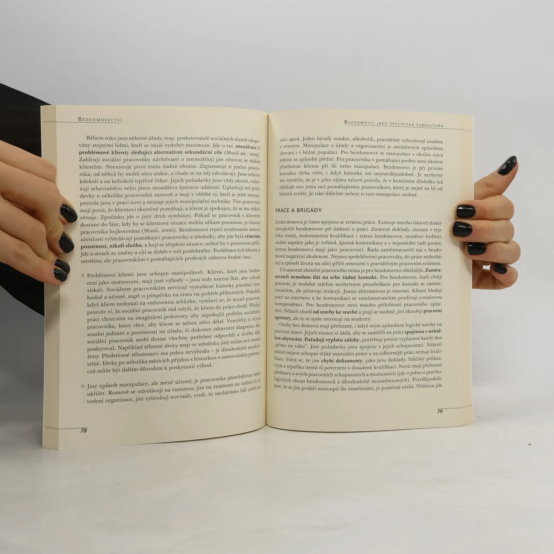 Publikace zkoumá bezdomovectví jednotlivců v České republice, definuje ho a uvádí jeho příčiny a specifika. Bezdomovectví pojímá jako souhrn patologických jevů, tj. nezaměstnanosti, závislosti, psychické poruchy, rozpadu rodiny apod., a dává ho do psychologických souvislostí, jako je adaptace člověka na dlouhodobý stres v různých vývojových etapách života. Nechybí kapitoly o práci s bezdomovci v terénním programu i v nízkoprahových centrech a kazuistiky dokumentující rozmanitost práce s těmito jedinci. Kniha je určena pro sociální a terénní pracovníky i pro širší veřejnost. Autoři dlouhodobě pracují v neziskové organizaci Naděje, o. s., která se v Praze zabývá prací s bezdomovci.