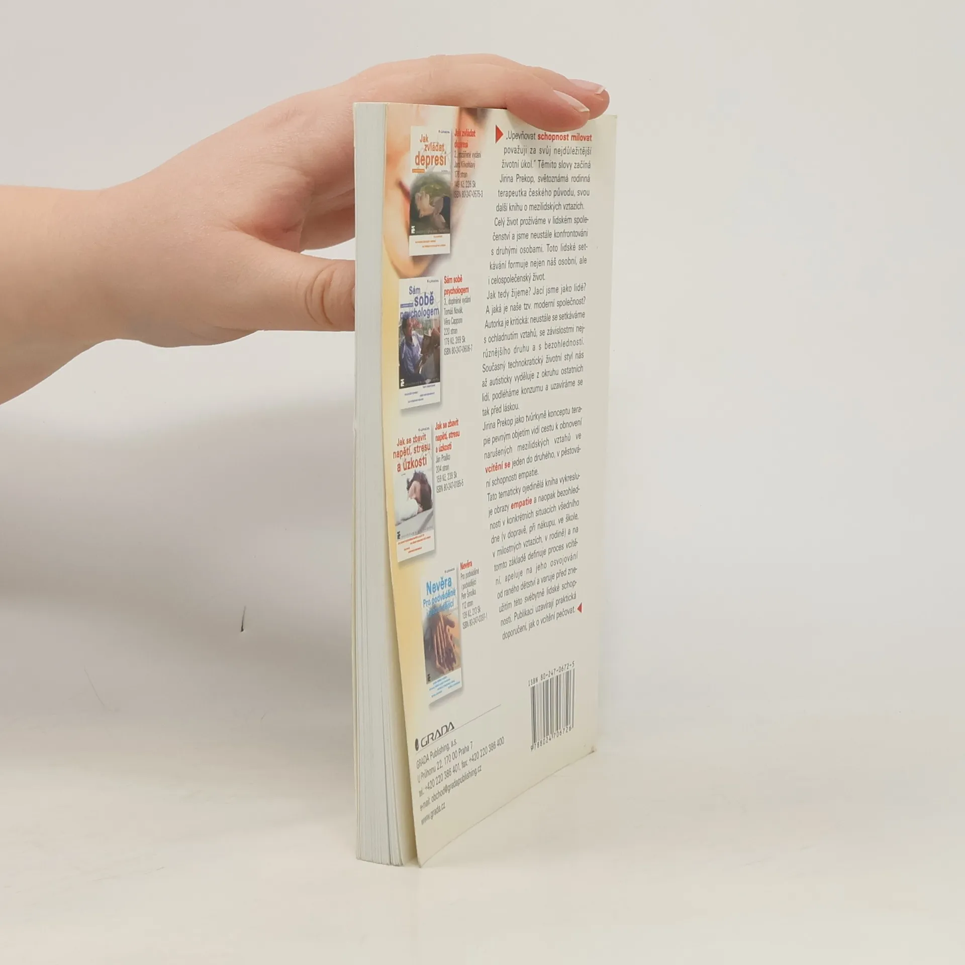 Známá psycholožka českého původu působící dlouhá léta na dětské klinice ve Stuttgartu ukazuje pomocí četných příkladů typických i pro české prostředí, jak v mnoha oblastech našeho každodenního života narážíme na chybějící schopnost empatie. Analyzuje, čím může být vzájemná ohleduplnost posilována, jakým způsobem ji může být u druhých dosaženo. Jirina Prekop jako tvůrkyně konceptu terapie pevným objetím vidí cestu k obnovení narušených mezilidských vztahů ve vcítění se jeden do druhého, v pěstování schopnosti empatie. Tato tematicky ojedinělá kniha vykresluje obrazy empatie a naopak bezohlednosti v konkrétních situacích všedního dne (v dopravě, při nákupu, ve škole, v milostných vztazích, v rodině) a na tomto základě definuje proces vcítění, apeluje na jeho osvojování od raného dětství a varuje před zneužitím této svébytně lidské schopnosti. Publikaci uzavírají praktická doporučení, jak o vcítění pečovat.